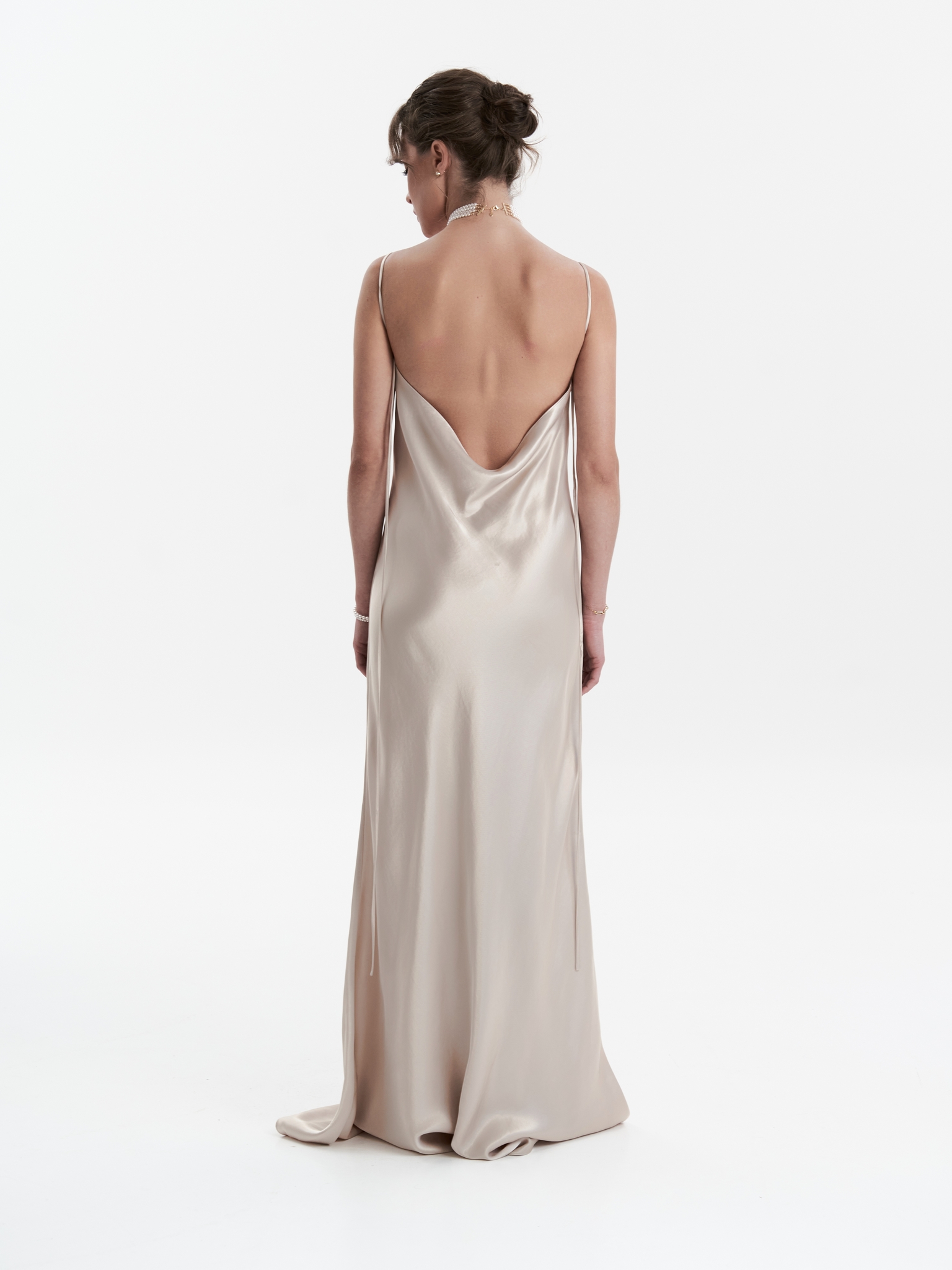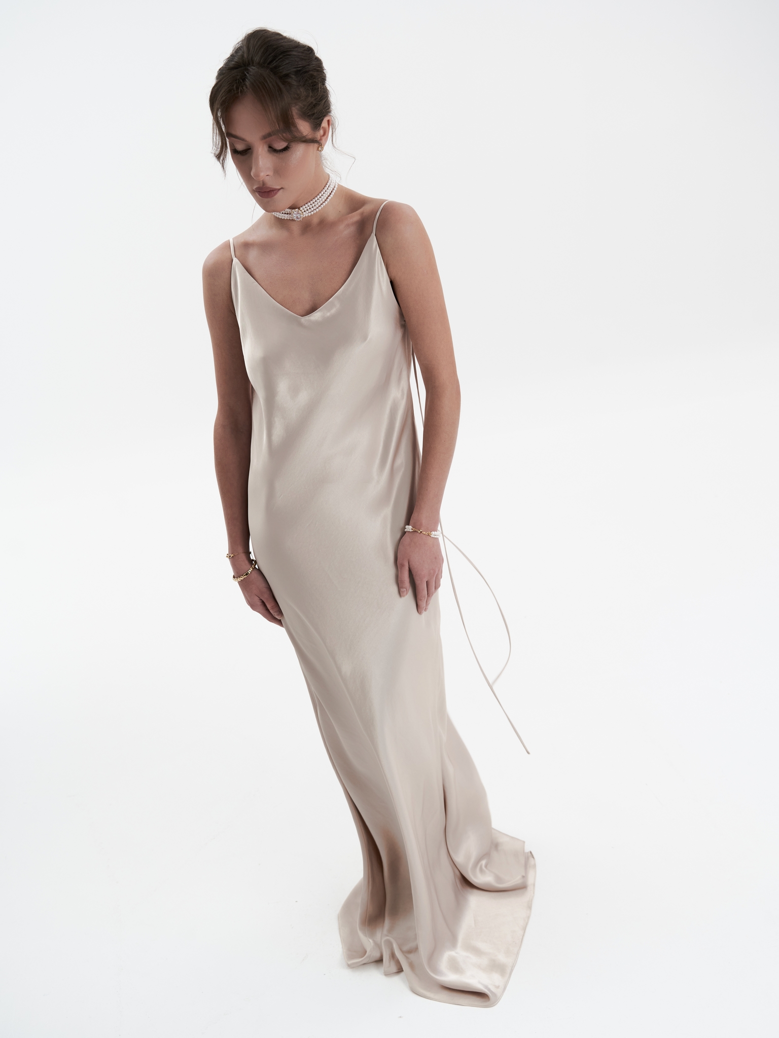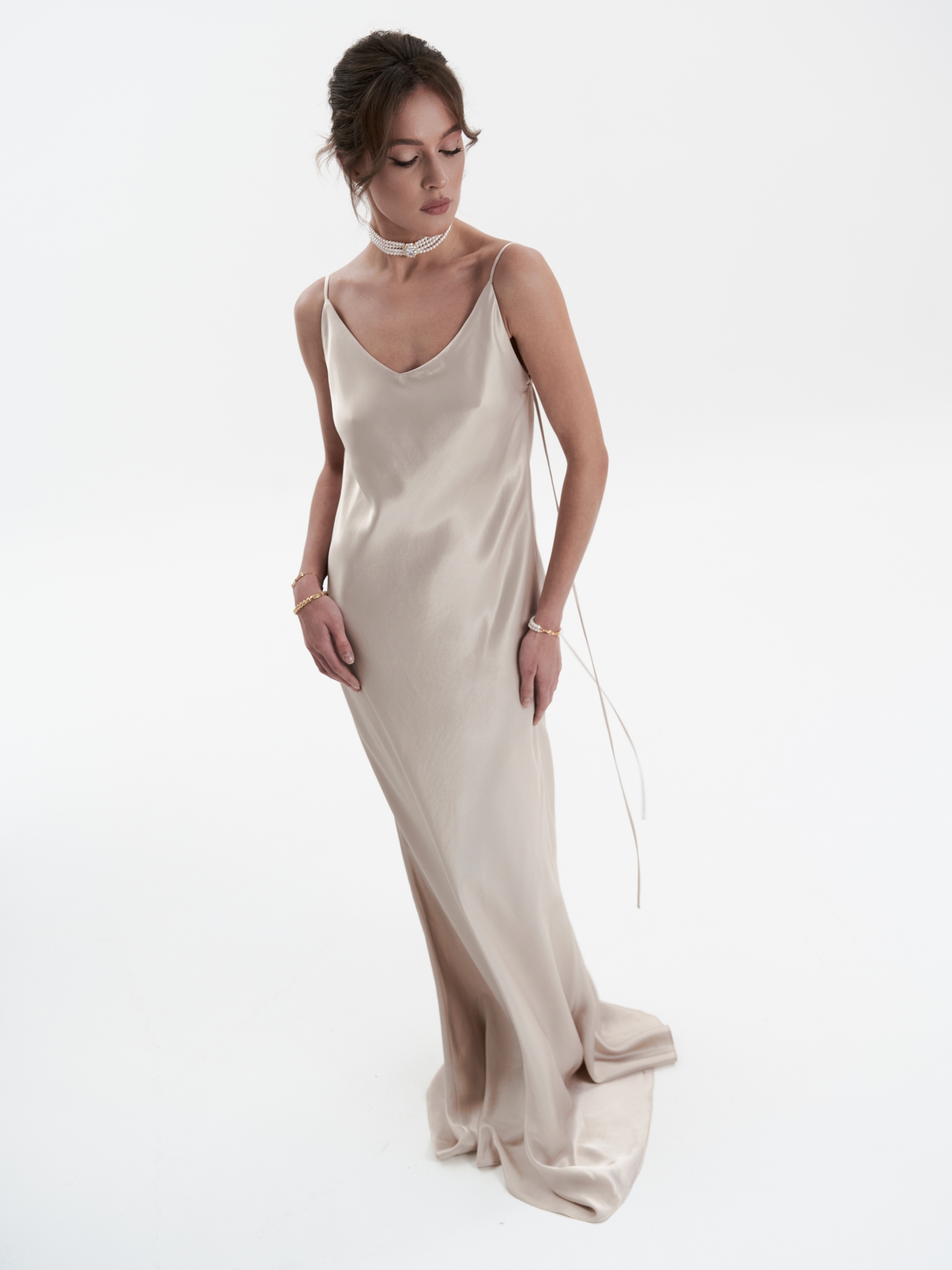 Это потрясающее бежевое платье с открытой спинкой — идеальный выбор для тех, кто хочет выделиться на любом мероприятии. Уникальный дизайн с открытой спинкой добавляет нотку соблазнительности и делает платье особенно привлекательным. Платье словно обнимает фигуру в верхней части, что создает изысканный и утонченный силуэт. Этот крой подходит для различных типов фигур, подчеркивая достоинства и скрывая недостатки. Это платье станет отличным выбором для вечерних мероприятий, свадеб или коктейльных вечеринок.