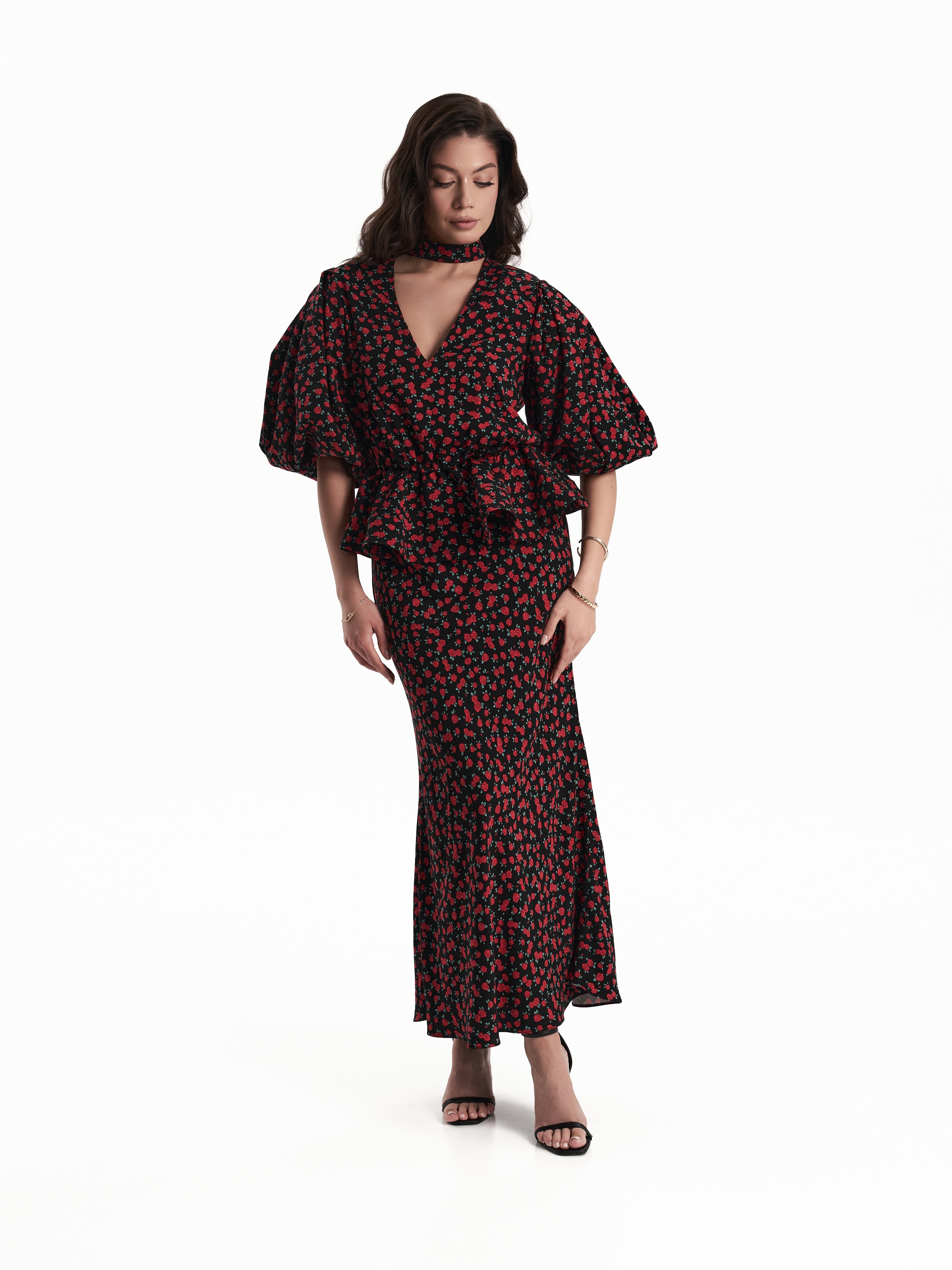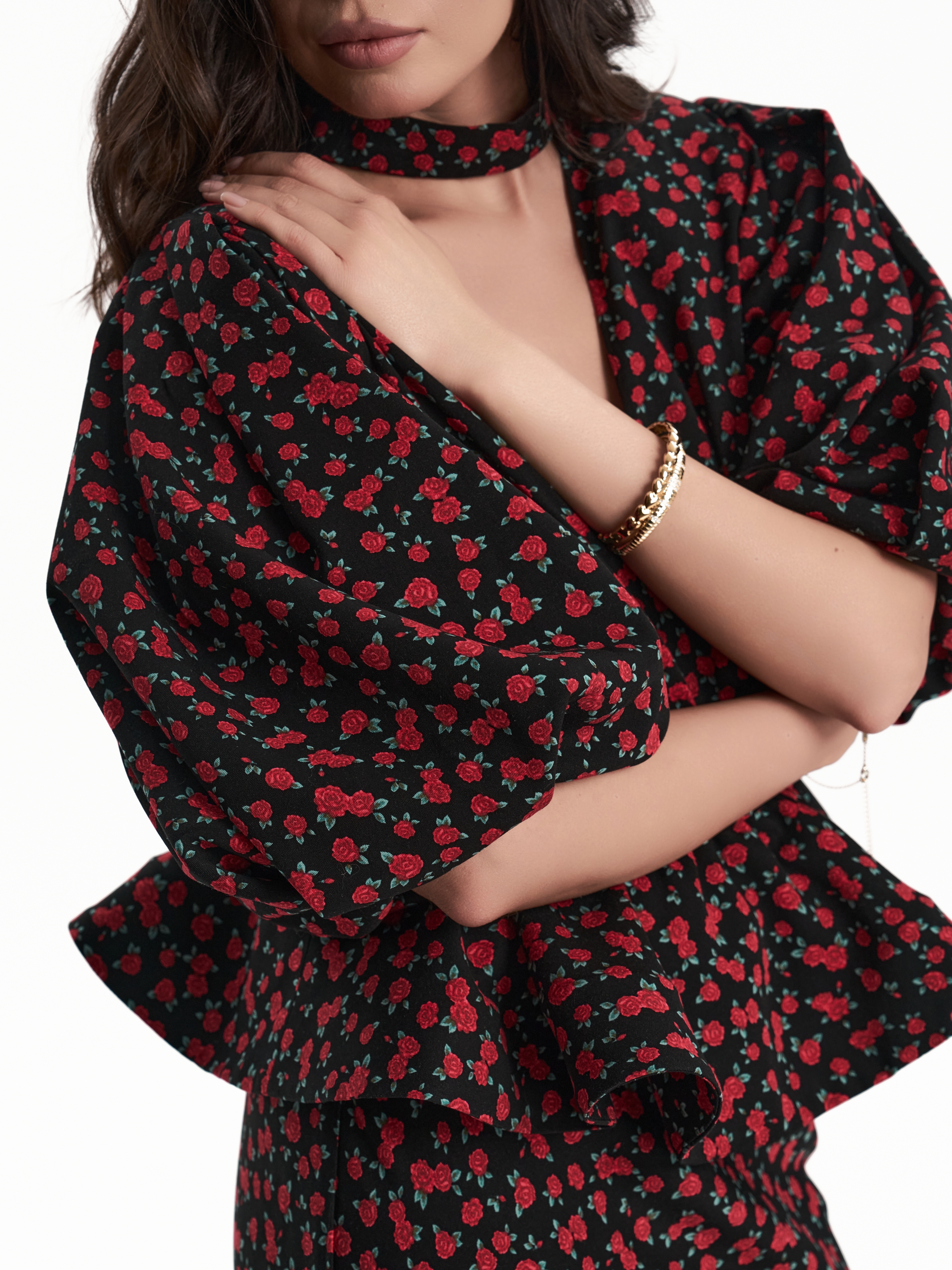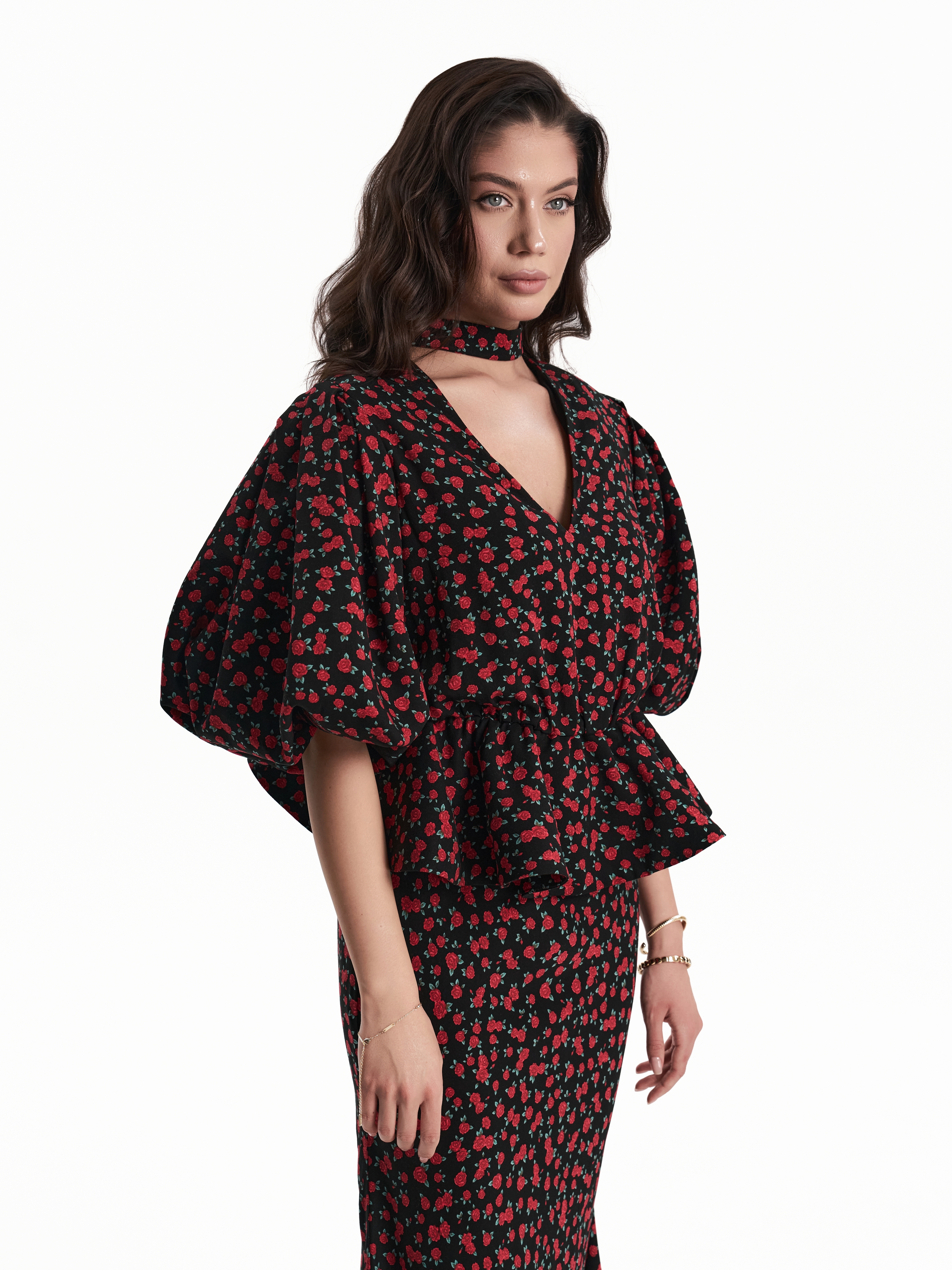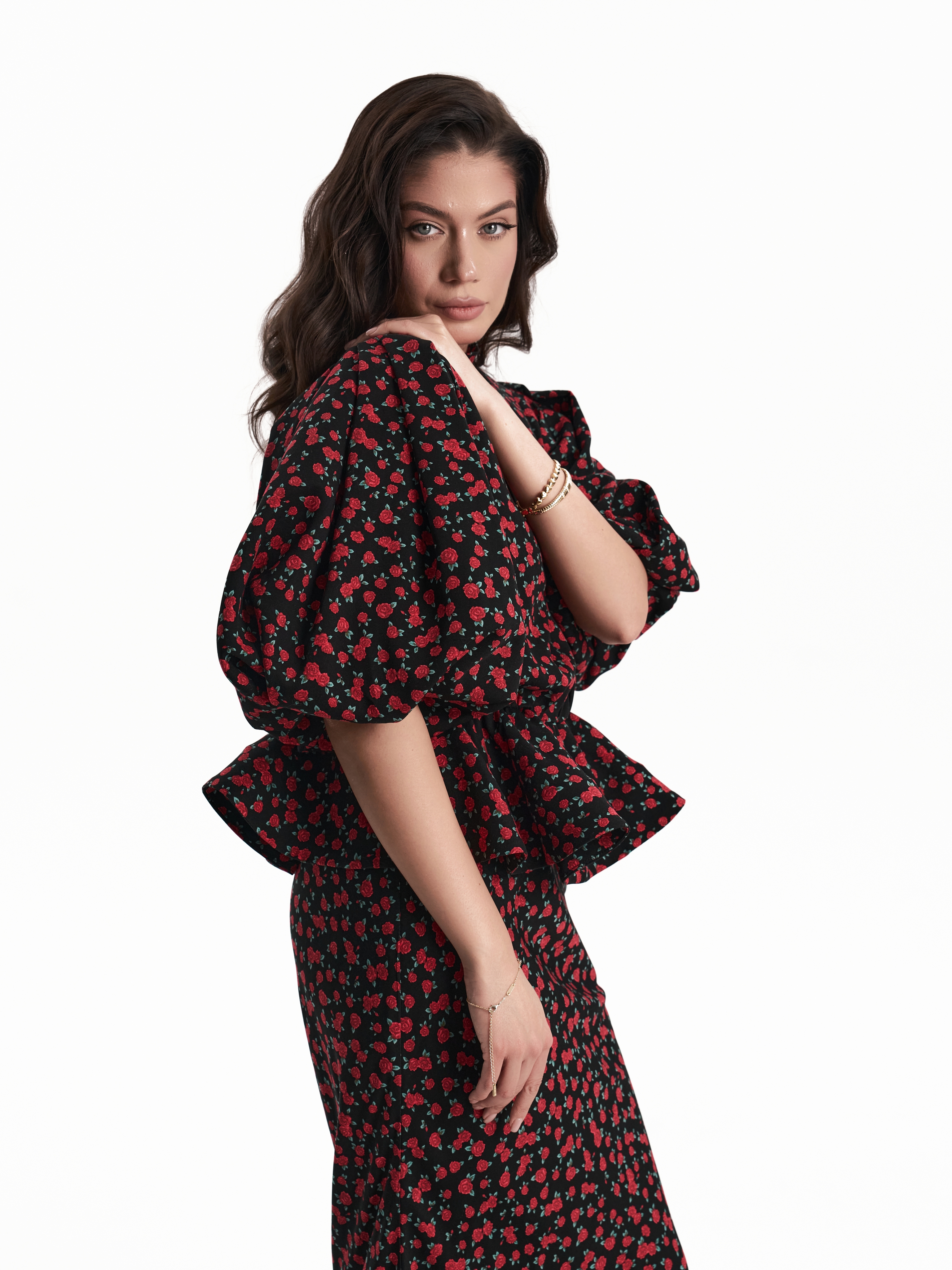 Блузка выполнена из легкой ткани черного цвета с принтом яркими красными розами. Имеет объемные укороченные рукава с легкой сборкой, которые добавляют романтический акцент образу. Глубокий V-образный вырез украшает область декольте, а приталенный силуэт подчеркивается поясом на талии. Нижняя часть дополнена аккуратной баской, придающей изделию женственность и элегантность. Блузка сочетает современный стиль с нотками винтажной эстетики, идеально подходит для прогулок или повседневных образов.