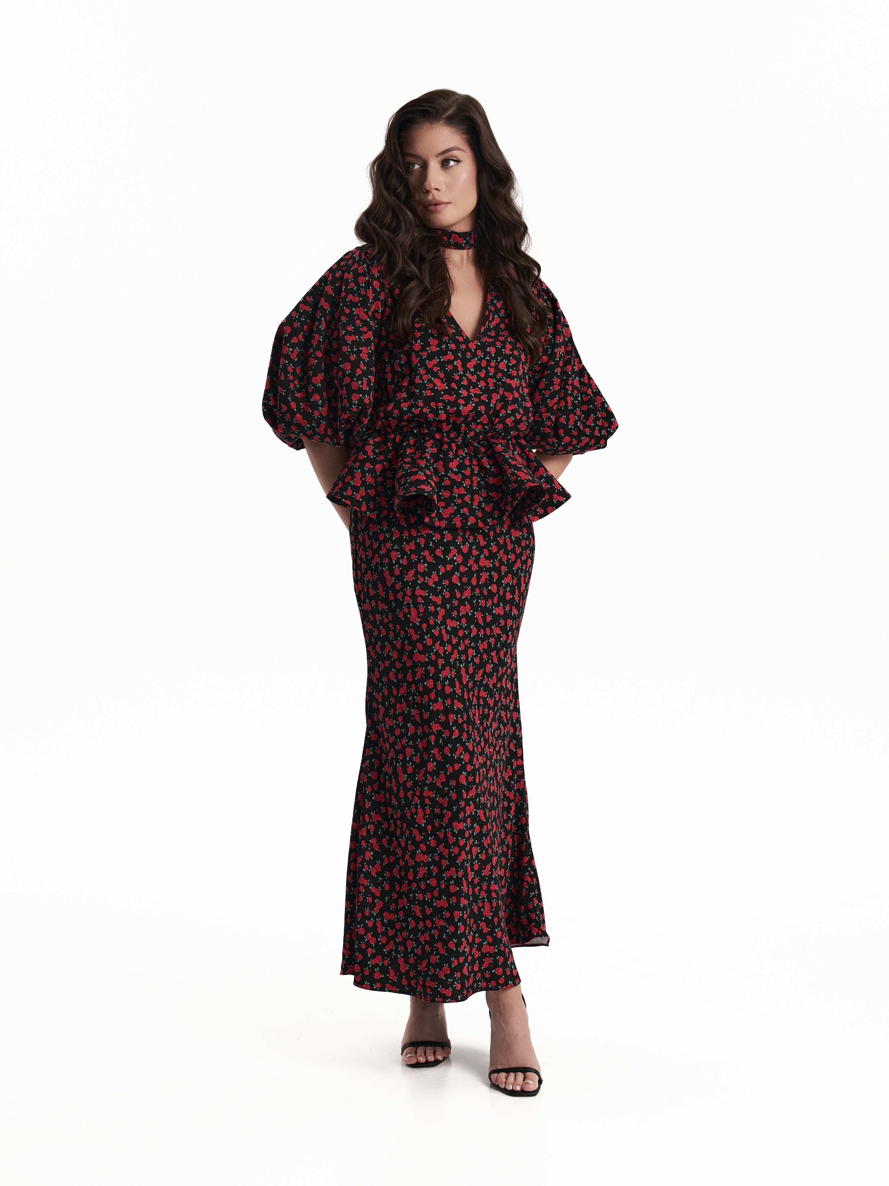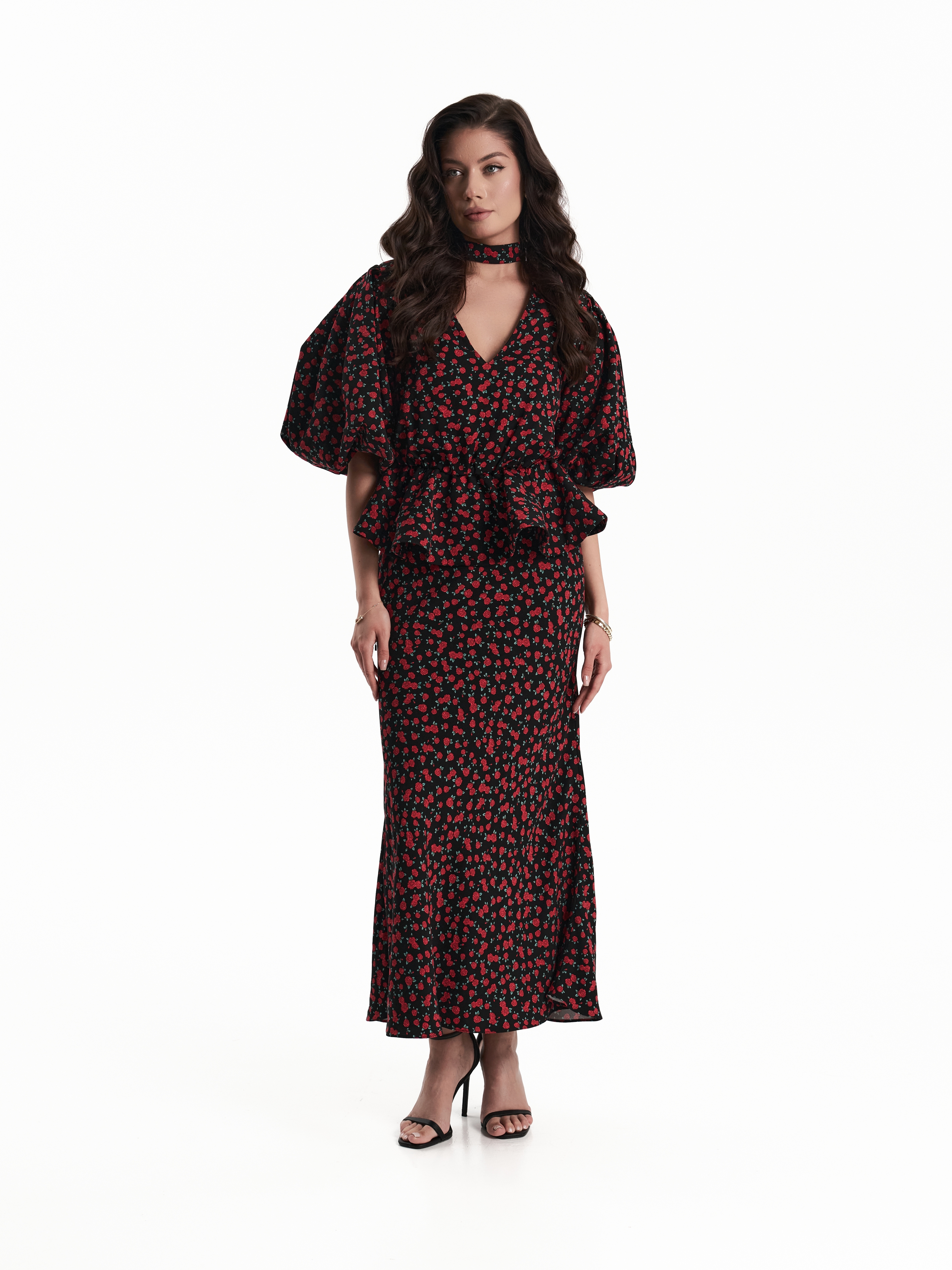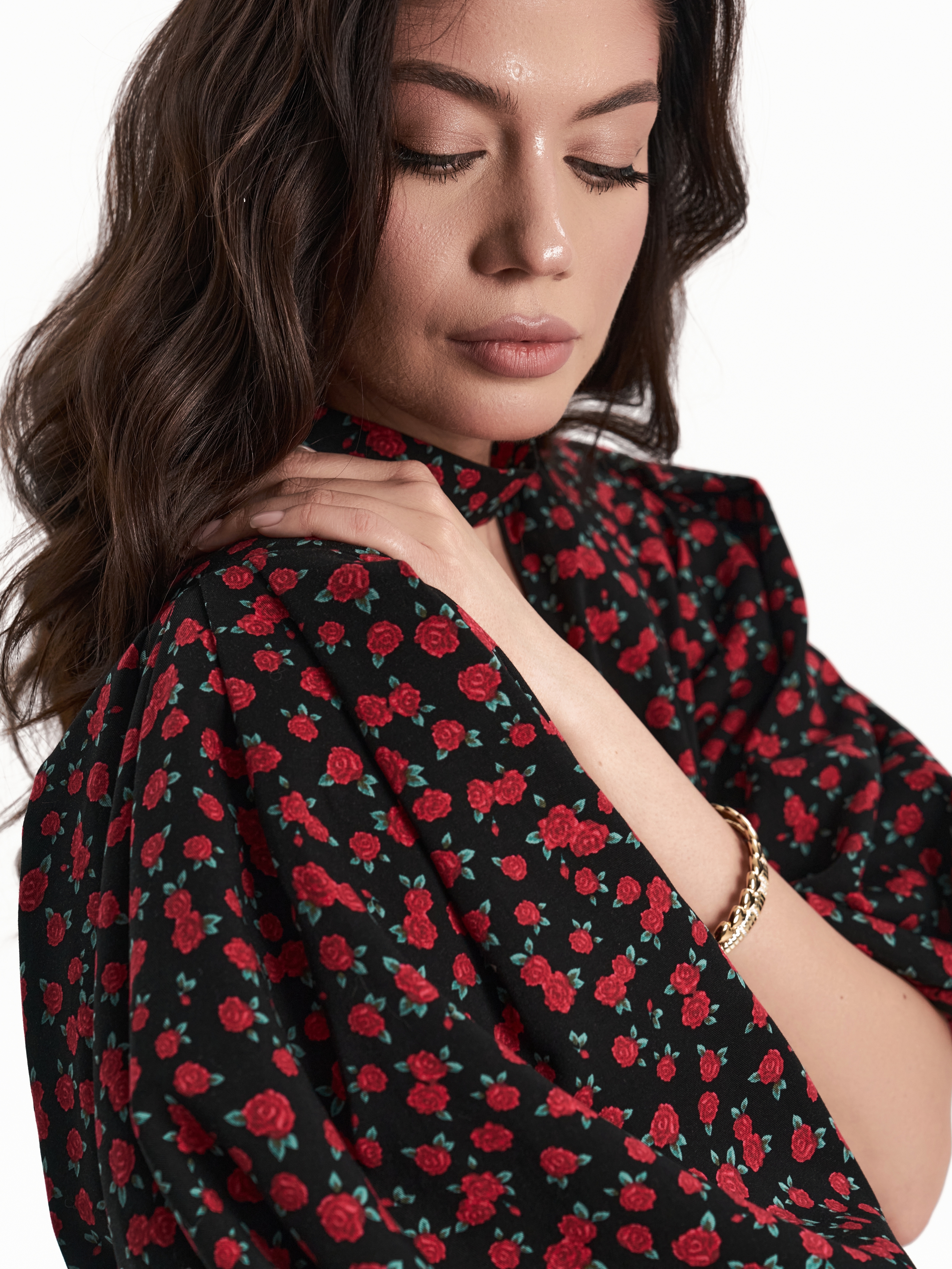 Блузка выполнена из легкой ткани черного цвета с принтом яркими красными розами. Имеет объемные укороченные рукава с легкой сборкой, которые добавляют романтический акцент образу. Глубокий V-образный вырез украшает область декольте, а приталенный силуэт подчеркивается поясом на талии. Нижняя часть дополнена аккуратной баской, придающей изделию женственность и элегантность. Блузка сочетает современный стиль с нотками винтажной эстетики, идеально подходит для прогулок или повседневных образов.
