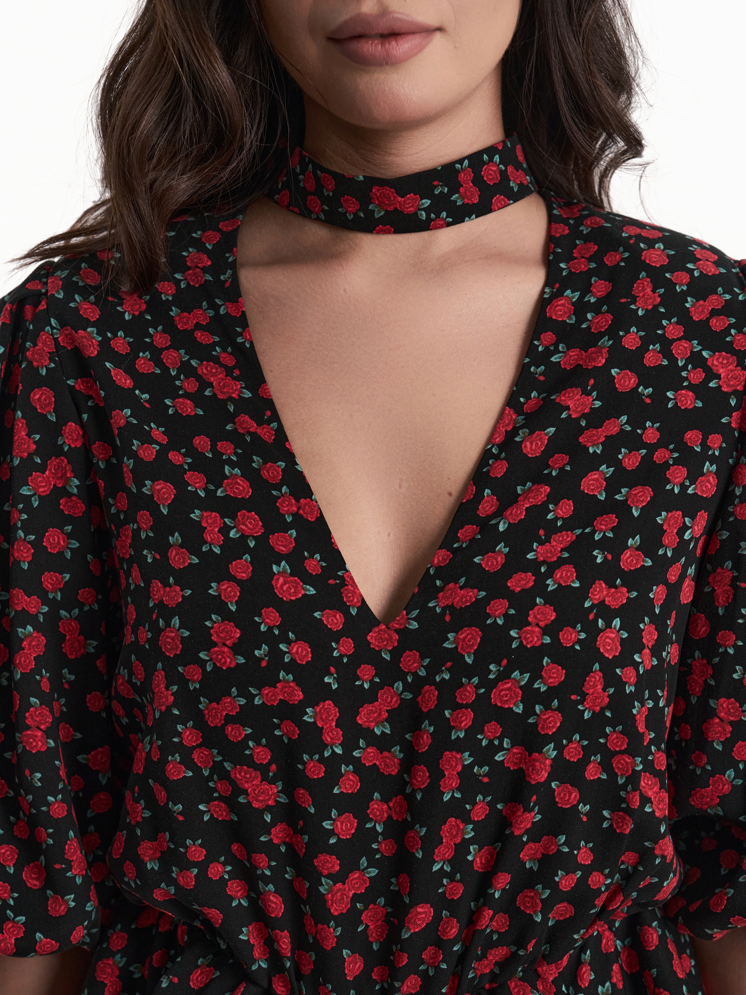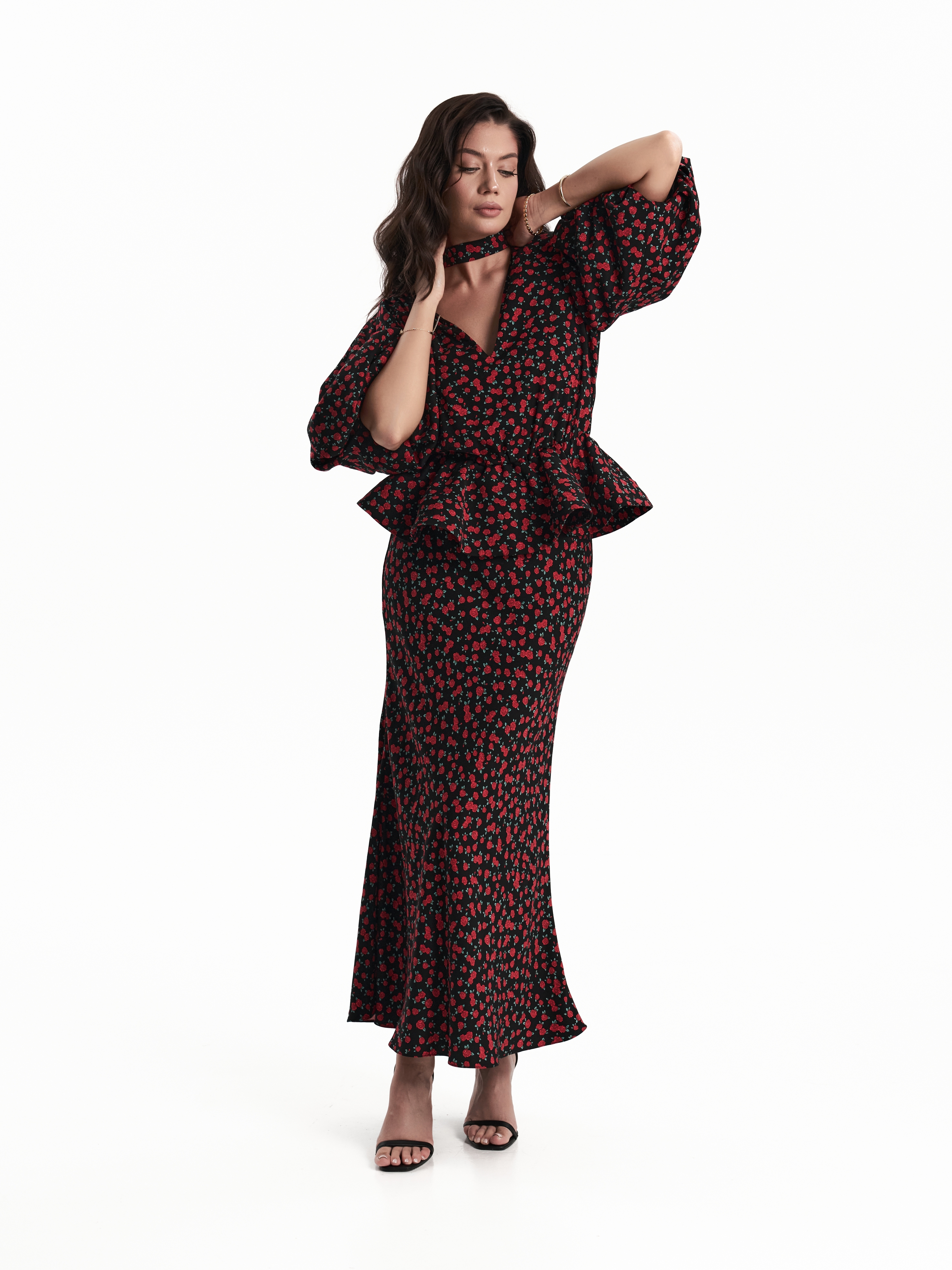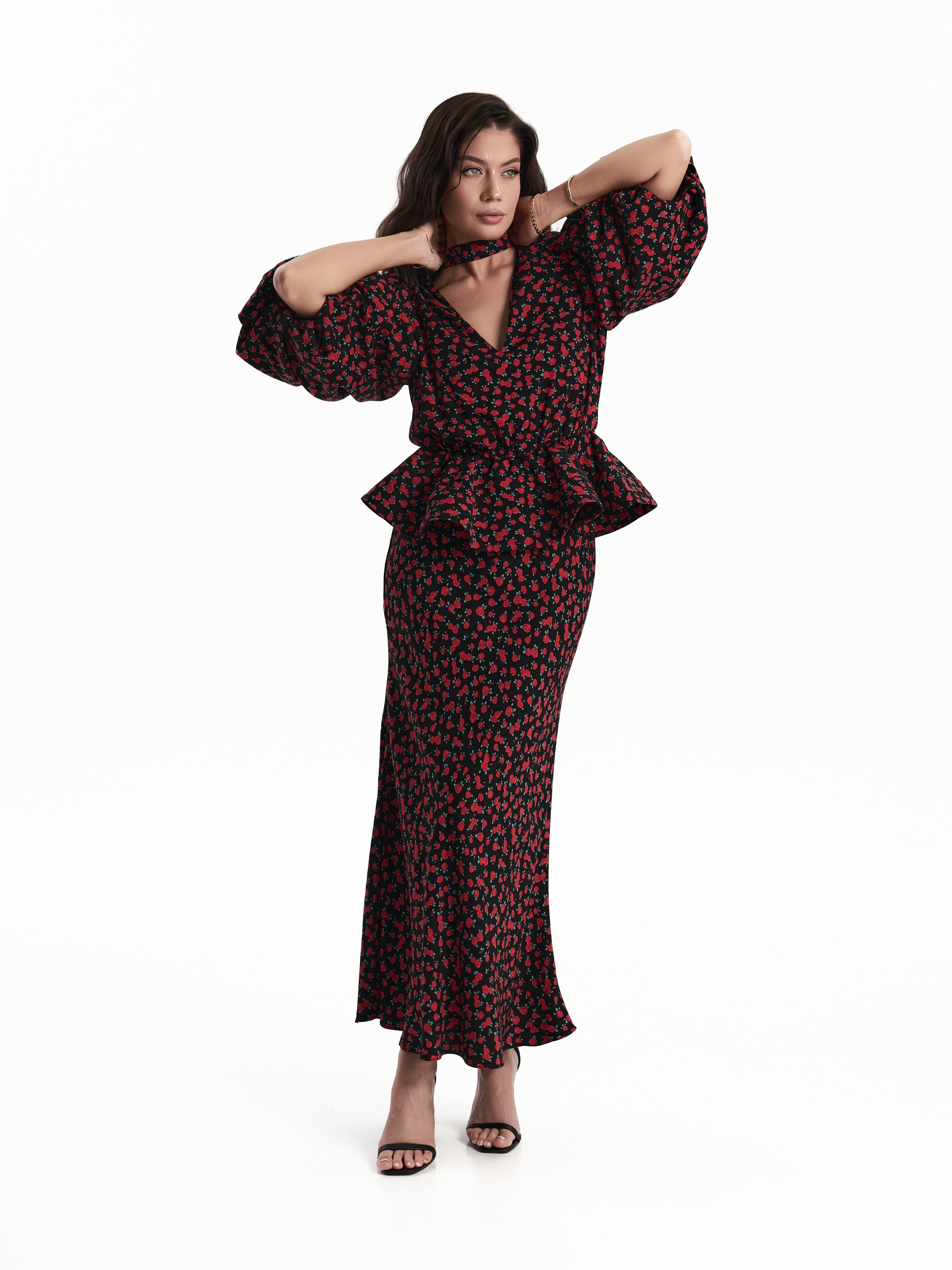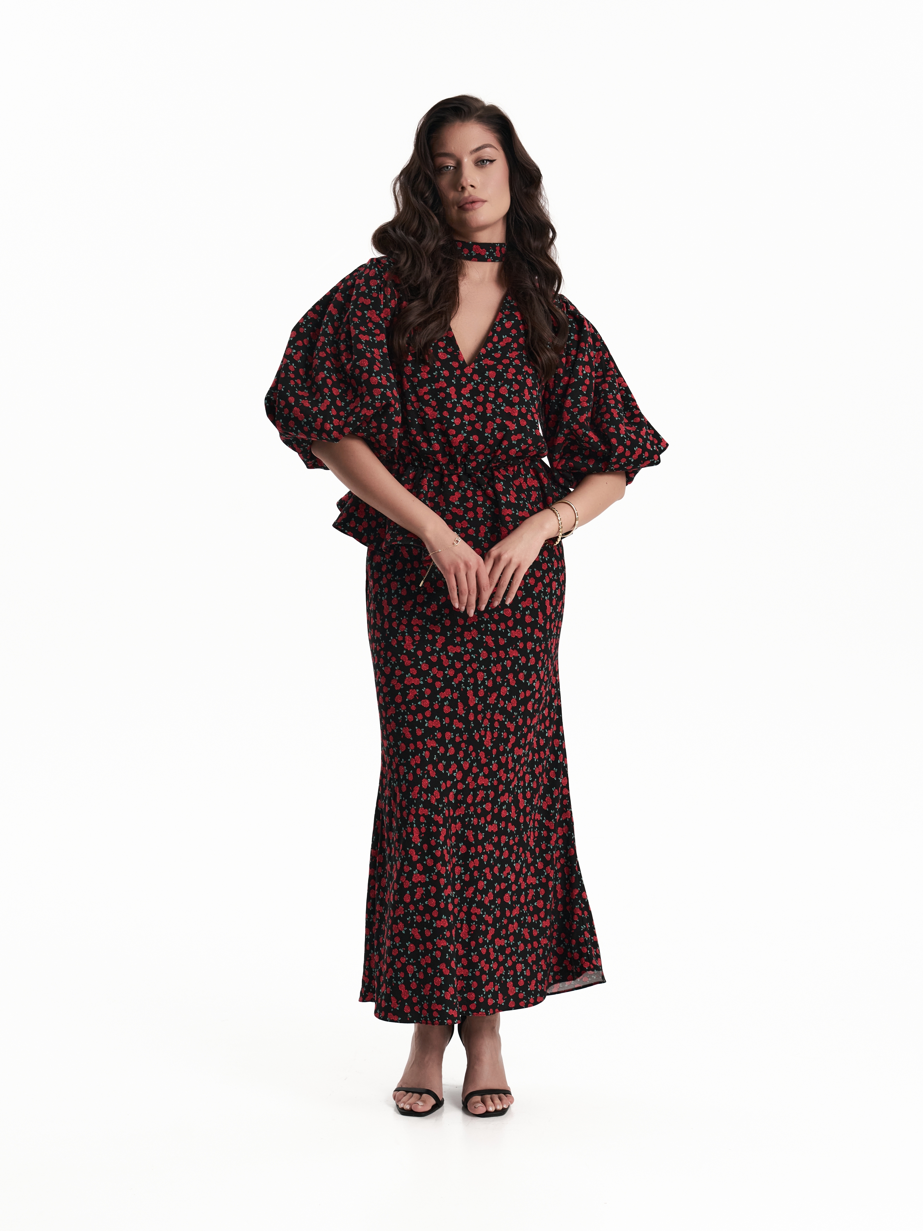 Блузка выполнена из легкой ткани черного цвета с принтом яркими красными розами. Имеет объемные укороченные рукава с легкой сборкой, которые добавляют романтический акцент образу. Глубокий V-образный вырез украшает область декольте, а приталенный силуэт подчеркивается поясом на талии. Нижняя часть дополнена аккуратной баской, придающей изделию женственность и элегантность. Блузка сочетает современный стиль с нотками винтажной эстетики, идеально подходит для прогулок или повседневных образов.