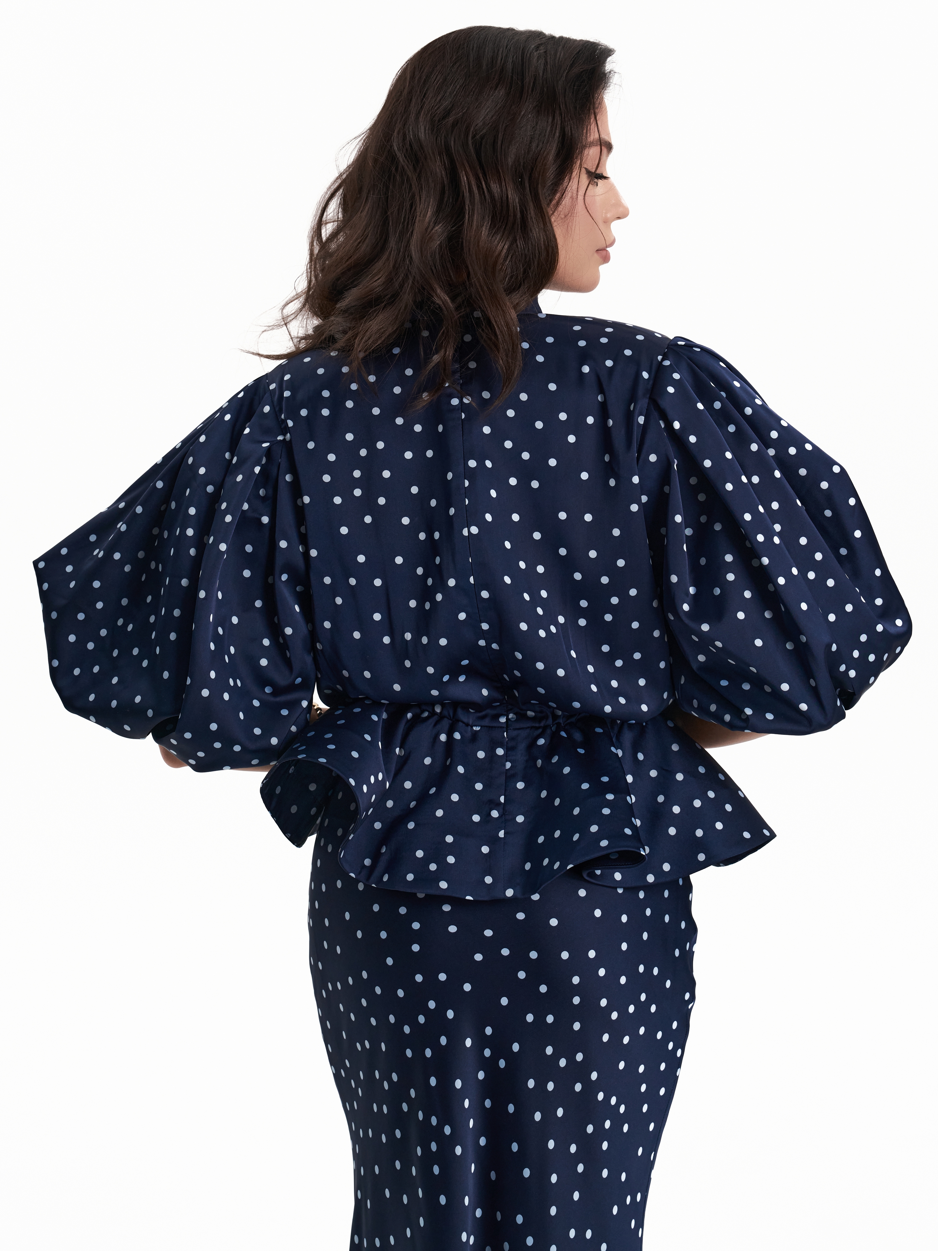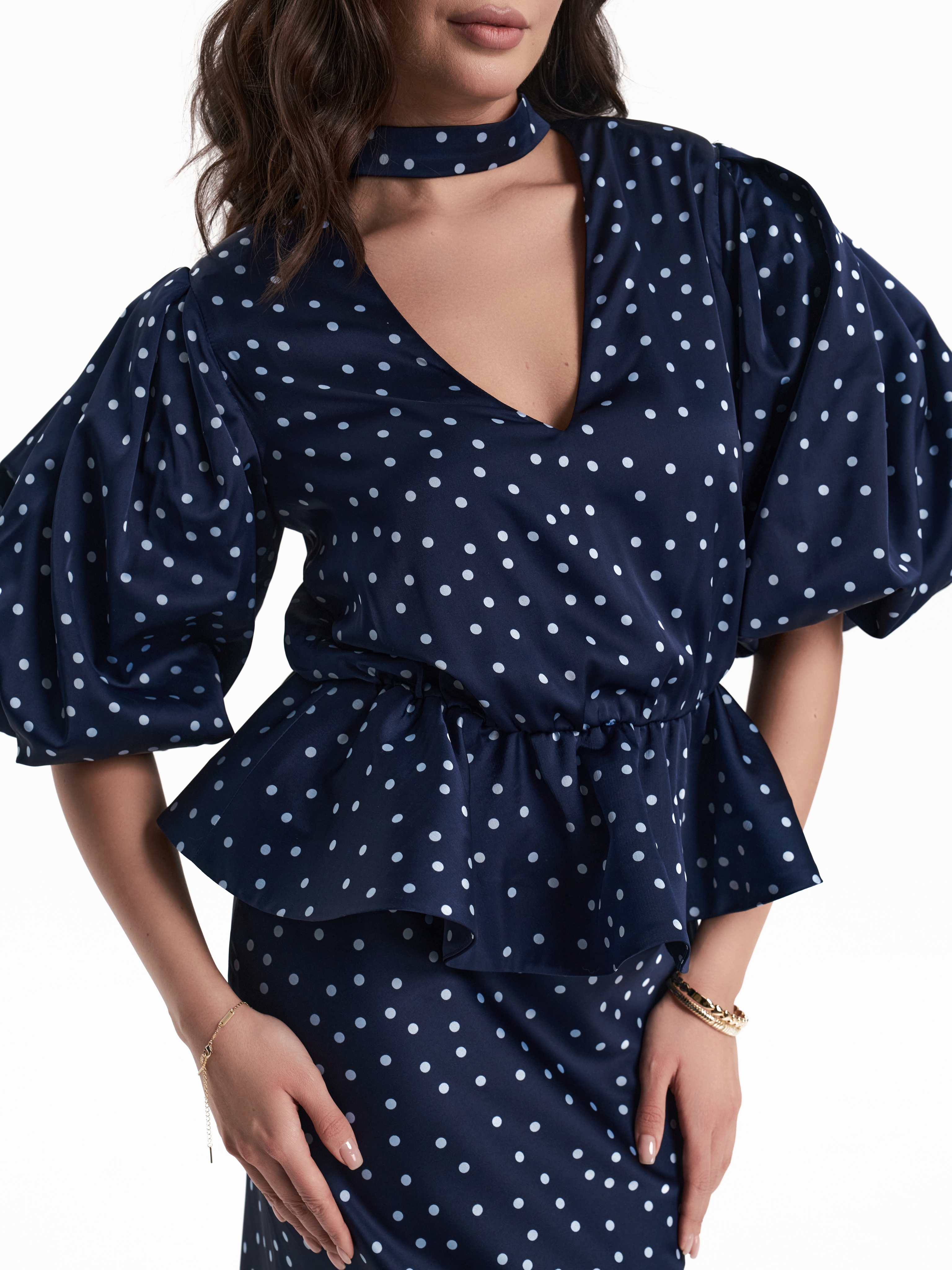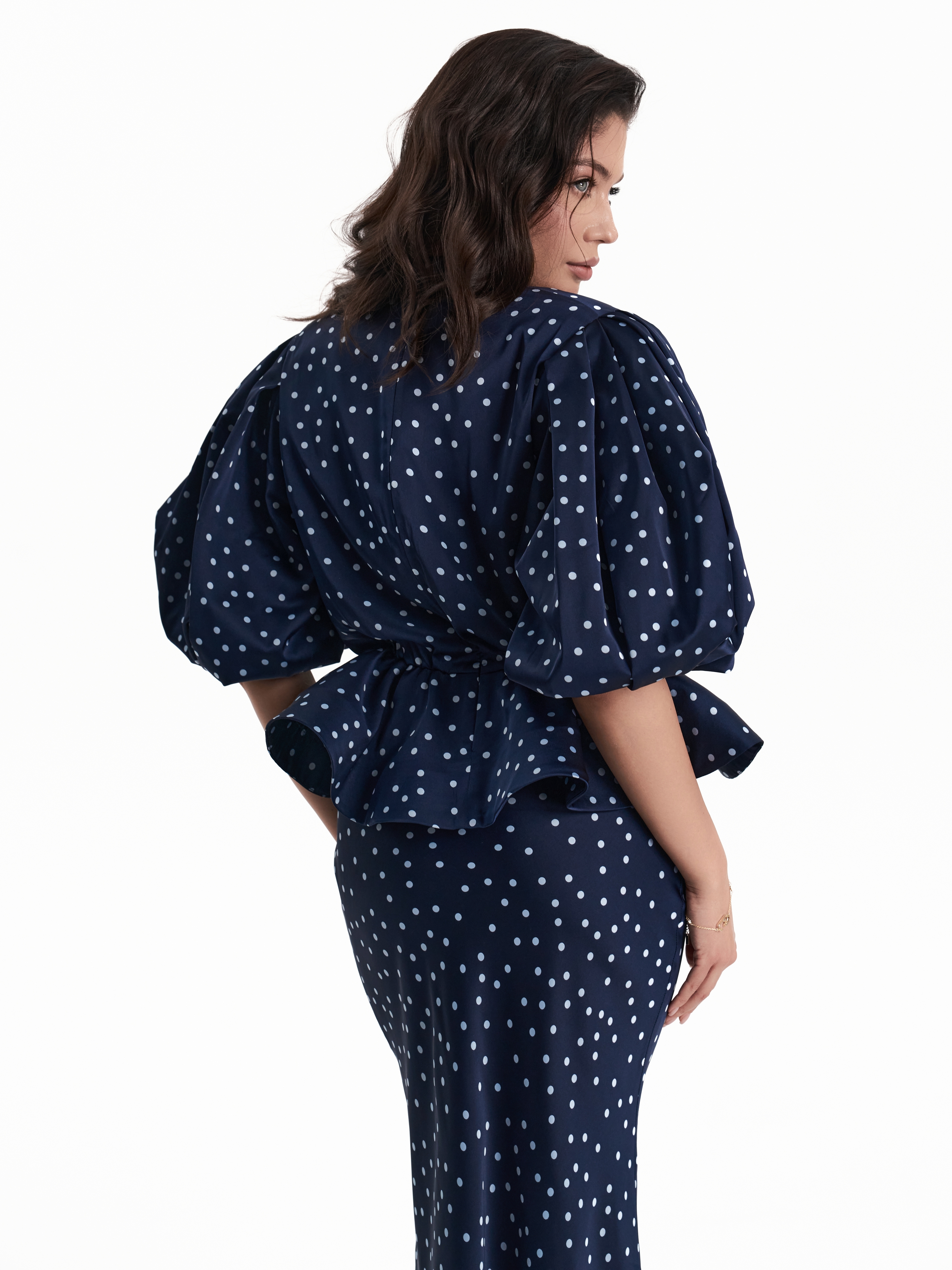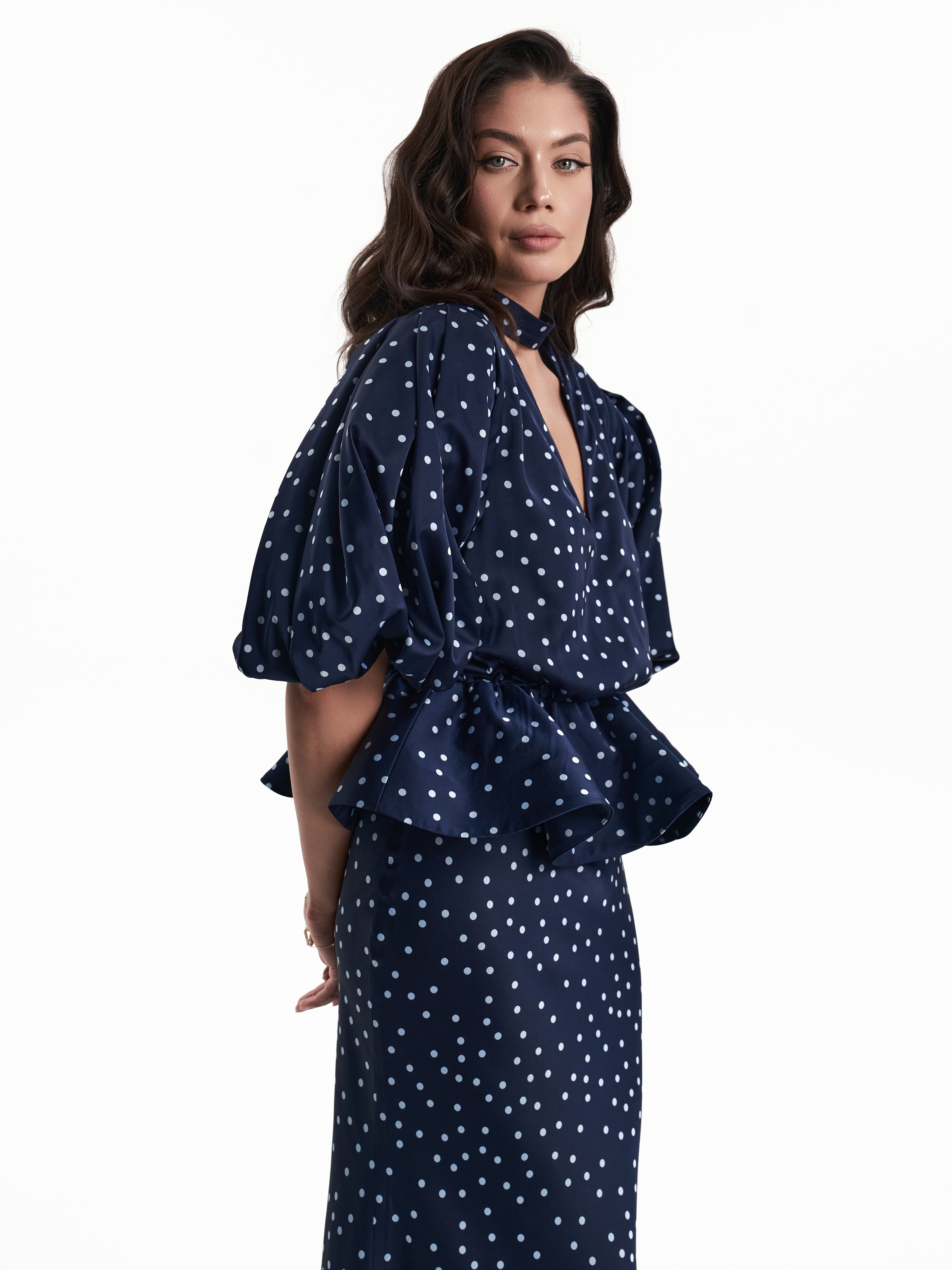 Блуза с объемными рукавами и выразительным V-образным вырезом украшена кокетливой баской, подчеркивающей талию. Яркий, немного игривый принт в горошек придает наряду лёгкость и свежесть, а имитация в виде чокера органично завершает ансамбль и добавляет современную изюминку. Этот костюм идеально подойдет для прогулки, фотосессии или вечернего выхода.