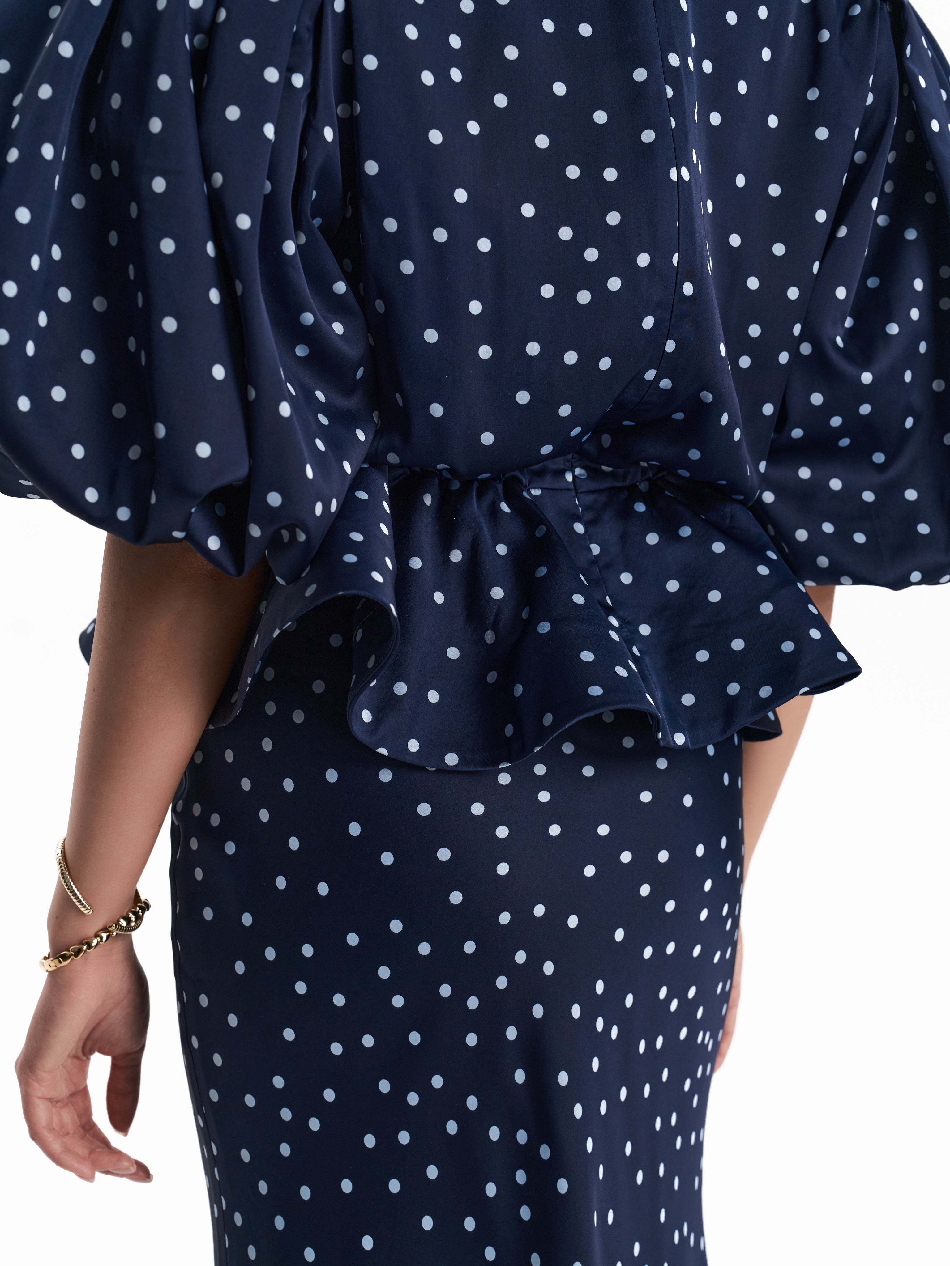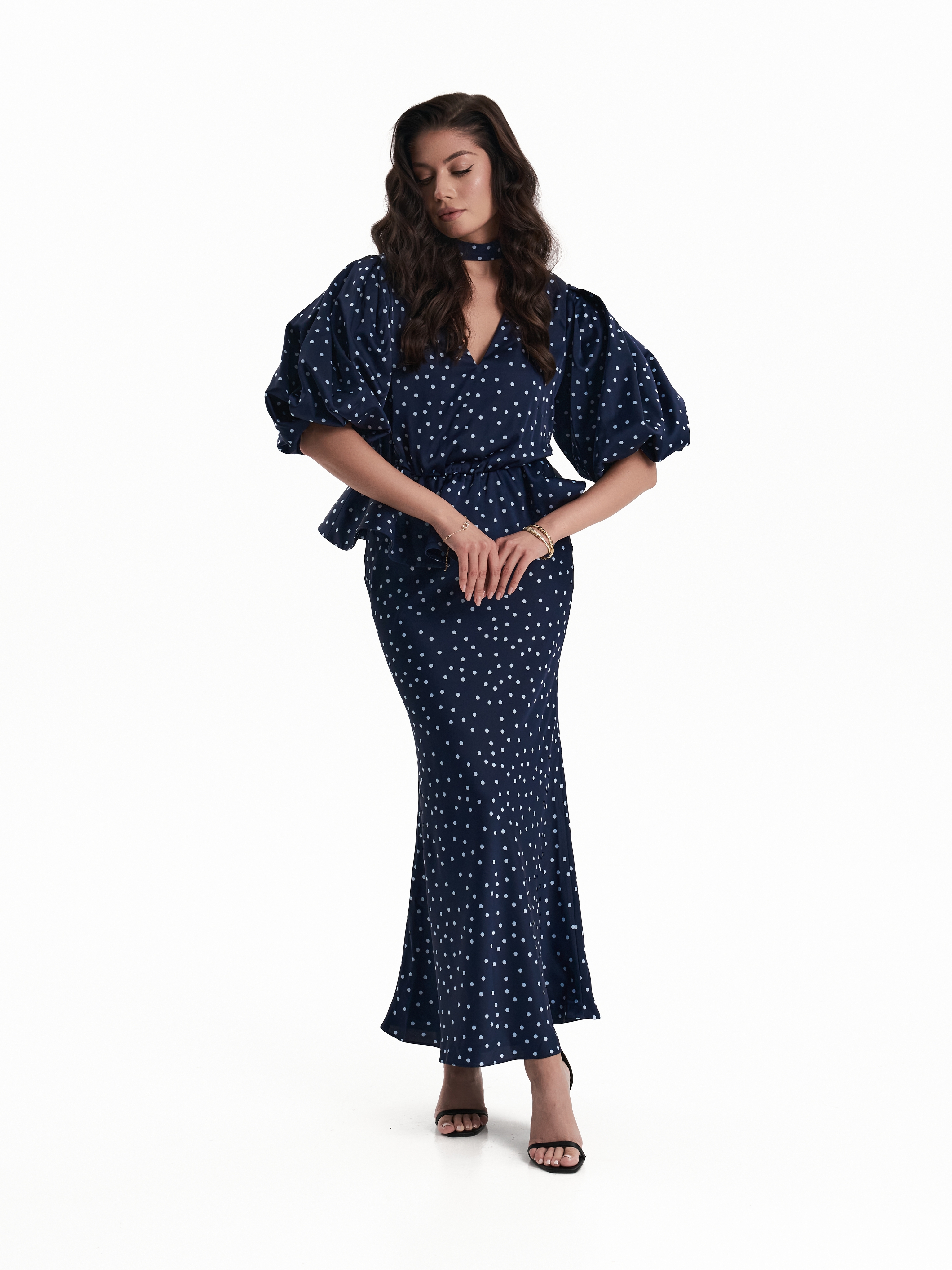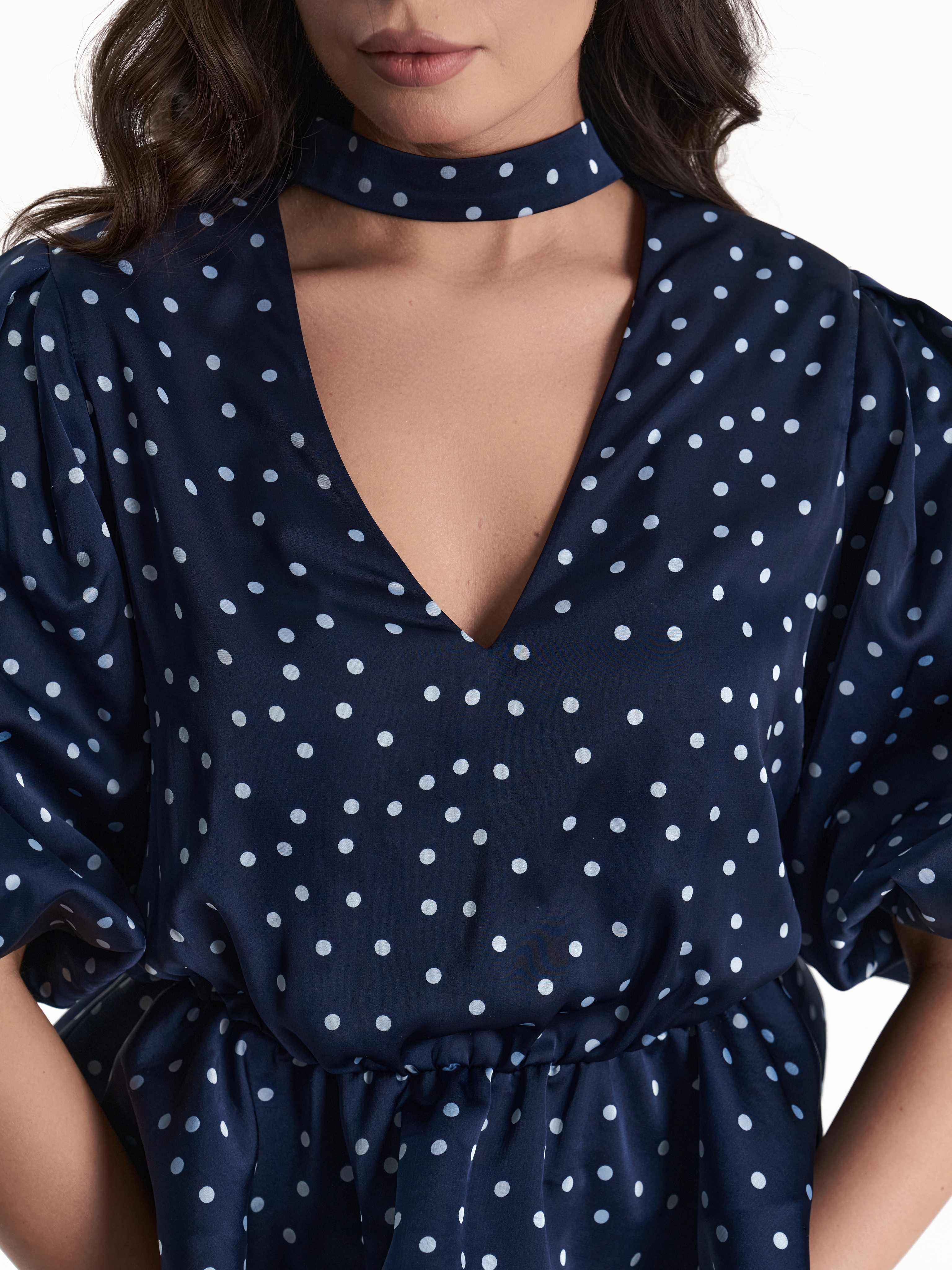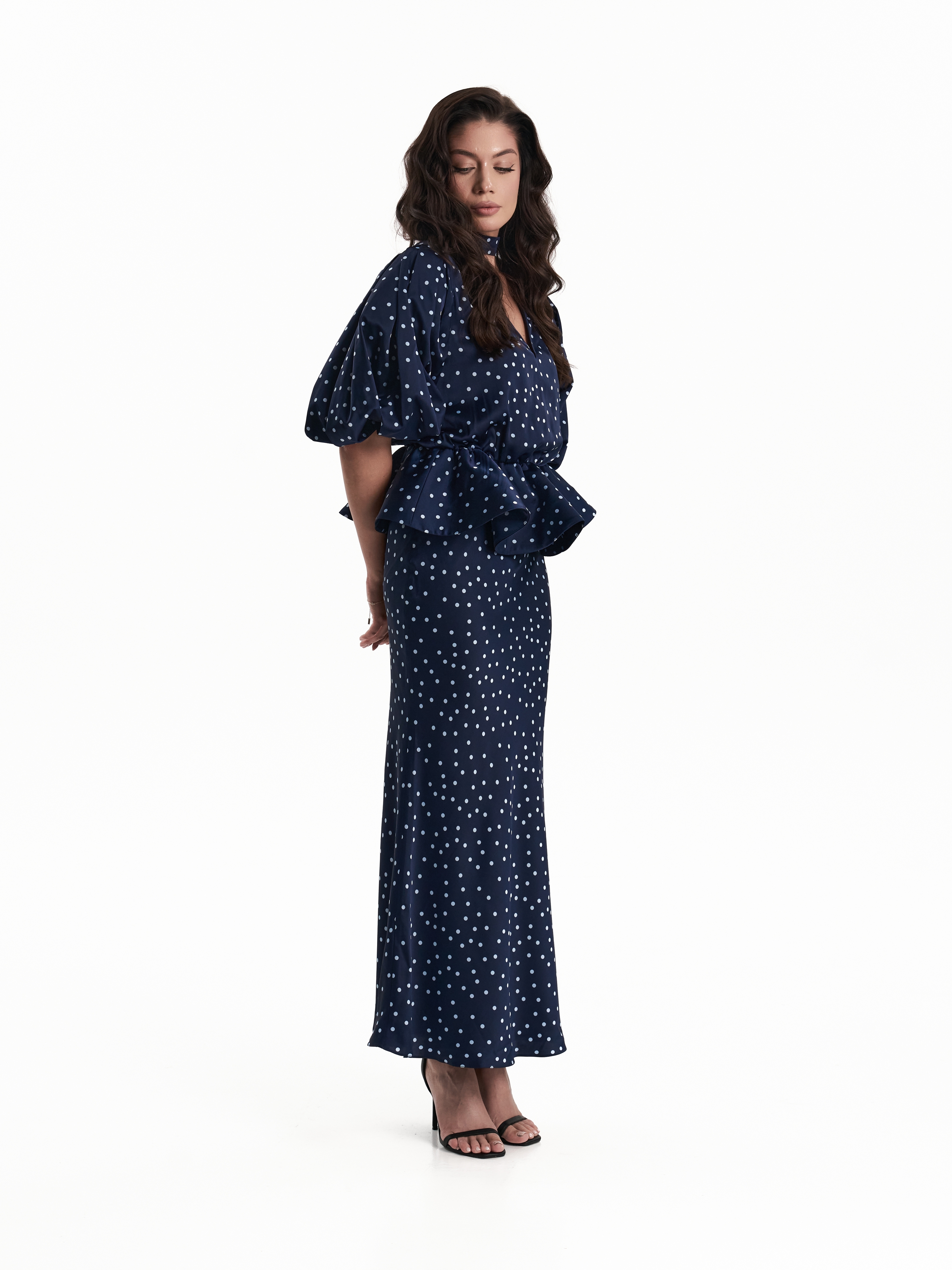 Блуза с объемными рукавами и выразительным V-образным вырезом украшена кокетливой баской, подчеркивающей талию. Яркий, немного игривый принт в горошек придает наряду лёгкость и свежесть, а имитация в виде чокера органично завершает ансамбль и добавляет современную изюминку. Этот костюм идеально подойдет для прогулки, фотосессии или вечернего выхода.