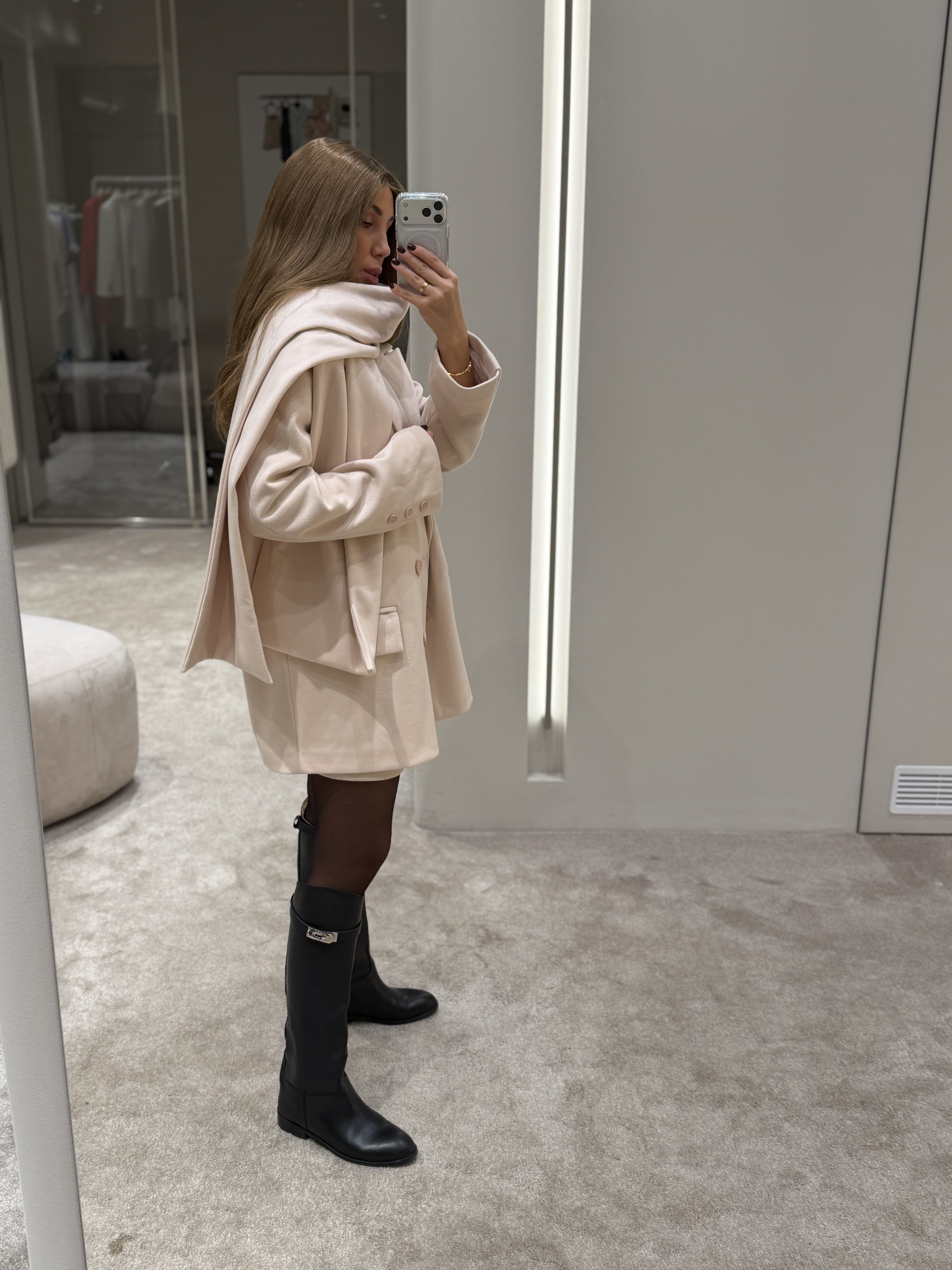 Элегантный образ в спокойной молочно-бежевой гамме - комплект тройка, состоящий из пальто-пиджака, длинного шарфа и юбки мини. Пальто-пиджак свободного кроя с двойной пуговичной застёжкой и накладными карманами. Шарф в тон пальто можно неформально накинуть на плечи и шейную зону, тем самым создавая аккуратный многослойный эффект и придавая образу уют. Юбка в длине мини прекрасно дополняет образ, делая его завершенным. Комплект тройка легко комбинируется с различными аксессуарами, такими как обувь на каблуке, стильные сумки и украшения. Данный образ точно подойдет на любой случай!
