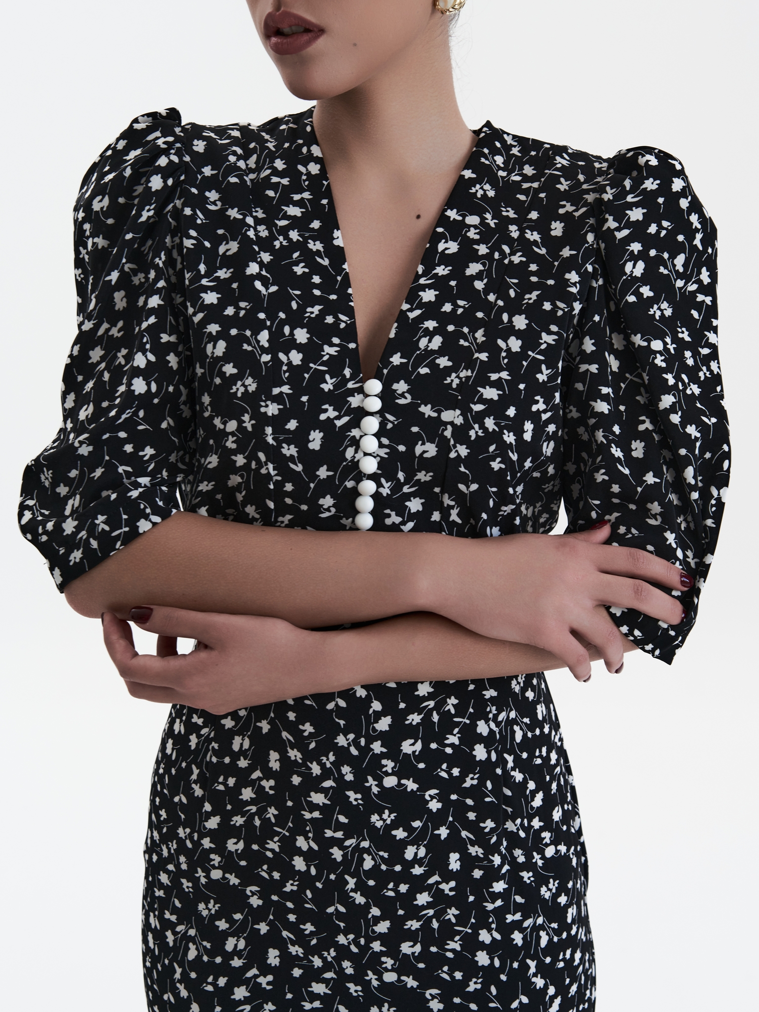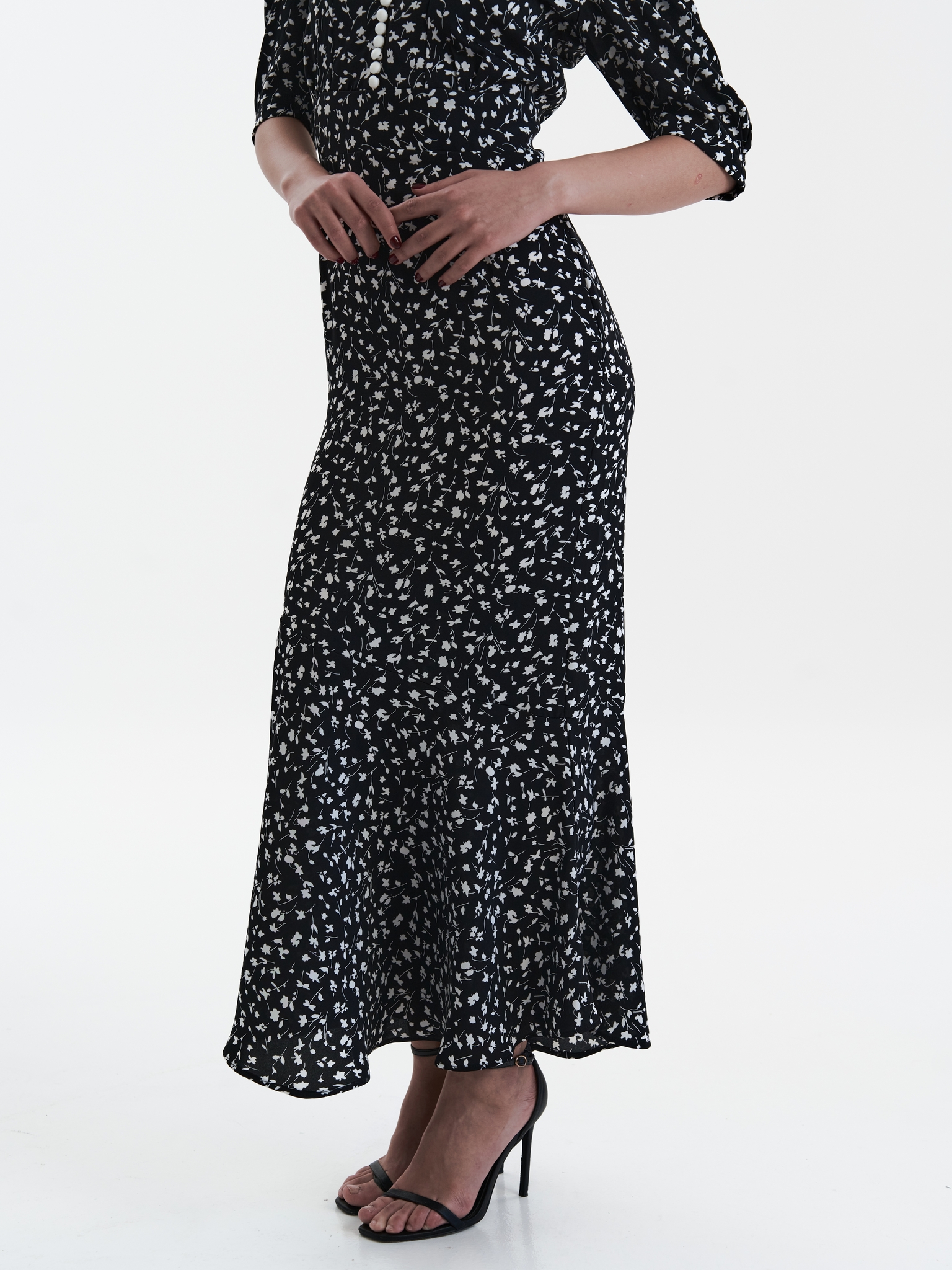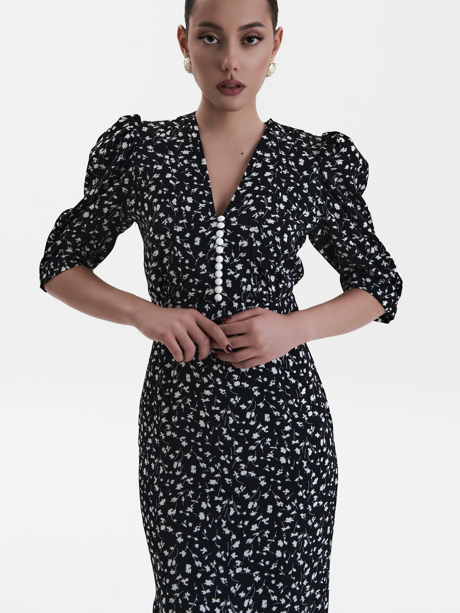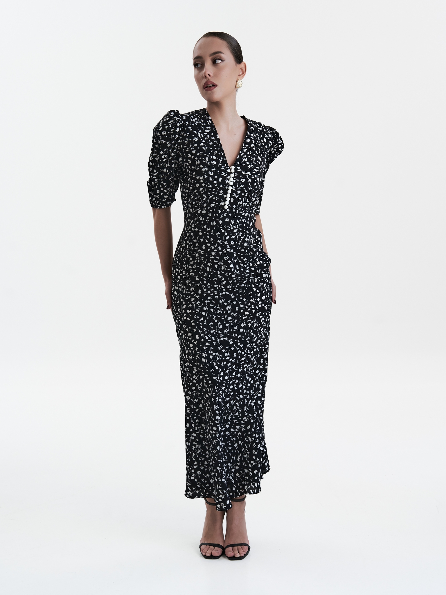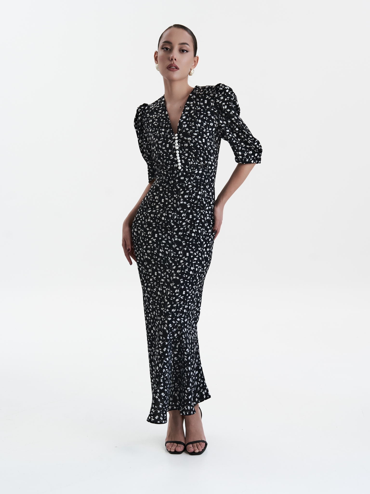 Элегантное платье с силуэтом "рыбка" выполнено в классическом черном цвете и украшено стильным белым принтом. Благодаря облегающему крою, оно подчеркивает фигуру и создает изящный силуэт. Идеальный выбор для вечерних мероприятий или особых случаев, это платье сочетает в себе утонченность и современный стиль. Белый принт добавляет образу нотки оригинальности и свежести, делая его по-настоящему запоминающимся.