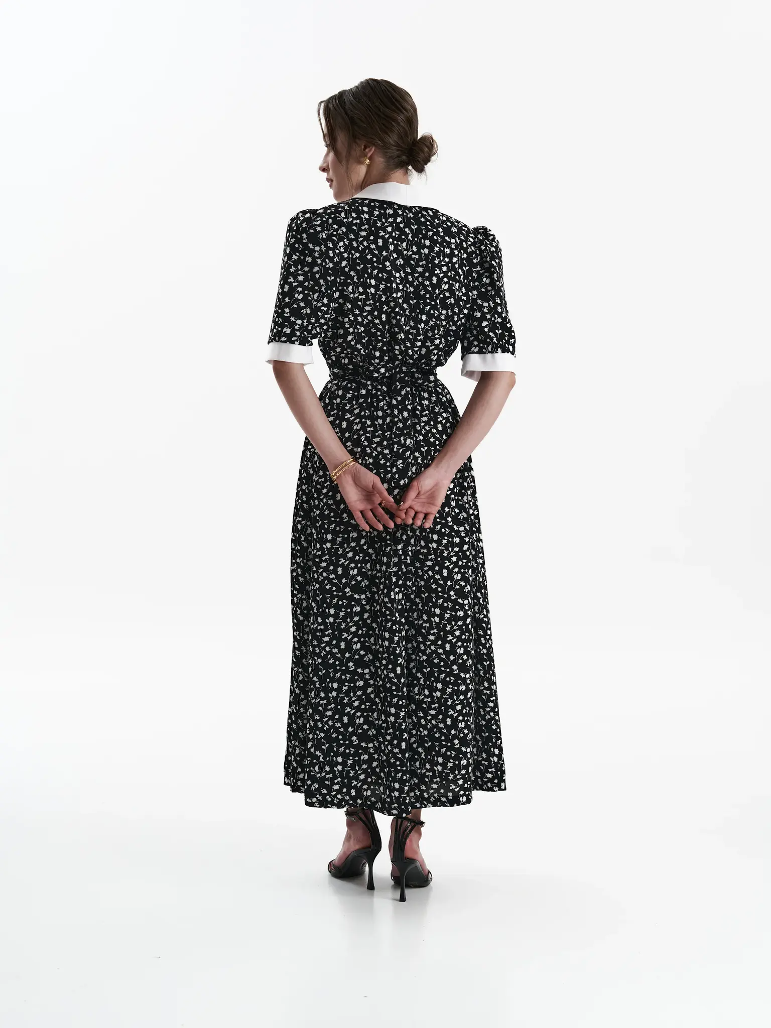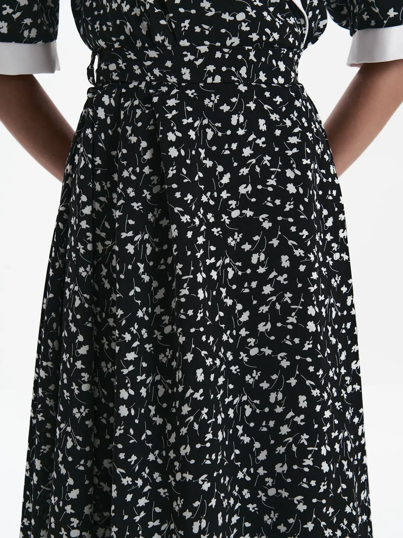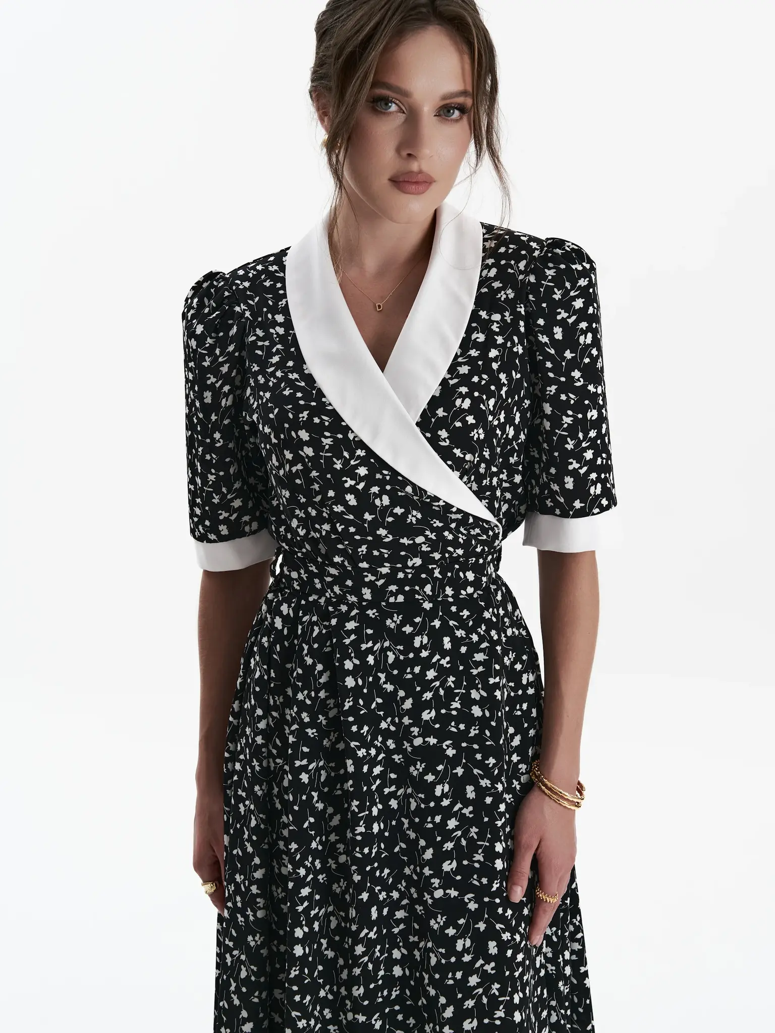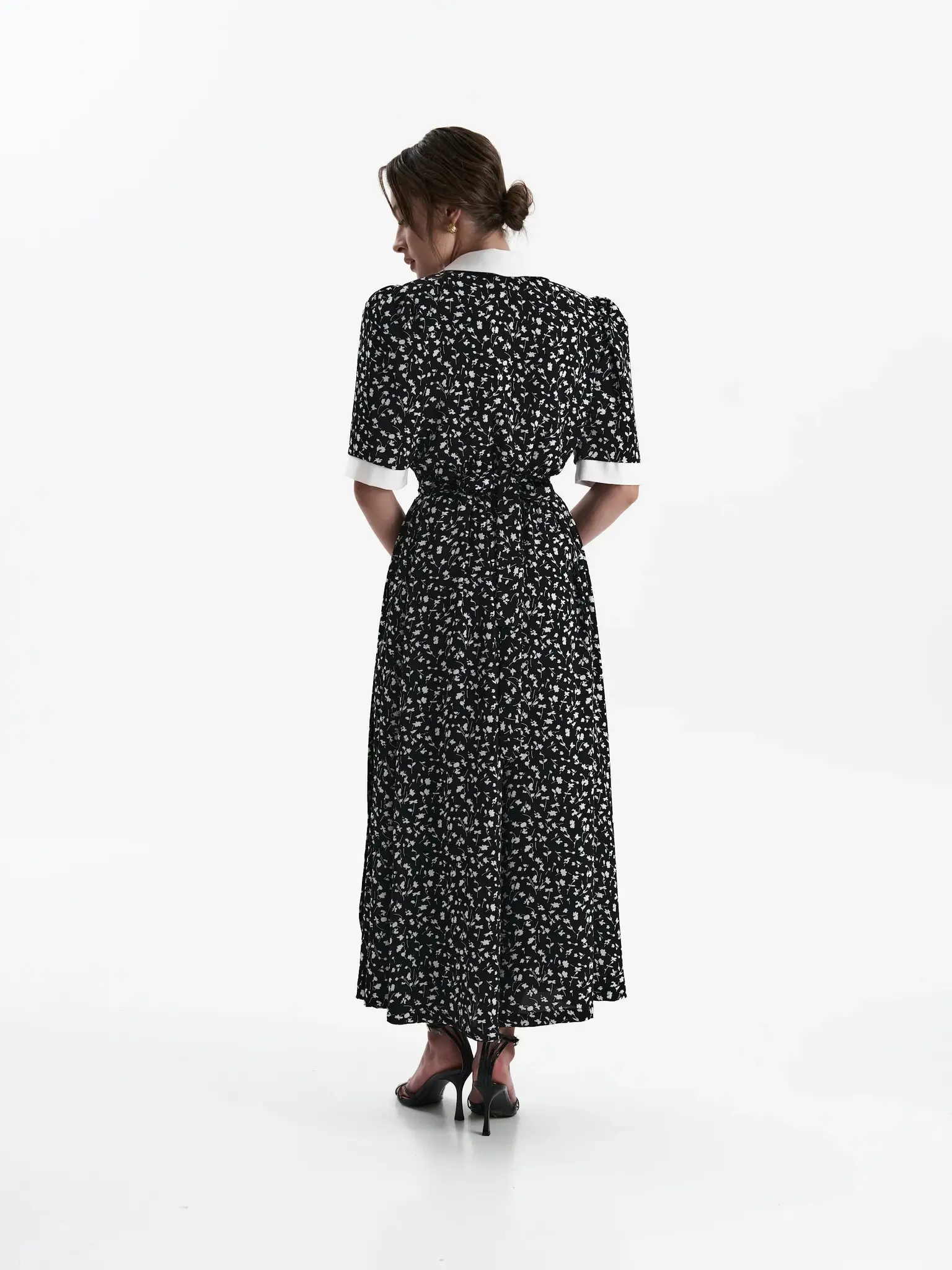 Изысканное платье в черном цвете станет настоящим акцентом в Вашем гардеробе. Украсившееся романтичным белым цветочным принтом, оно придаёт образу легкость и свежесть. Элегантный белый воротник добавляет нотку классики и утонченности, подчеркивая линию шеи. Легкий и приятный к телу материал обеспечивает комфорт в течение всего дня, а свободный крой позволяет легко сочетать его с различными аксессуарами. Создайте свой уникальный стиль с этим платьем, которое подчеркнет Вашу индивидуальность и женственность.