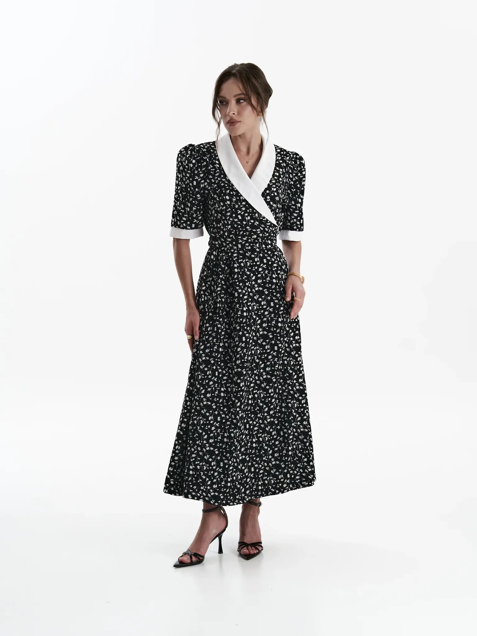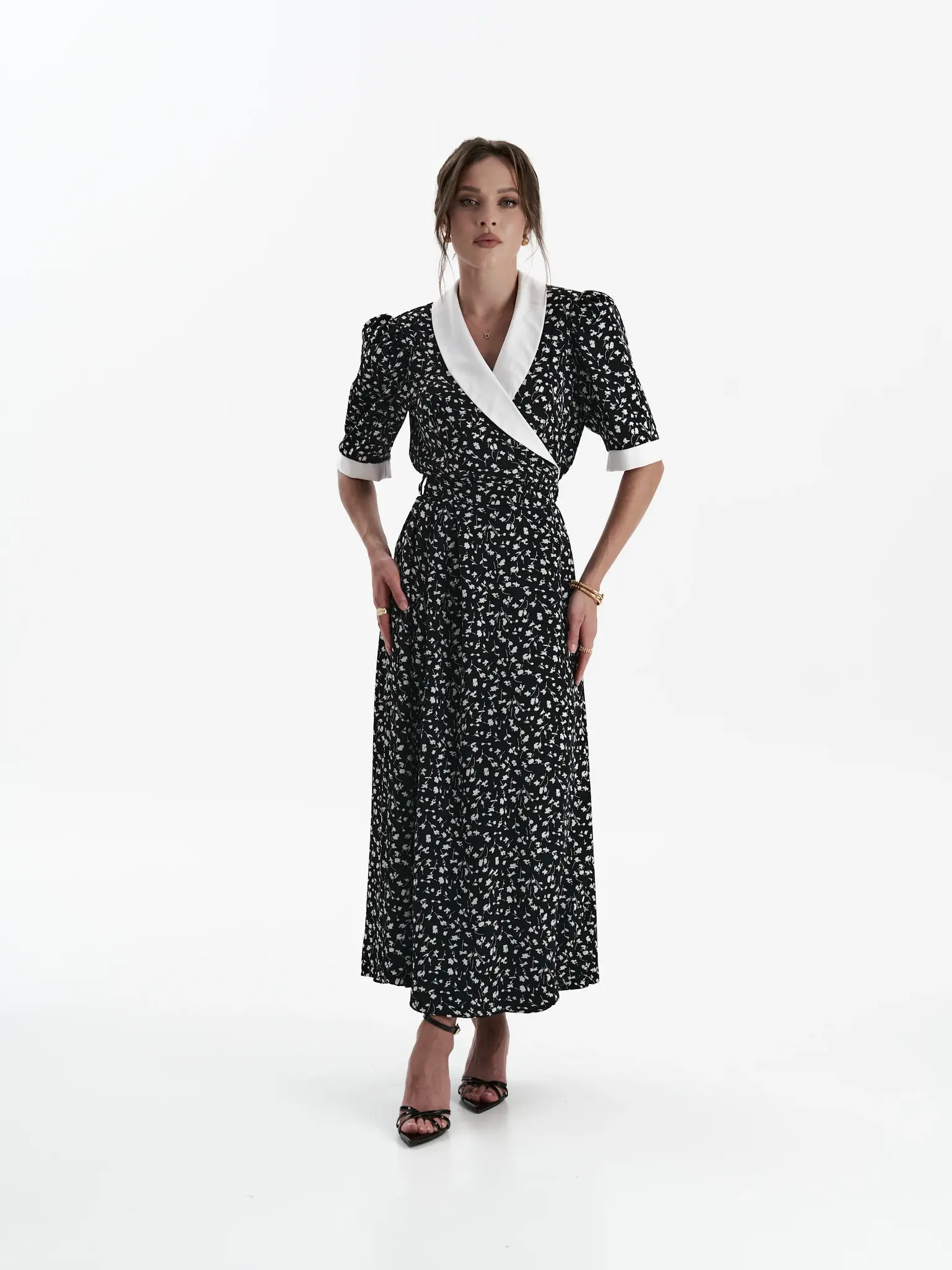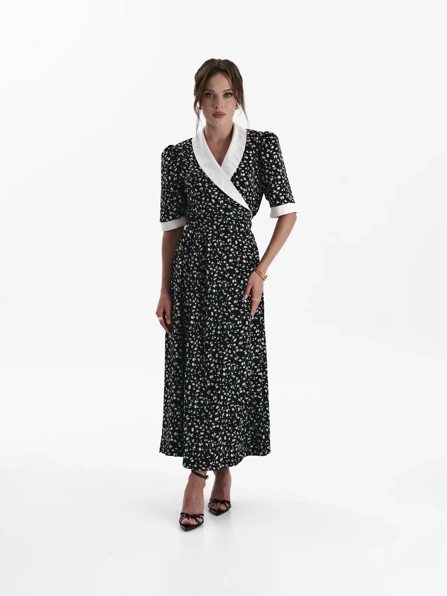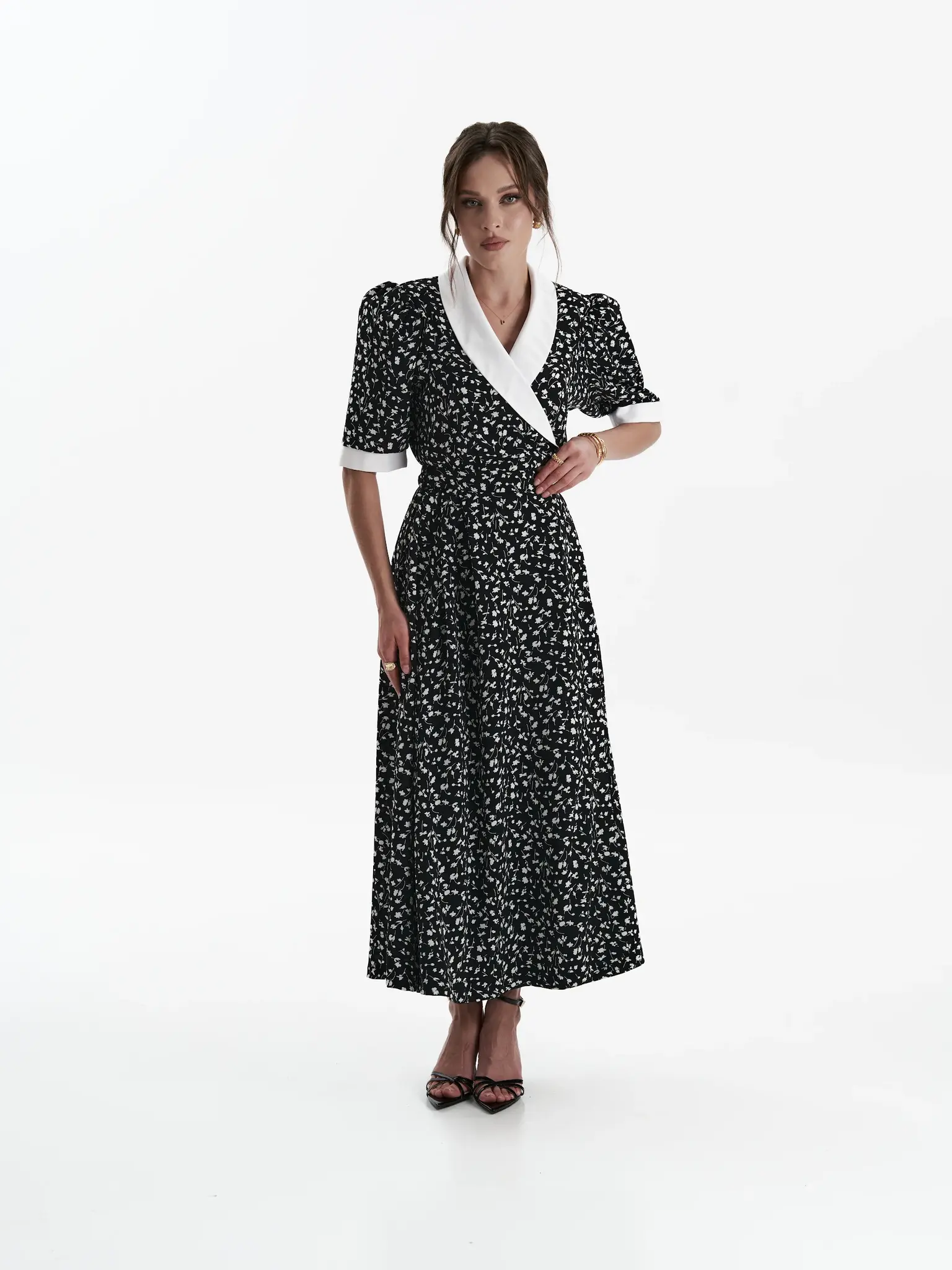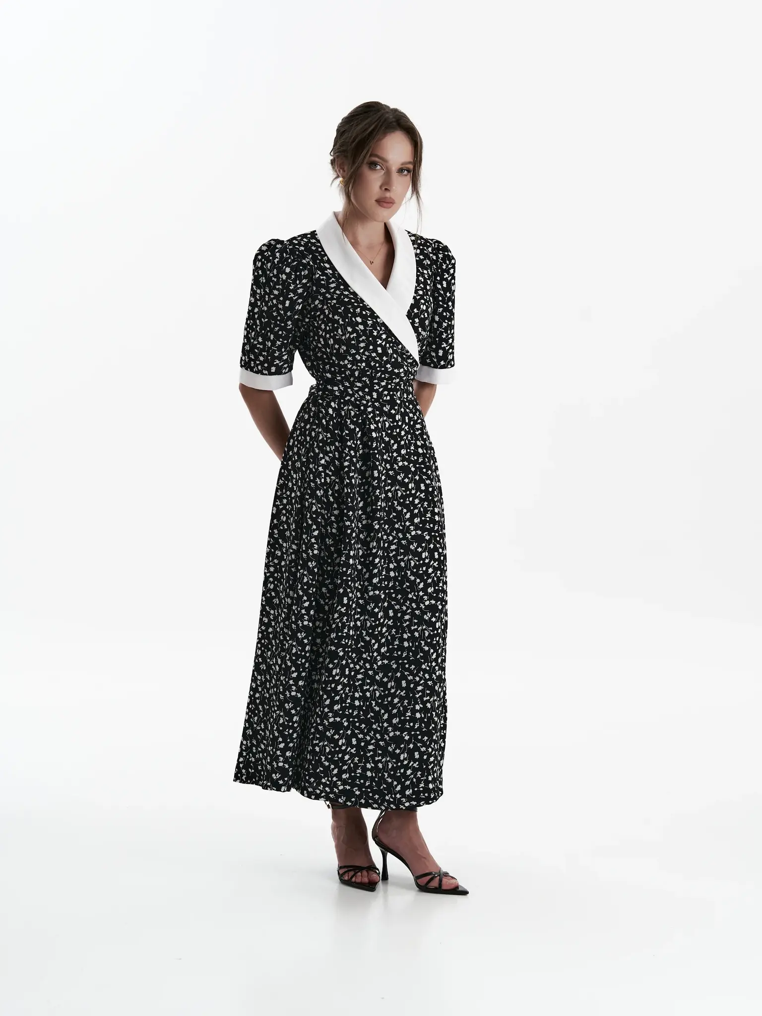 Изысканное платье в черном цвете станет настоящим акцентом в Вашем гардеробе. Украсившееся романтичным белым цветочным принтом, оно придаёт образу легкость и свежесть. Элегантный белый воротник добавляет нотку классики и утонченности, подчеркивая линию шеи. Легкий и приятный к телу материал обеспечивает комфорт в течение всего дня, а свободный крой позволяет легко сочетать его с различными аксессуарами. Создайте свой уникальный стиль с этим платьем, которое подчеркнет Вашу индивидуальность и женственность.