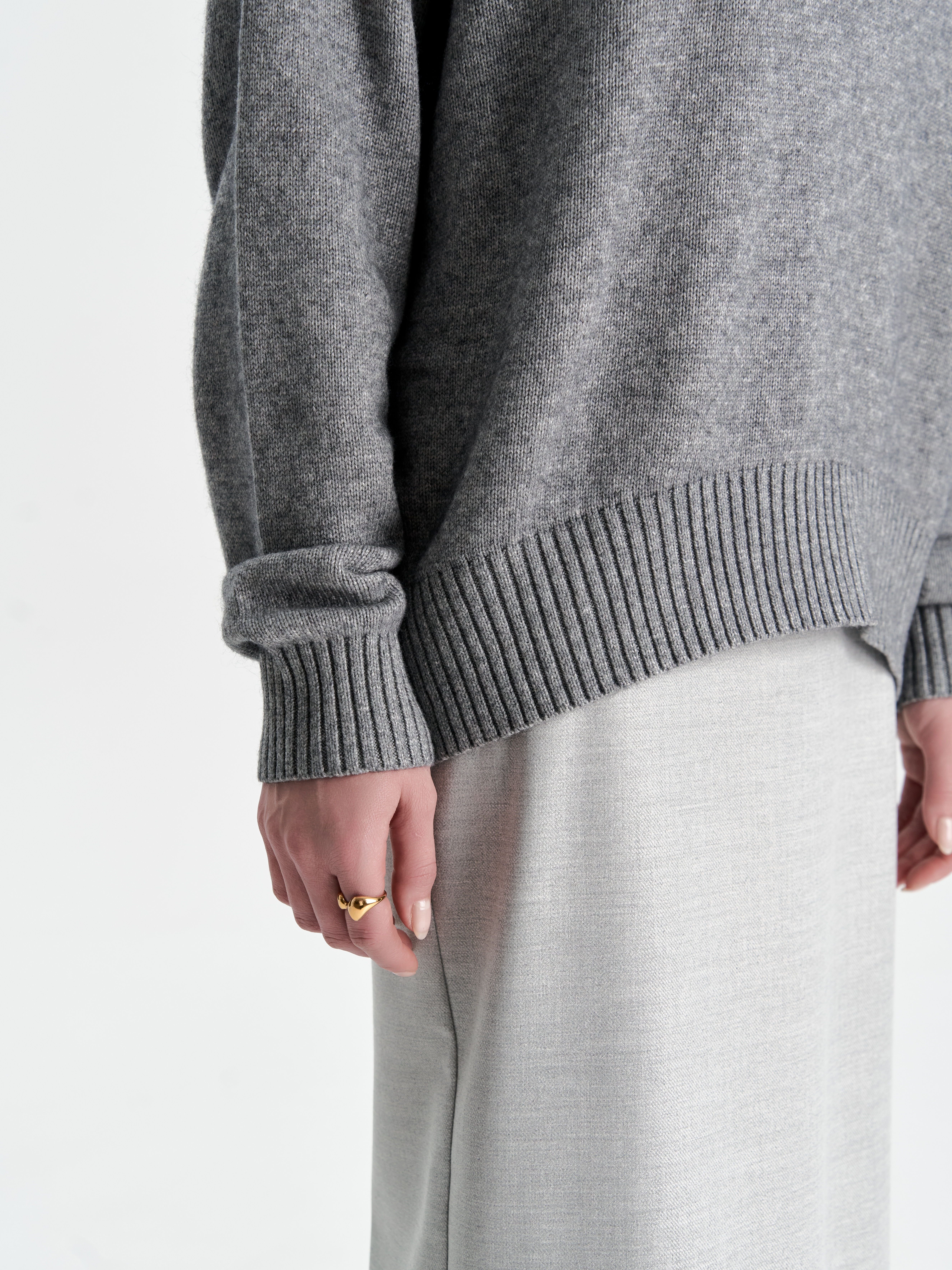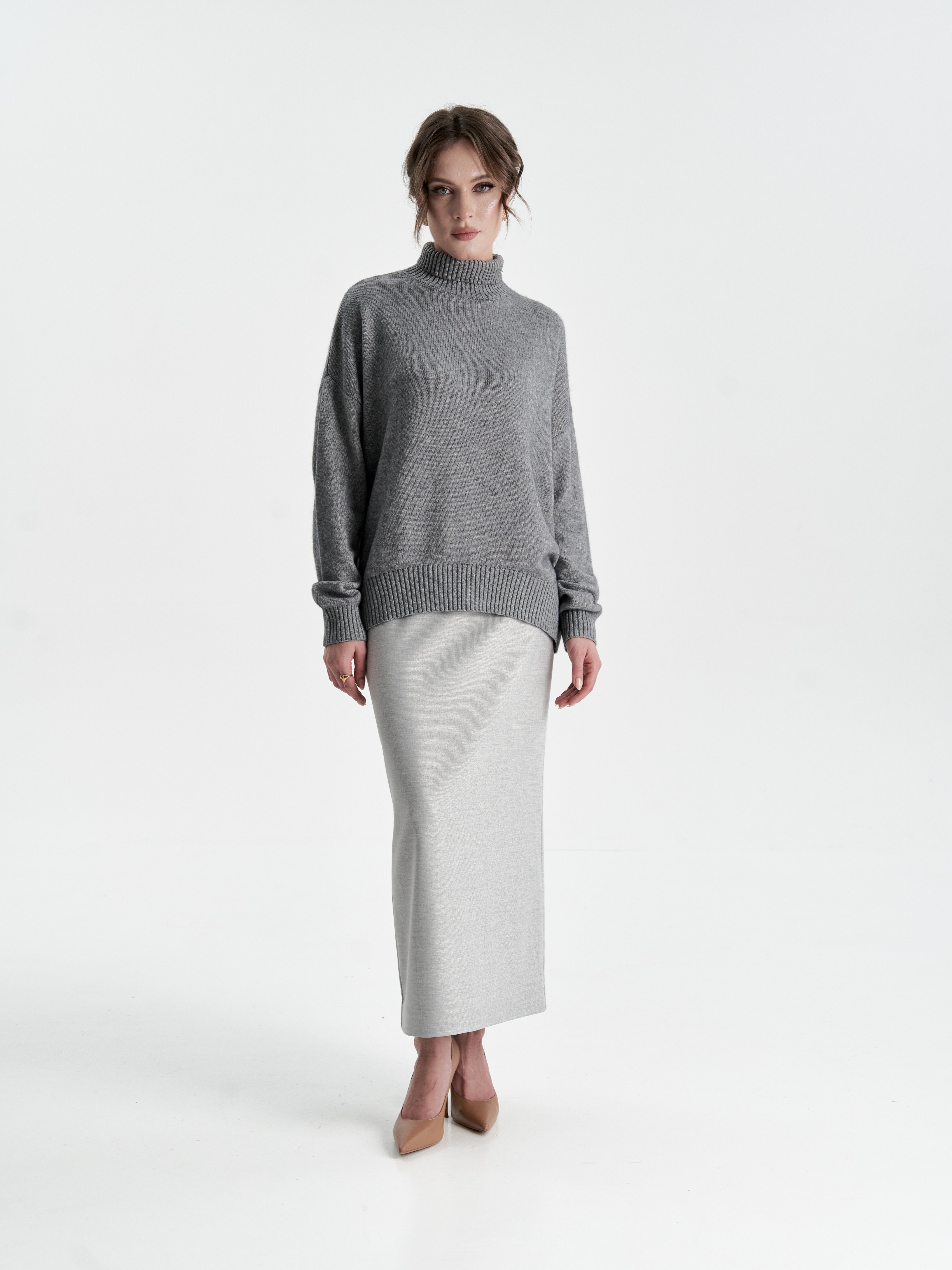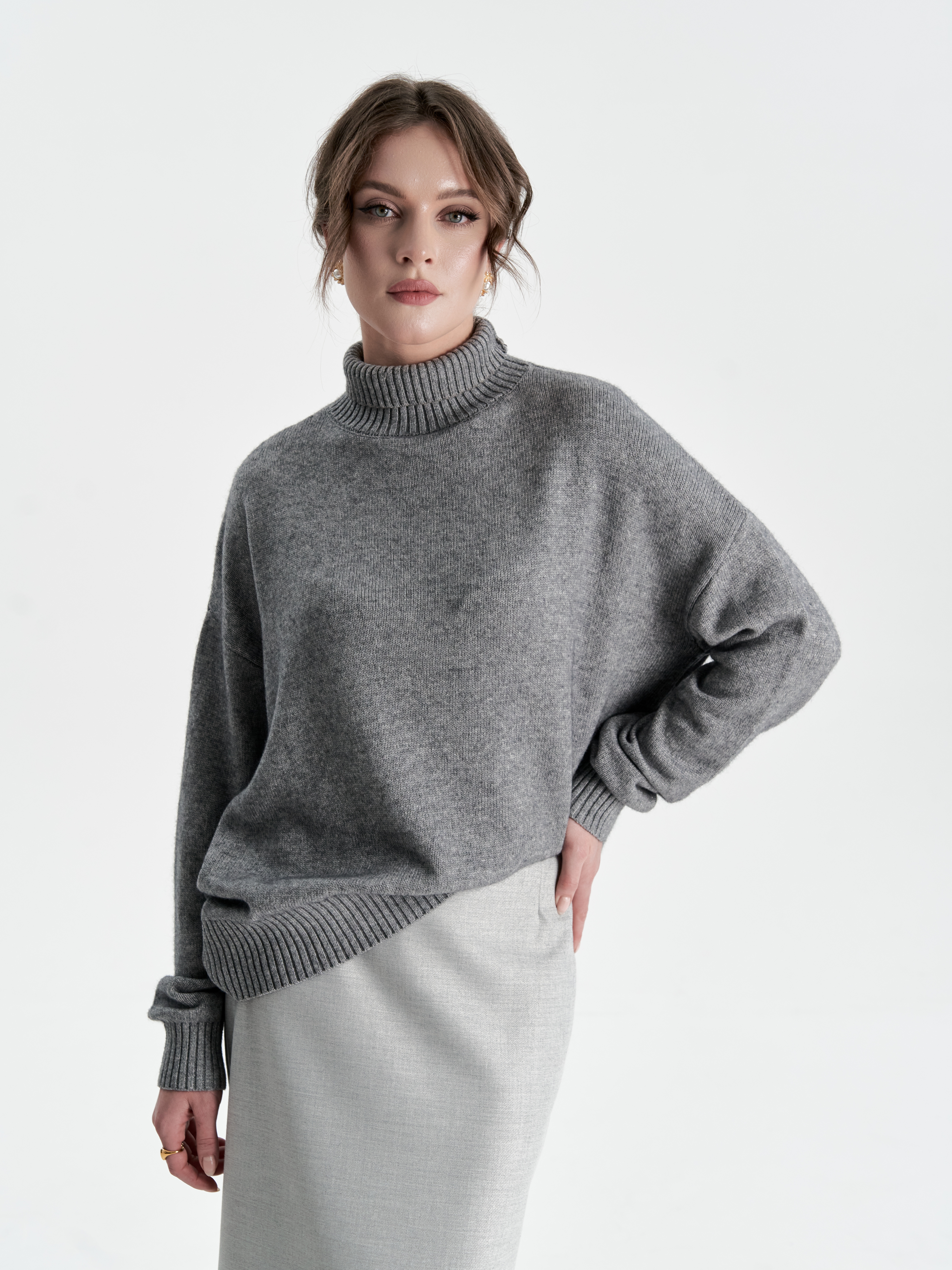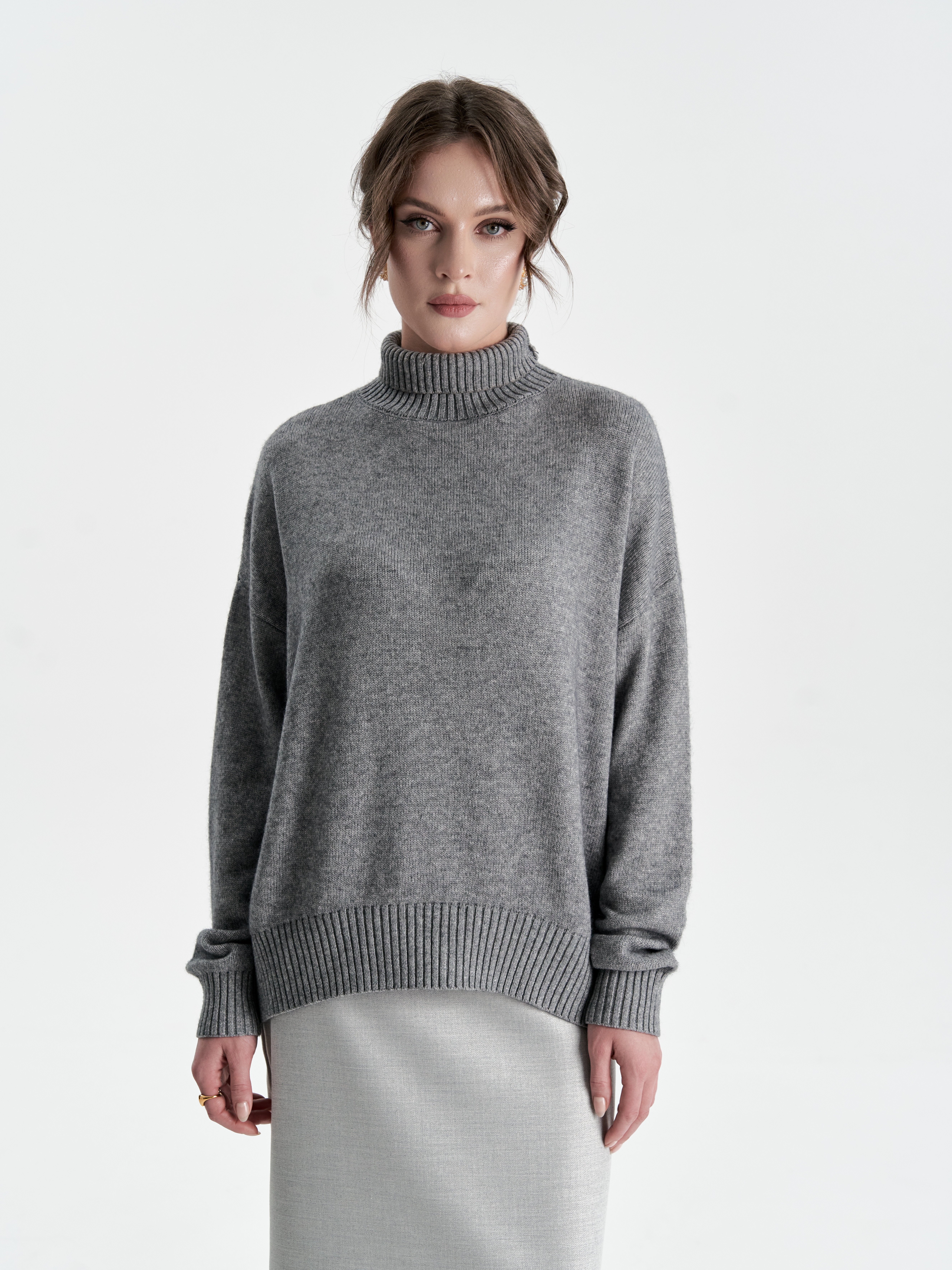 Свитер из мериносовой шерсти и кашемира представлен в универсальном сером цвете. Мягкая и приятная к телу ткань идеальна для прохладной погоды, позволяя сохранять тепло и комфорт в течение всего дня. Модель имеет свободный крой, что добавляет уюта и делает её отличным выбором для стильных повседневных образов. Высокий воротник, эластичные манжеты и широкий нижний край обеспечивают прекрасную посадку и защищают от ветра. Такой свитер прекрасно сочетается с юбками и брюками, подчеркивая элегантность и утонченность вашего стиля.
