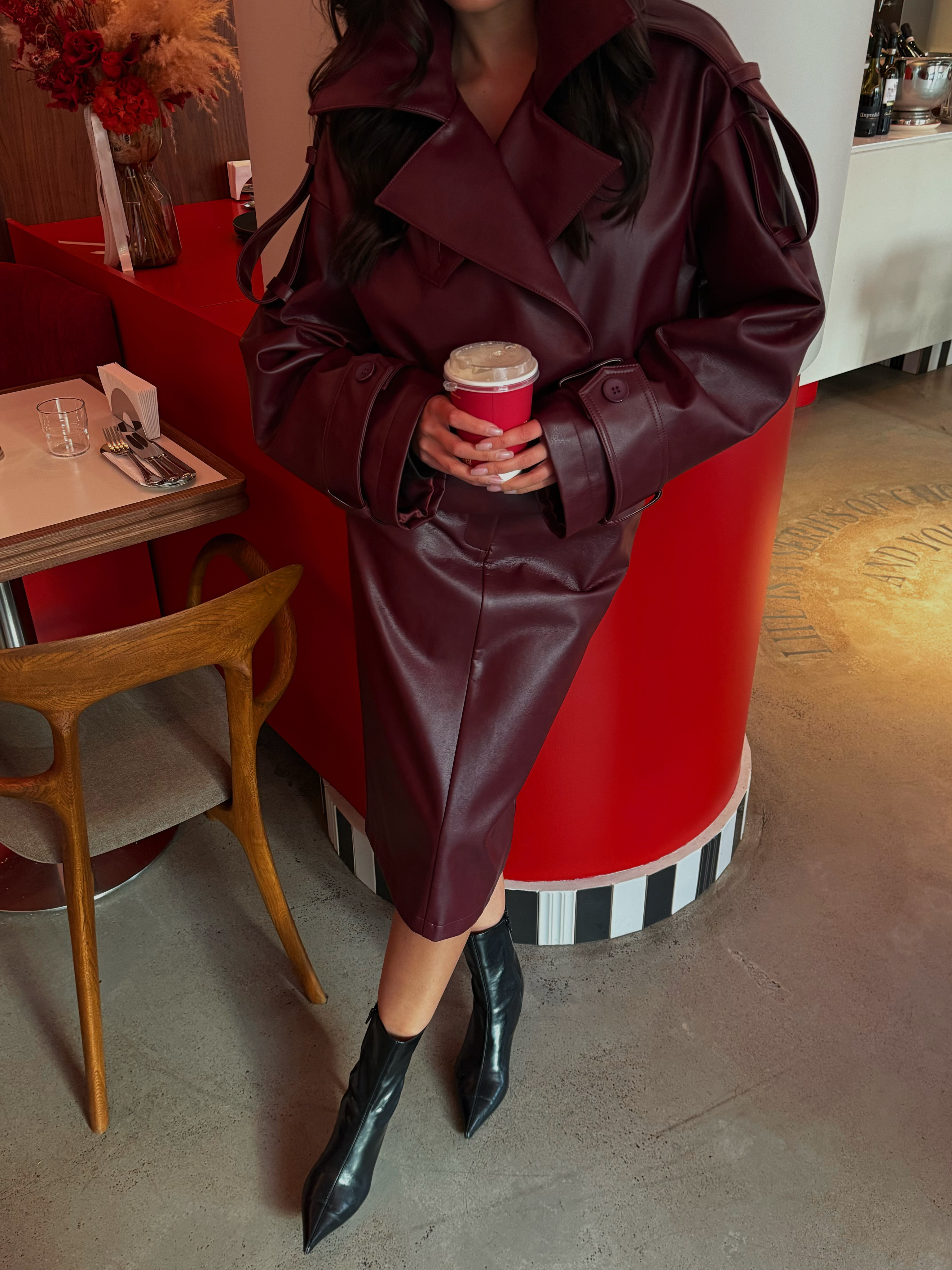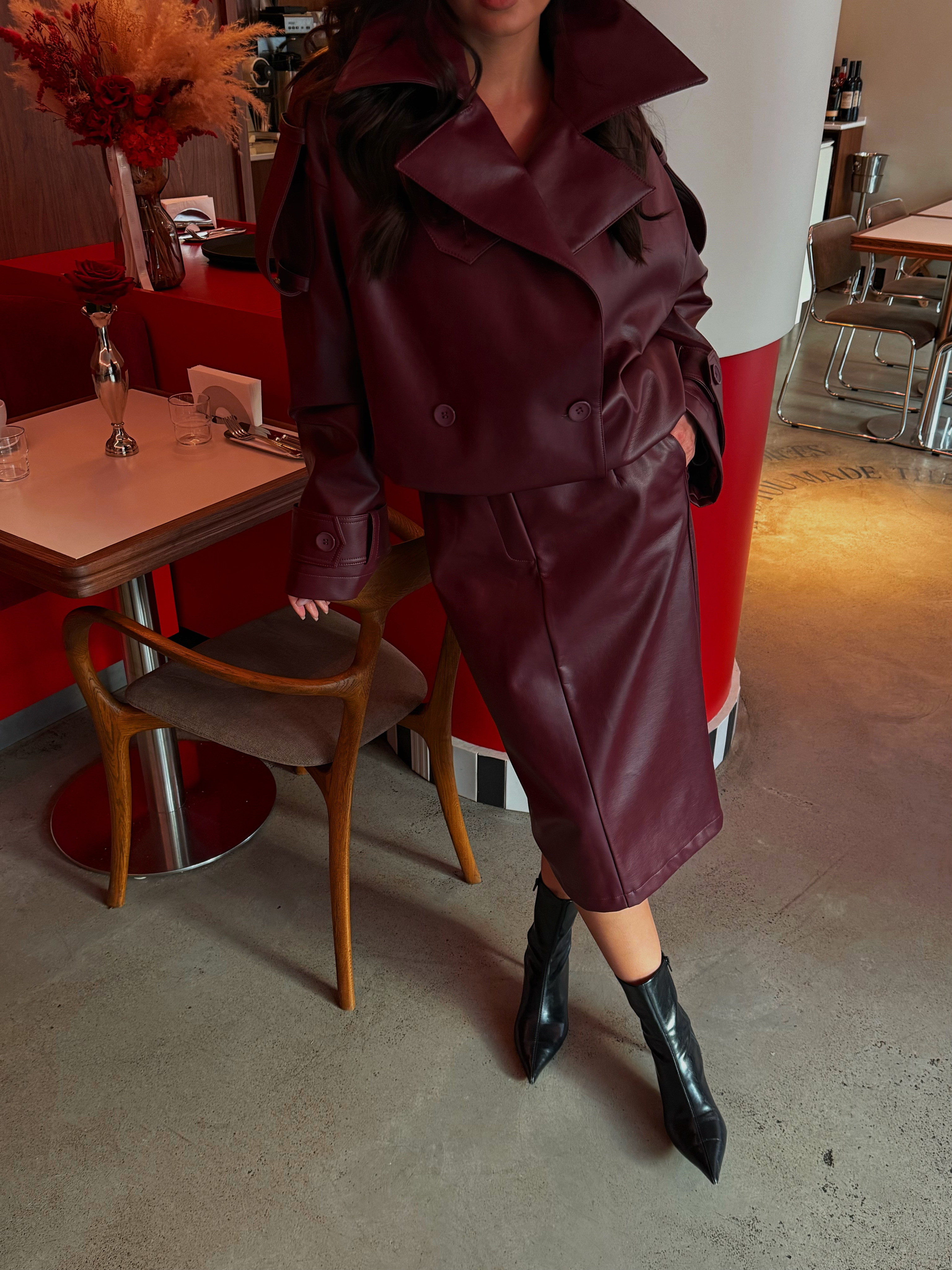 Юбка из эко-кожи насыщенного бордового оттенка, средней длины (миди), с высокой посадкой. Прямой фасон лаконично подчёркивает фигуру, создавая элегантный, современный образ. Без лишнего декора, с акцентом на стильный материал и чистые линии. Застёжка спереди на потайную молнию, возможны боковые карманы. Идеально сочетается с рубашками, свитерами и жакетами — отличный выбор как для офисных будней, так и для стильных вечерних выходов.