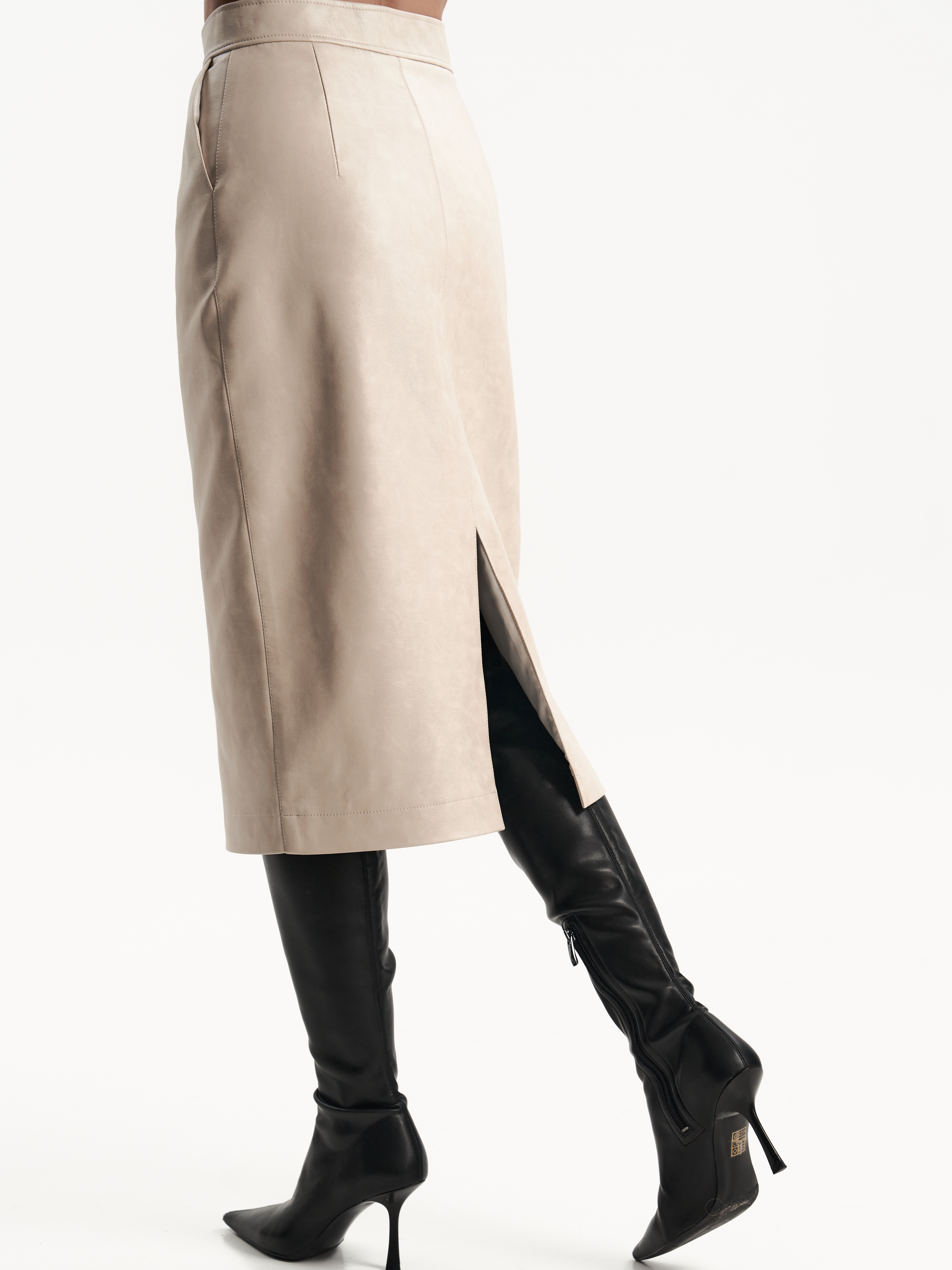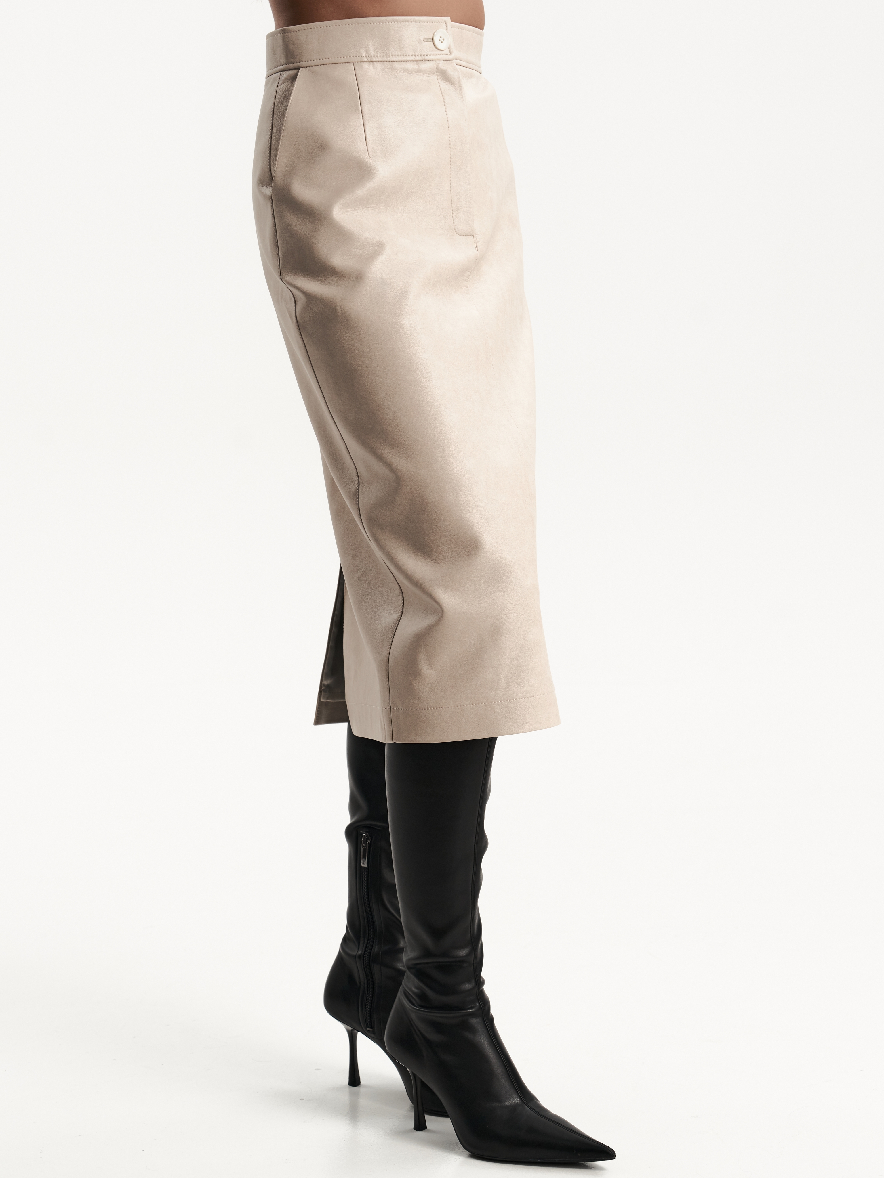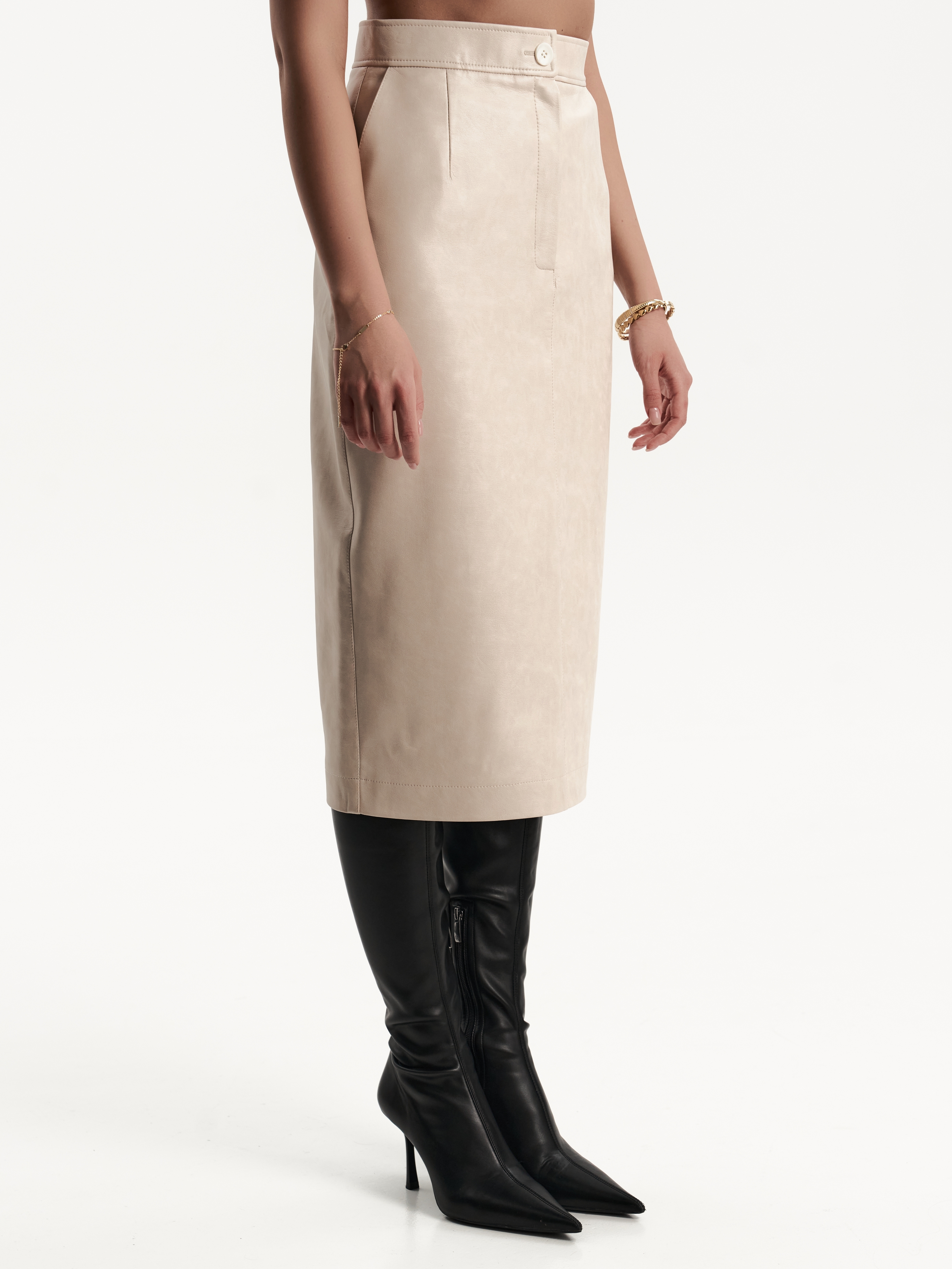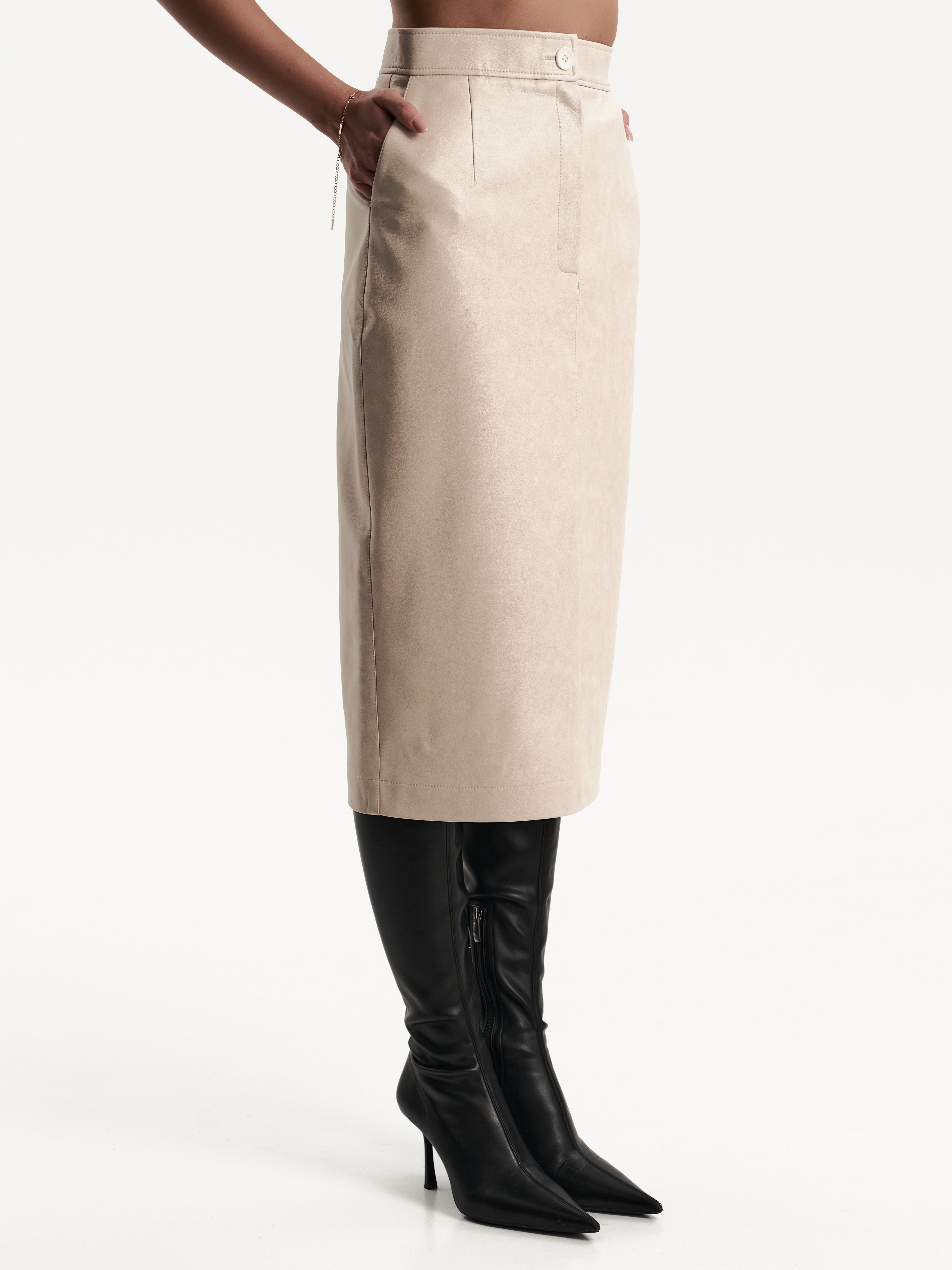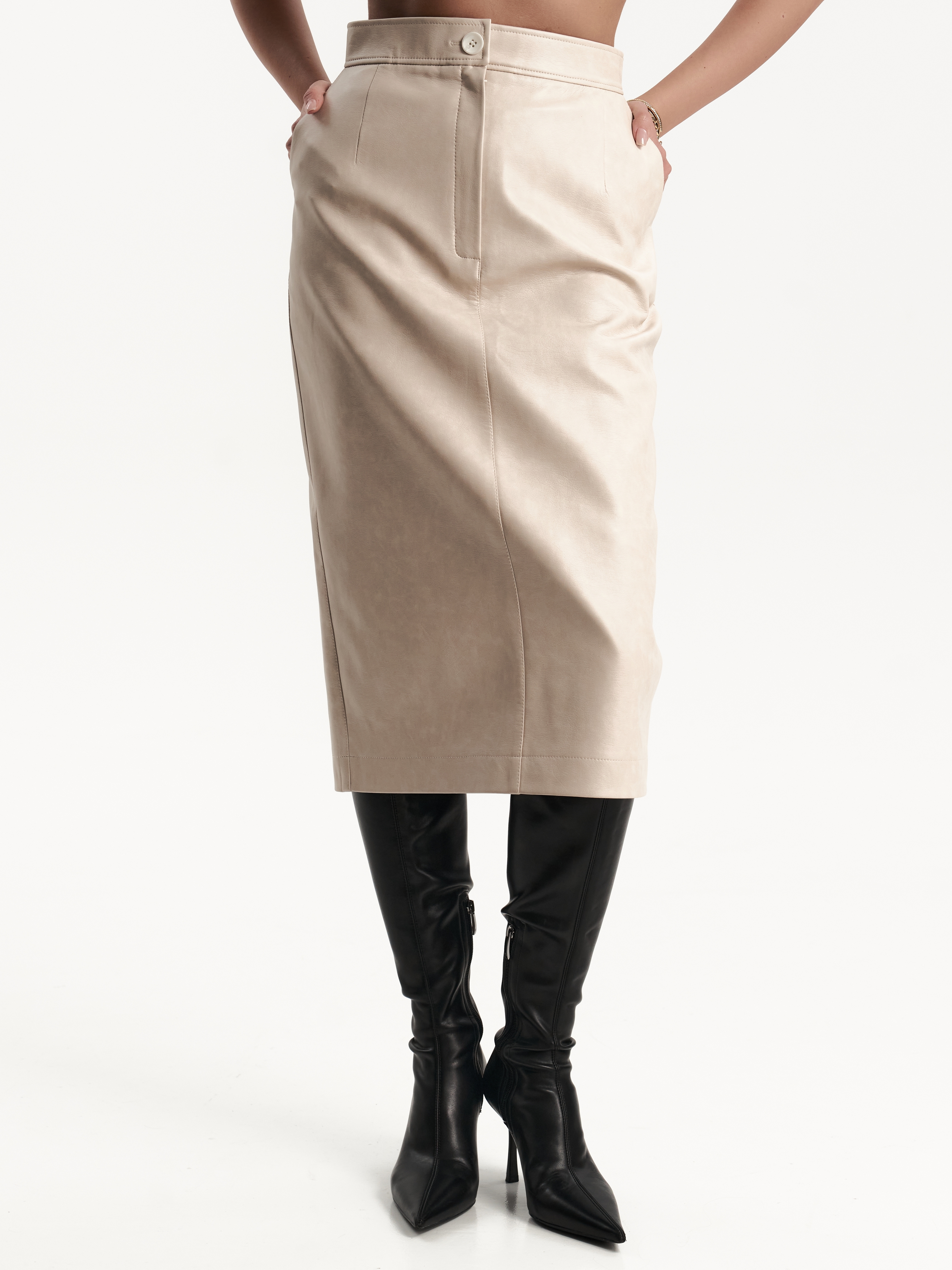 Элегантная прямая юбка миди длины выполнена из гладкой молочно-бежевой ткани. Лаконичный крой без лишних деталей подчеркивает женственность и строгость образа. Высокая посадка акцентирует талию, а классическая длина делает юбку универсальной для различных повседневных и деловых комплектов. Юбка идеально сидит по фигуре, сохраняя стильный и утончённый вид.