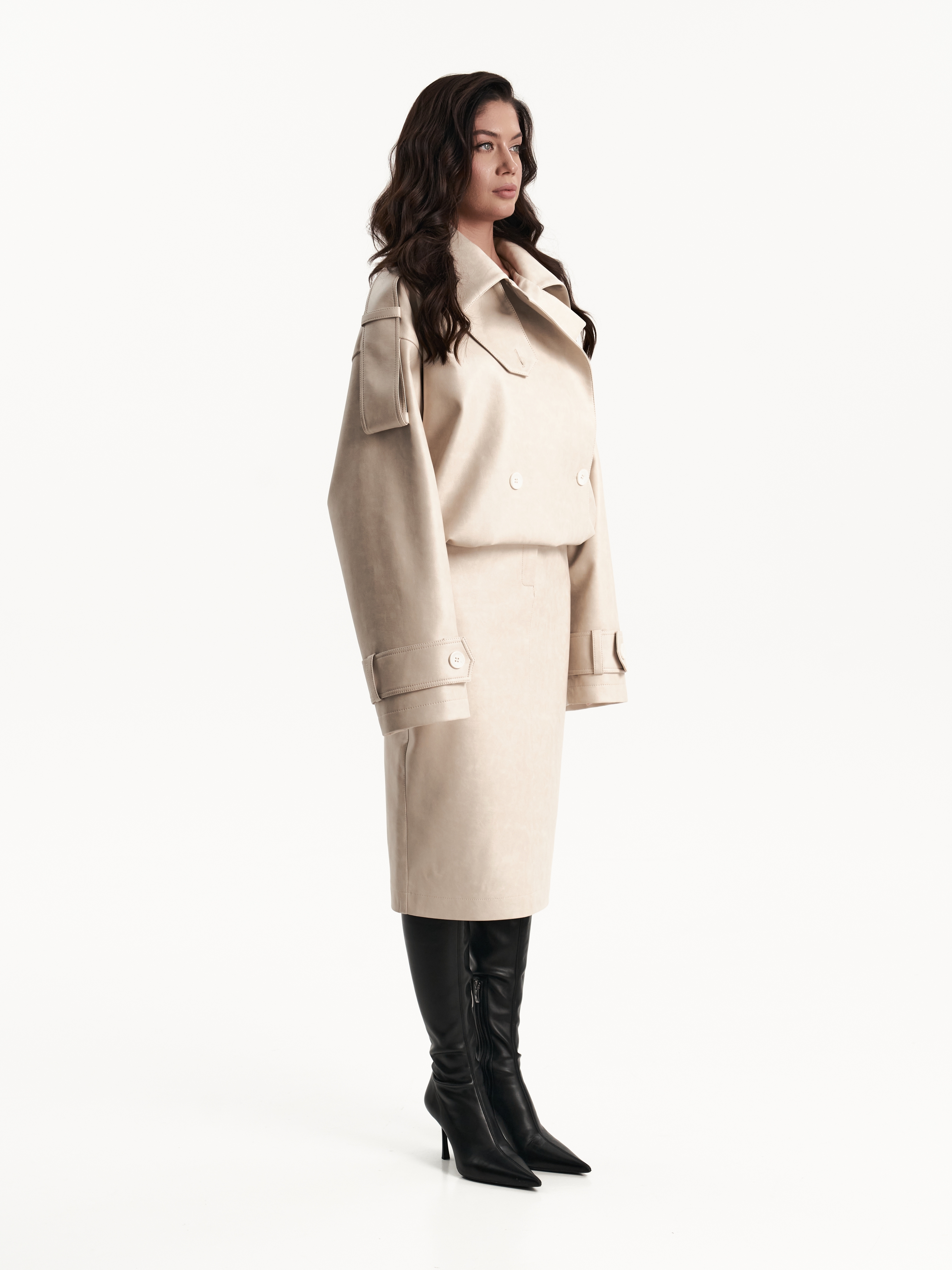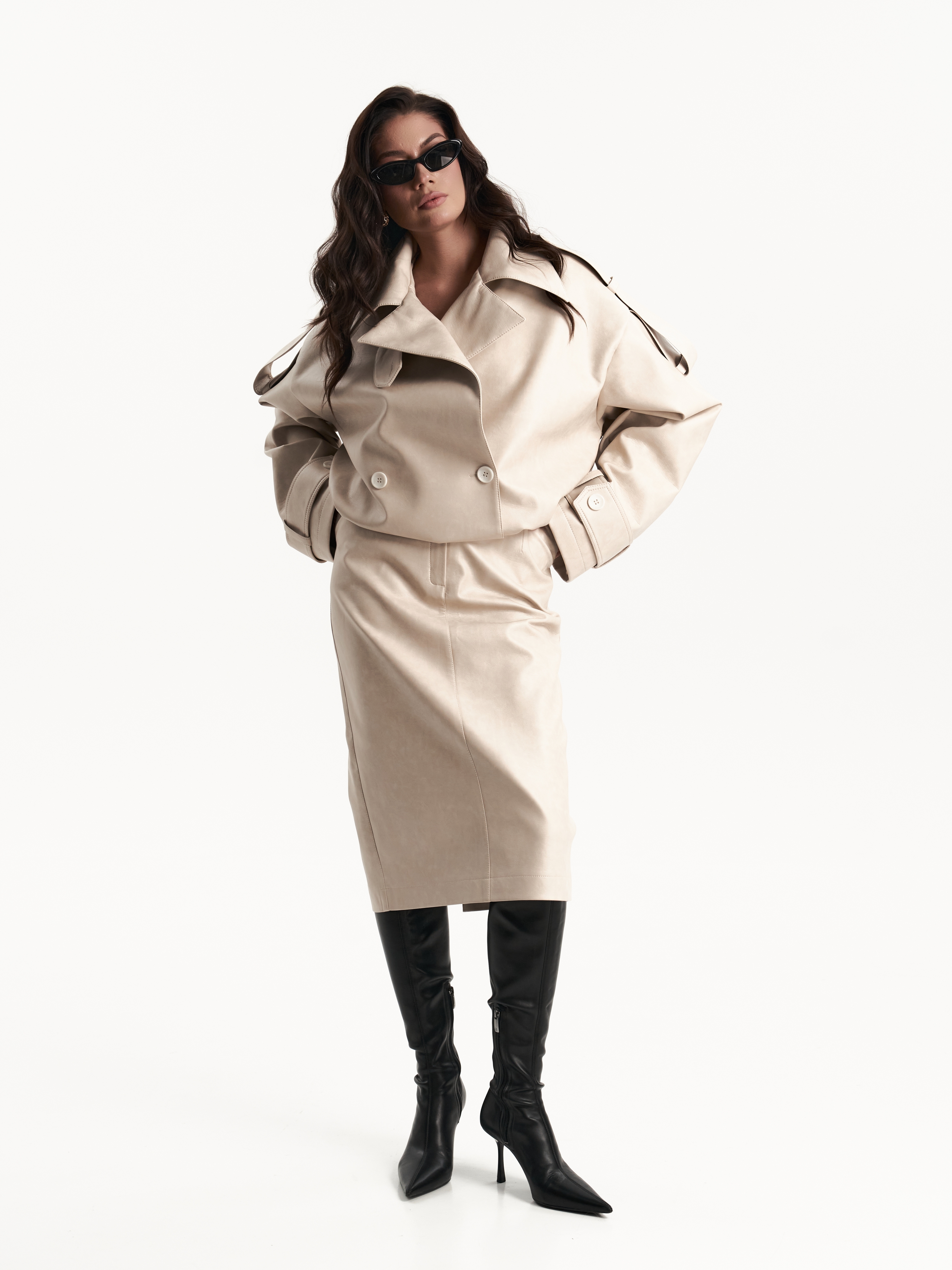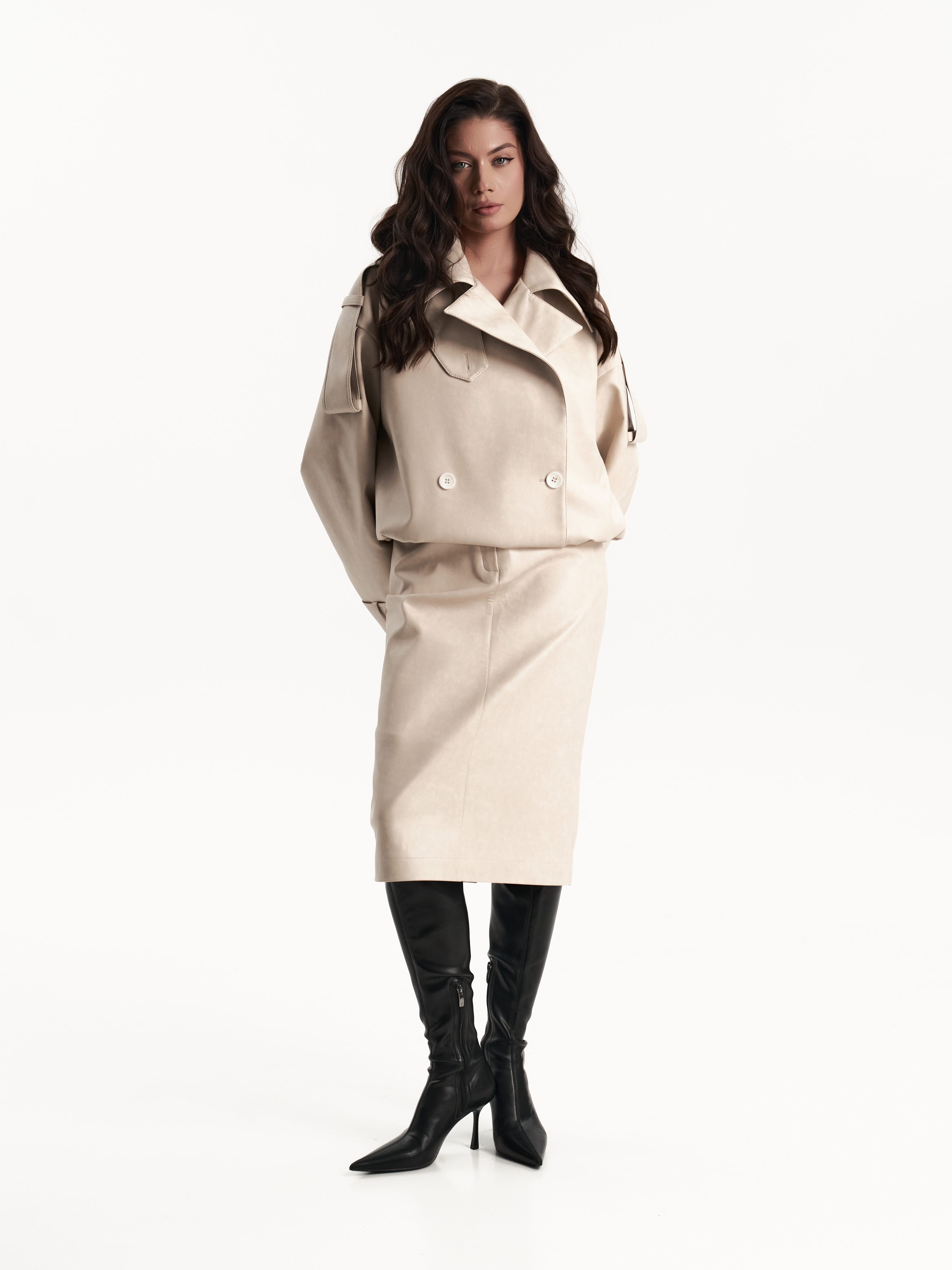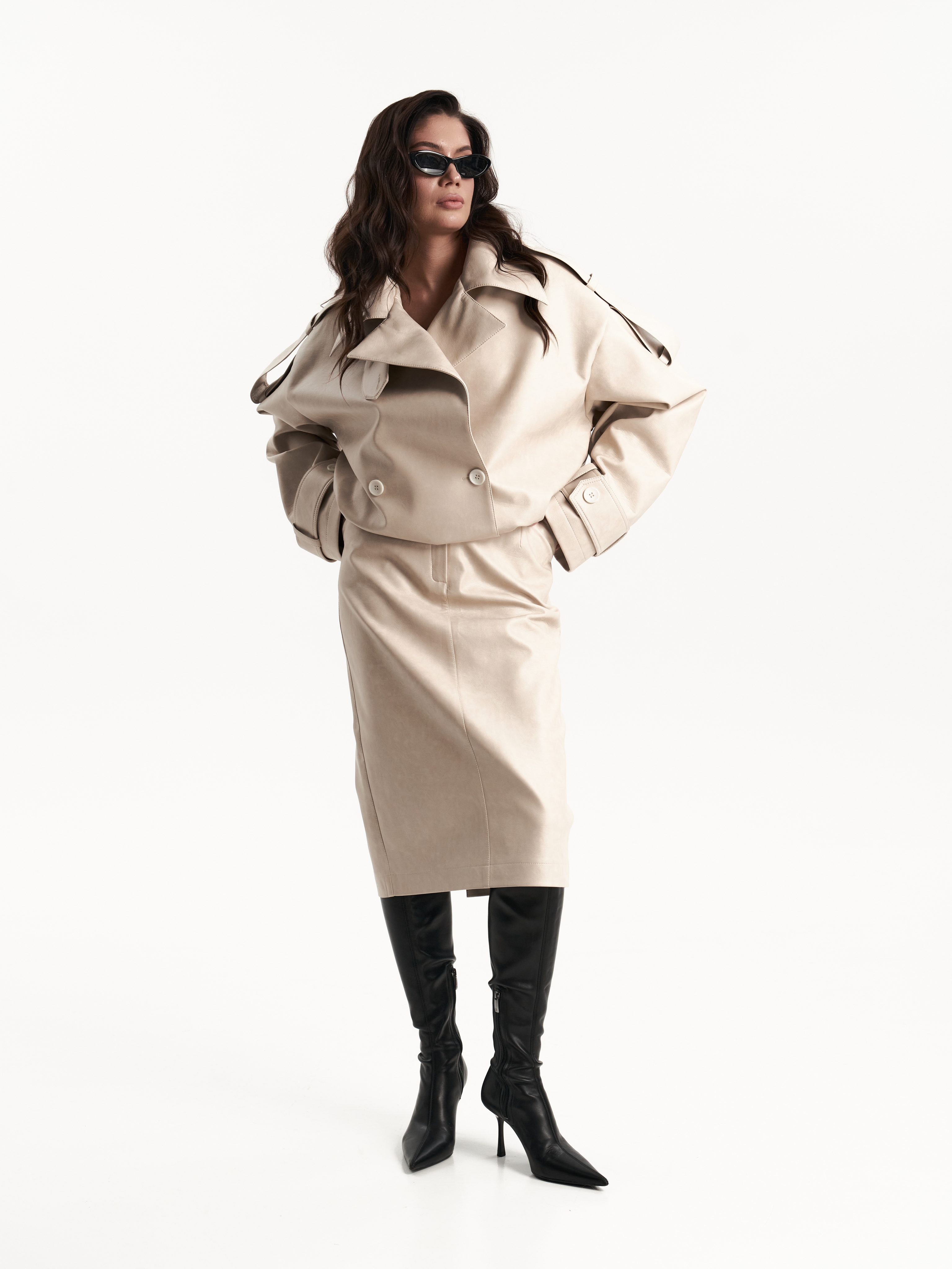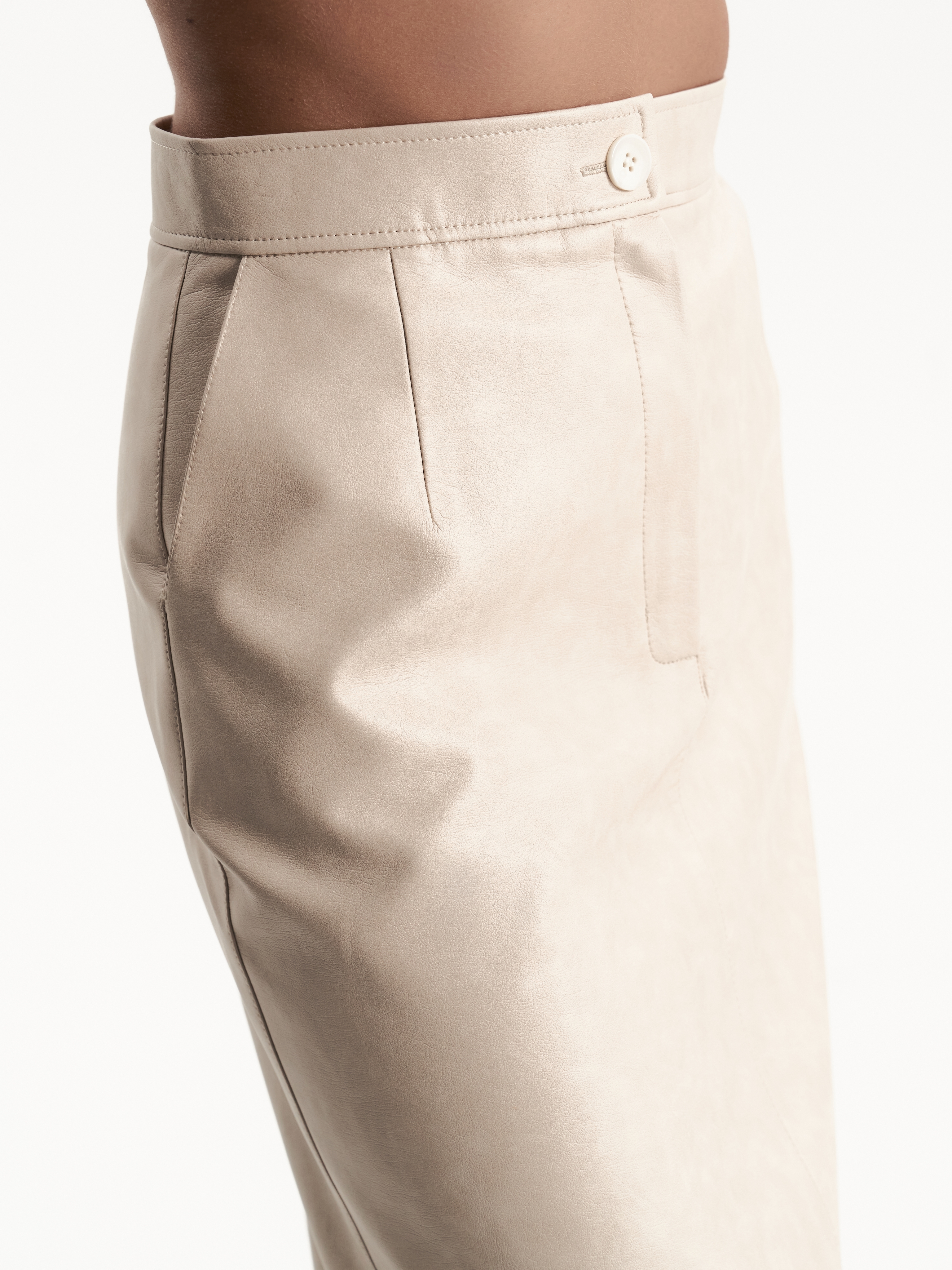 Элегантная прямая юбка миди длины выполнена из гладкой молочно-бежевой ткани. Лаконичный крой без лишних деталей подчеркивает женственность и строгость образа. Высокая посадка акцентирует талию, а классическая длина делает юбку универсальной для различных повседневных и деловых комплектов. Юбка идеально сидит по фигуре, сохраняя стильный и утончённый вид.