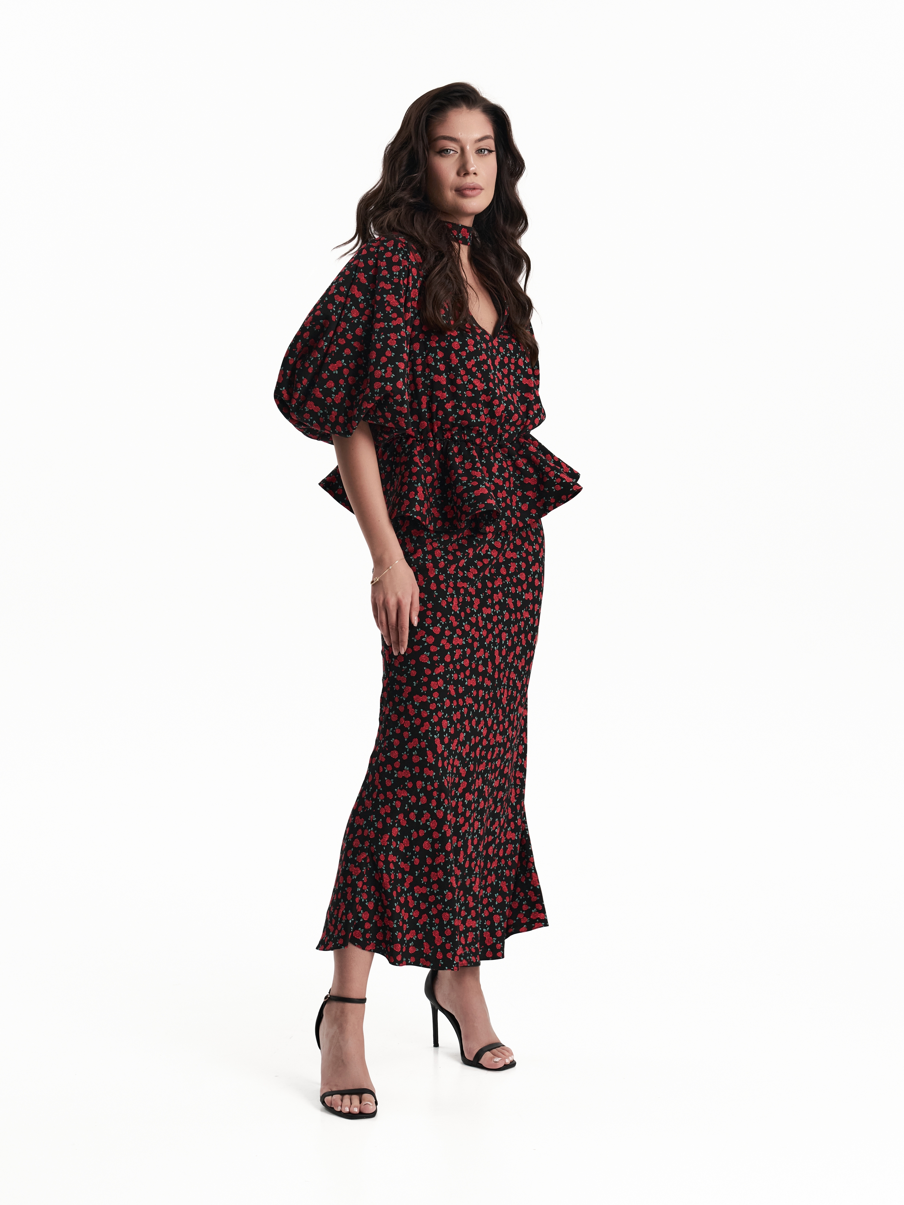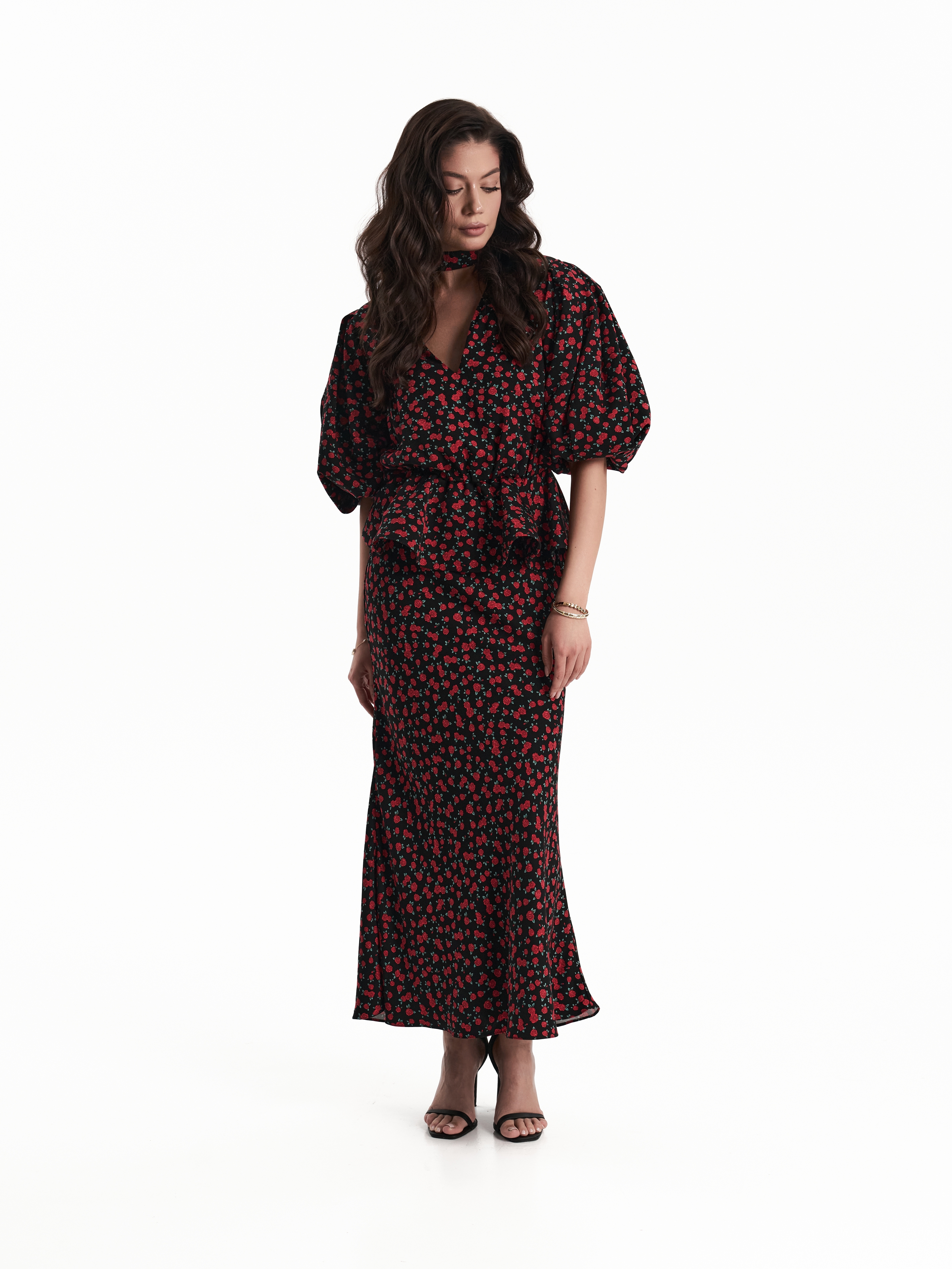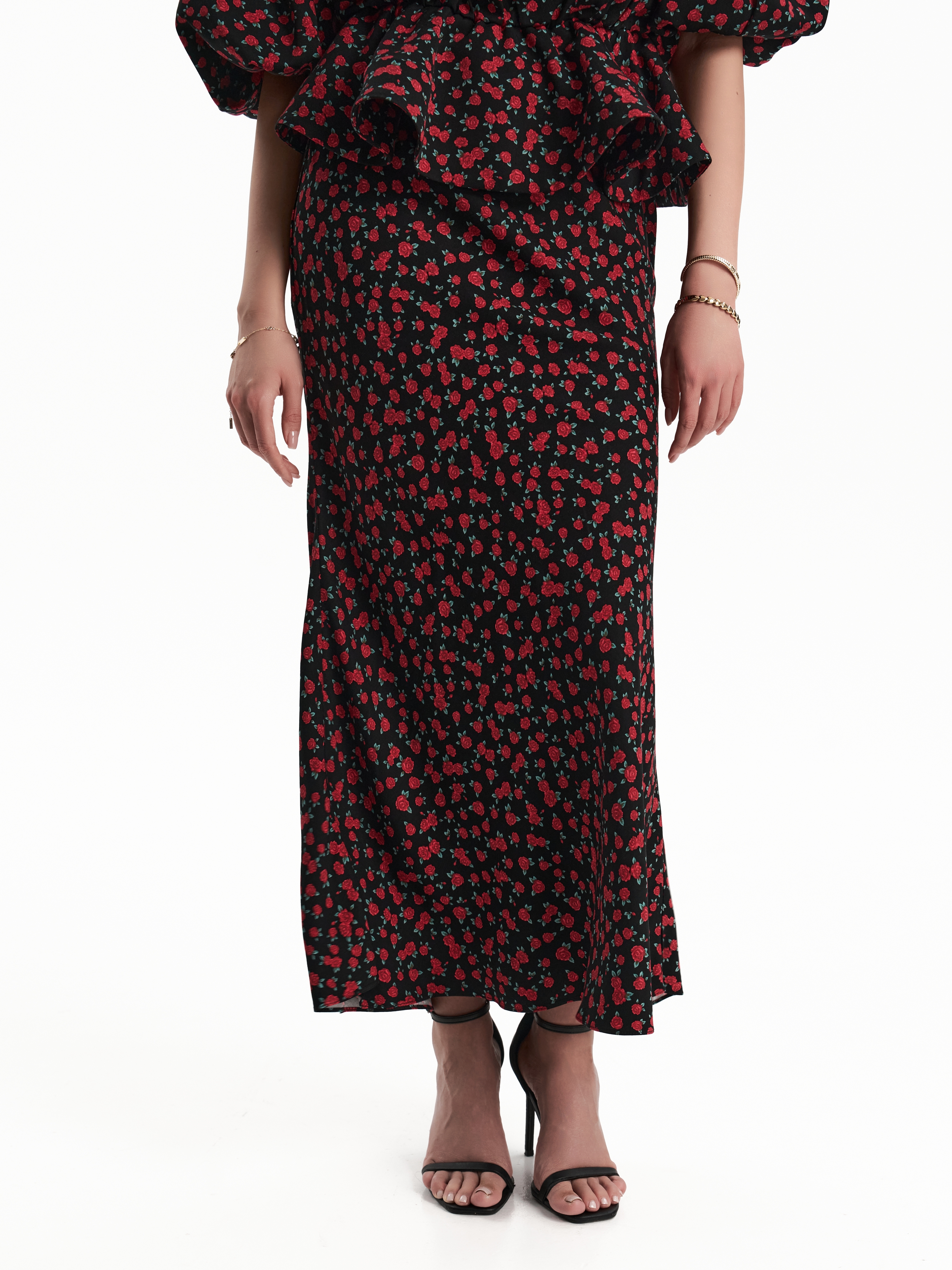 Юбка миди длины выполнена из лёгкой ткани чёрного цвета с мелким цветочным принтом в красных и зелёных тонах. Модель прямая, элегантно облегает силуэт, подчёркивая фигуру. За счёт универсального фасона юбку можно сочетать как с романтичными блузками, так и с лаконичными топами. Яркий цветочный узор добавляет образу свежести и женственности. Данная модель прекрасно подходит для осенне-весеннего сезона.