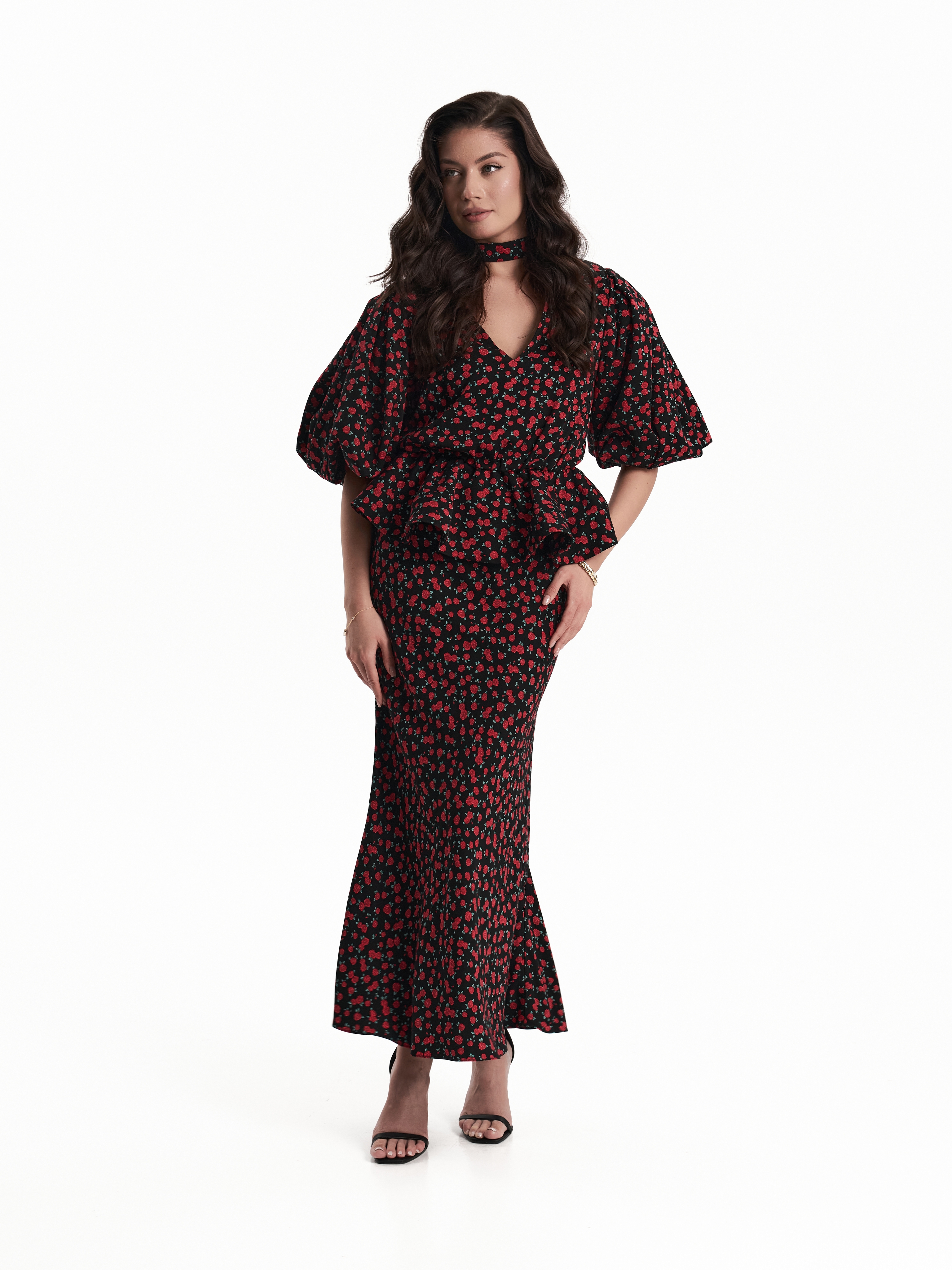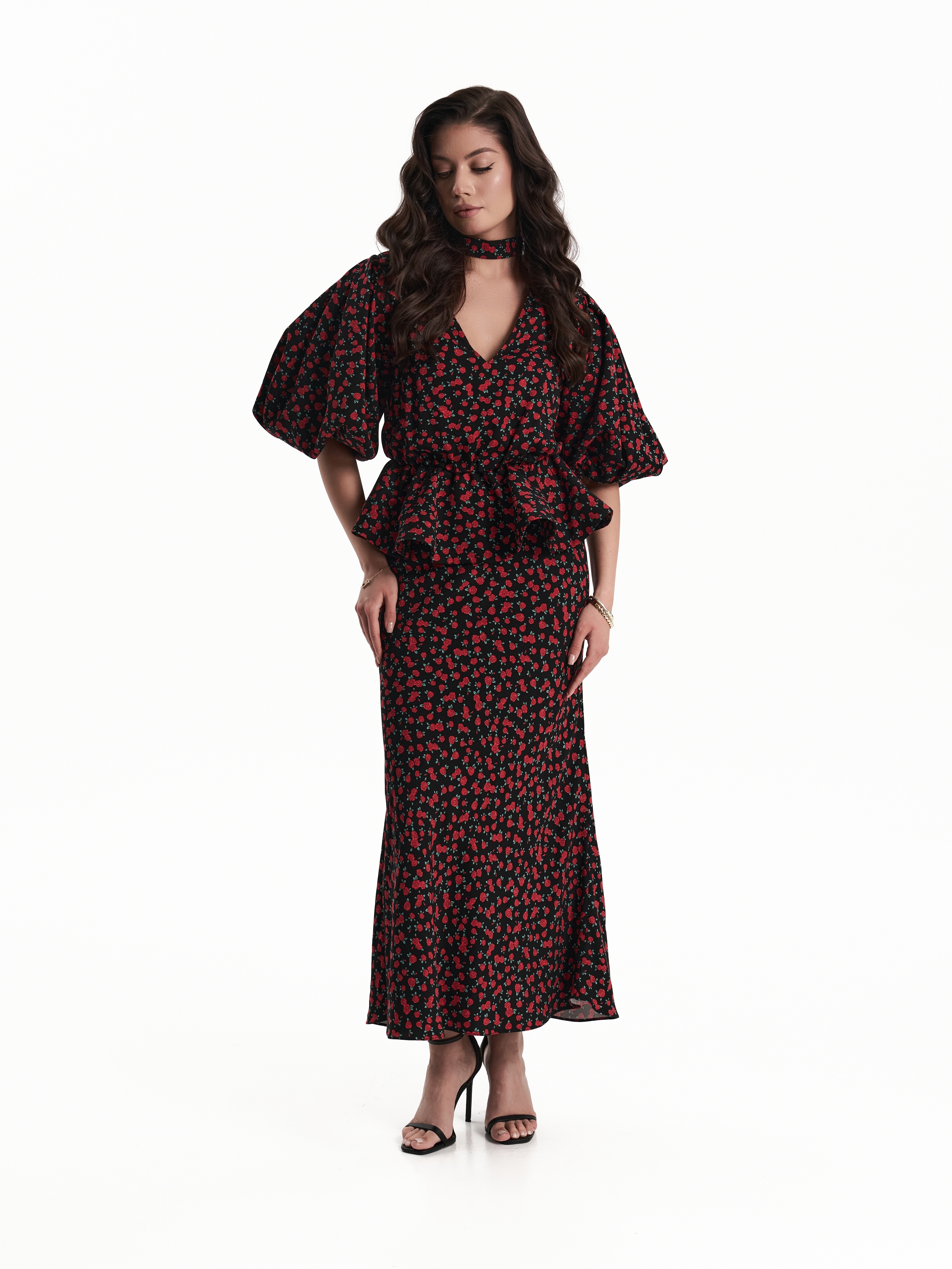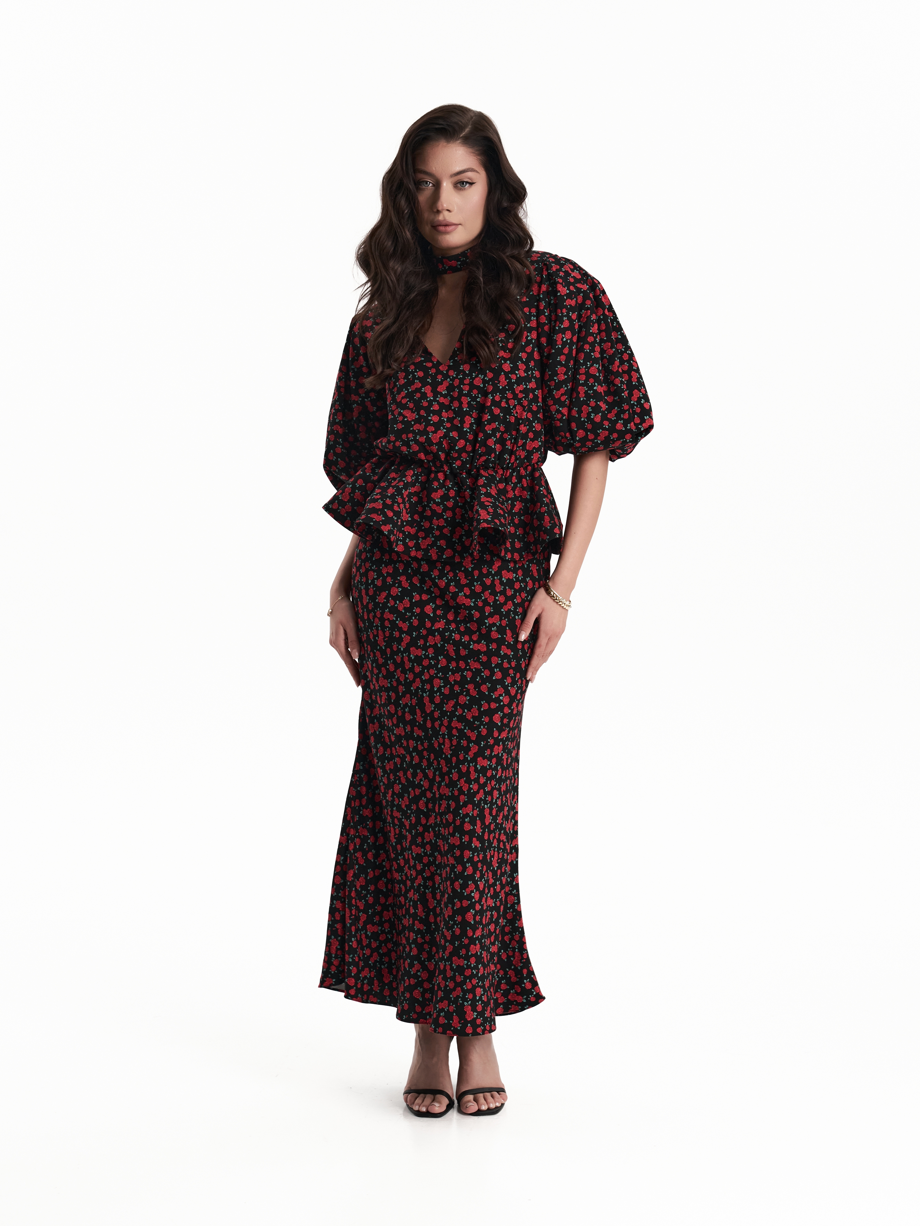 Юбка миди длины выполнена из лёгкой ткани чёрного цвета с мелким цветочным принтом в красных и зелёных тонах. Модель прямая, элегантно облегает силуэт, подчёркивая фигуру. За счёт универсального фасона юбку можно сочетать как с романтичными блузками, так и с лаконичными топами. Яркий цветочный узор добавляет образу свежести и женственности. Данная модель прекрасно подходит для осенне-весеннего сезона.