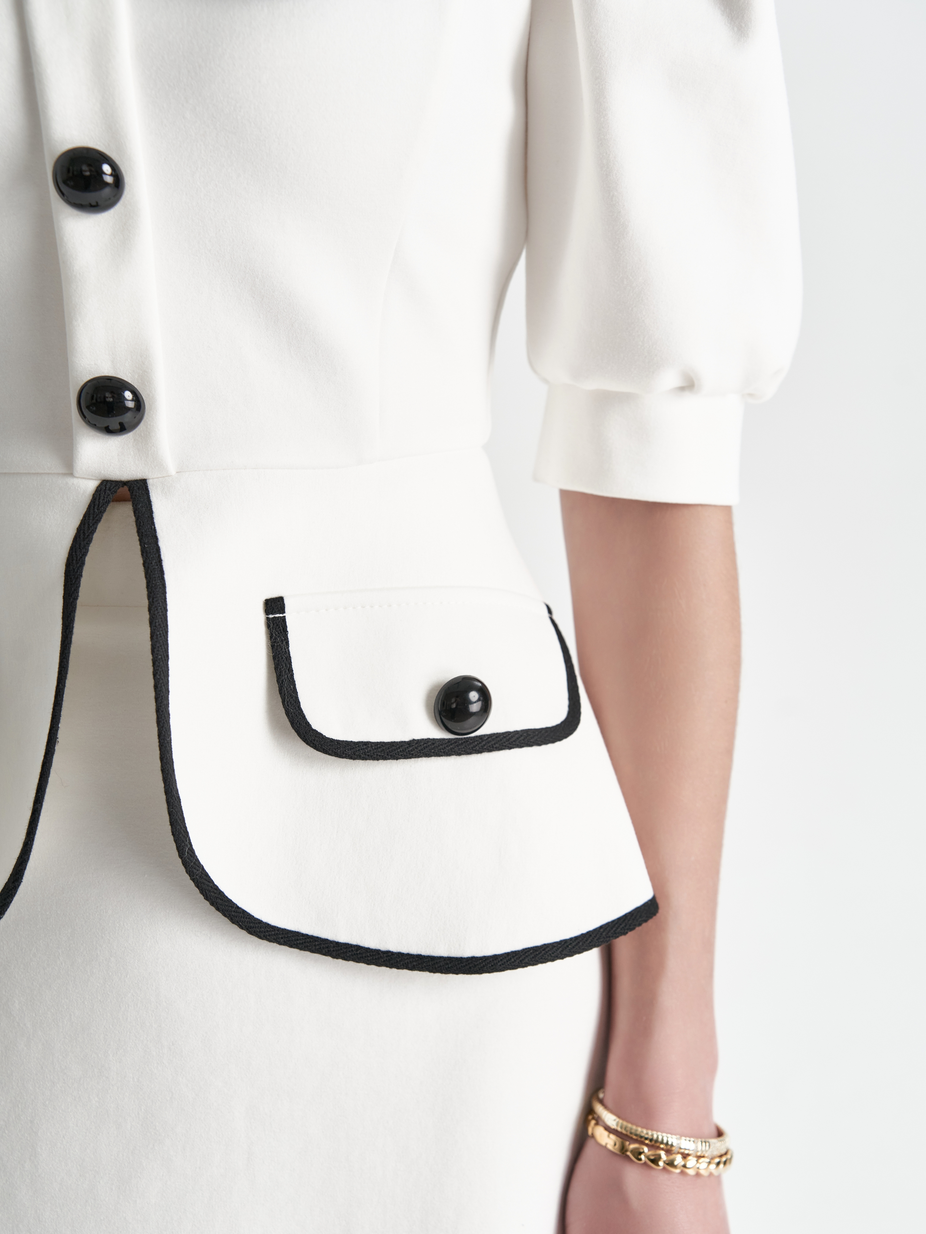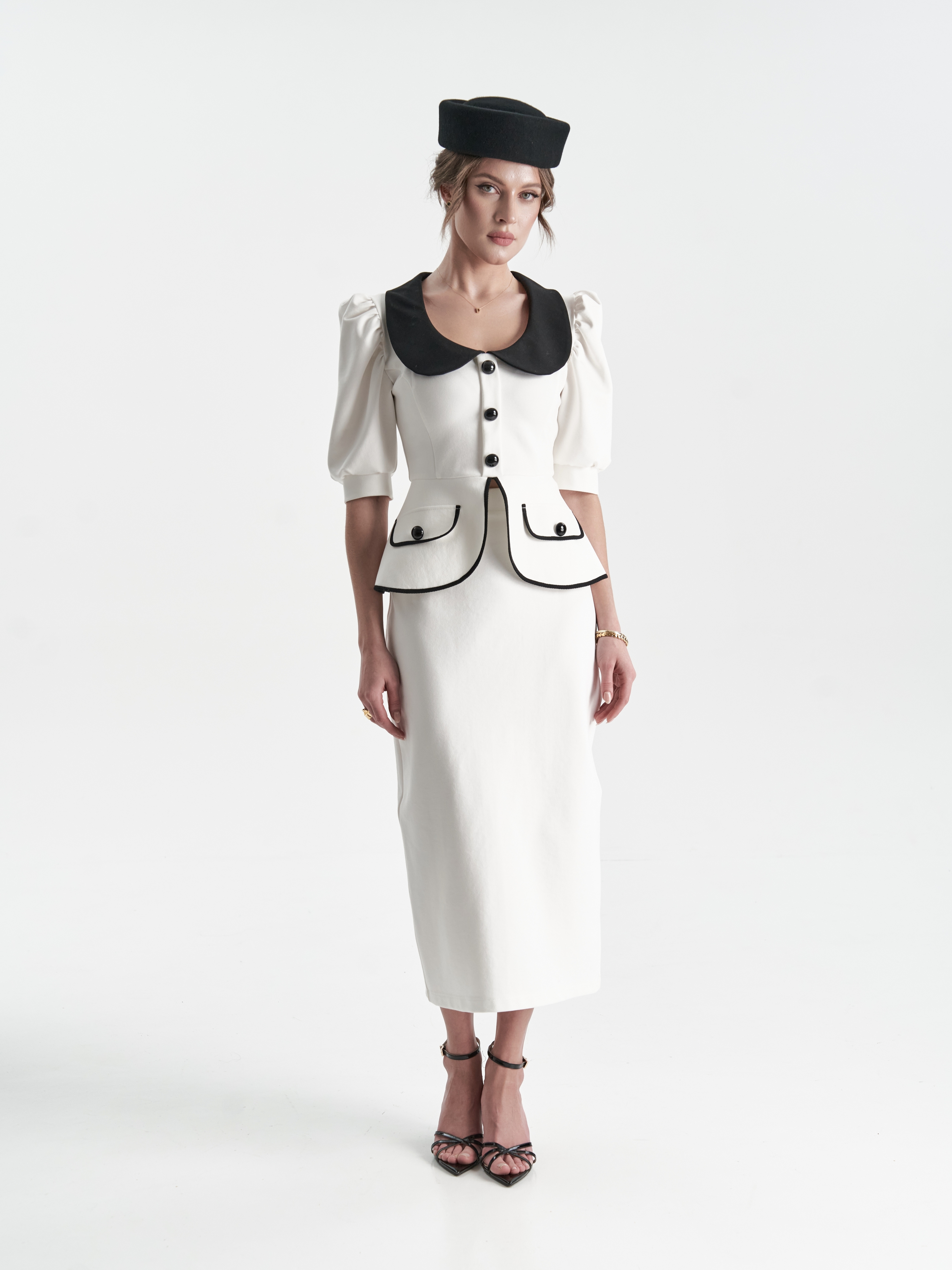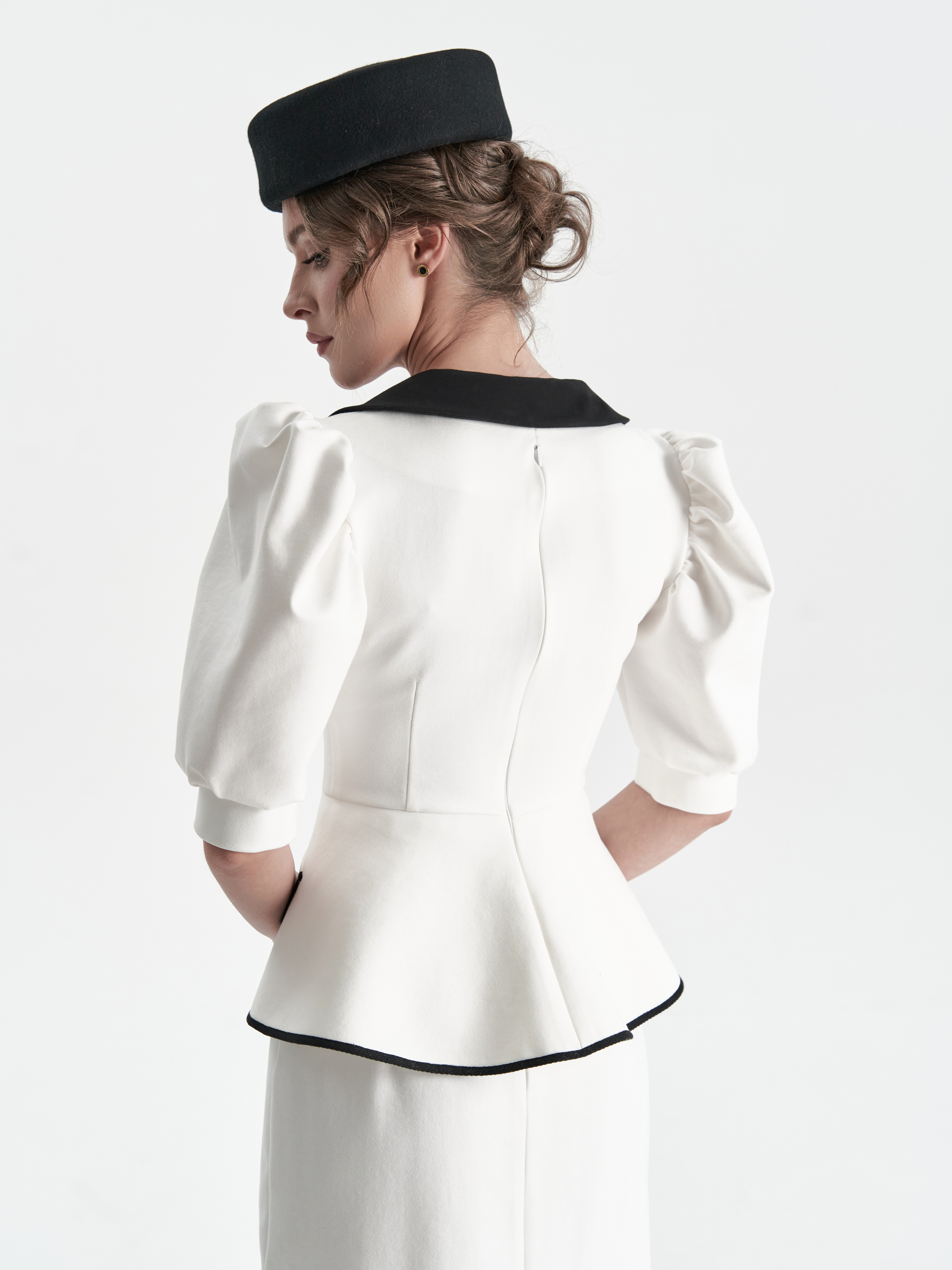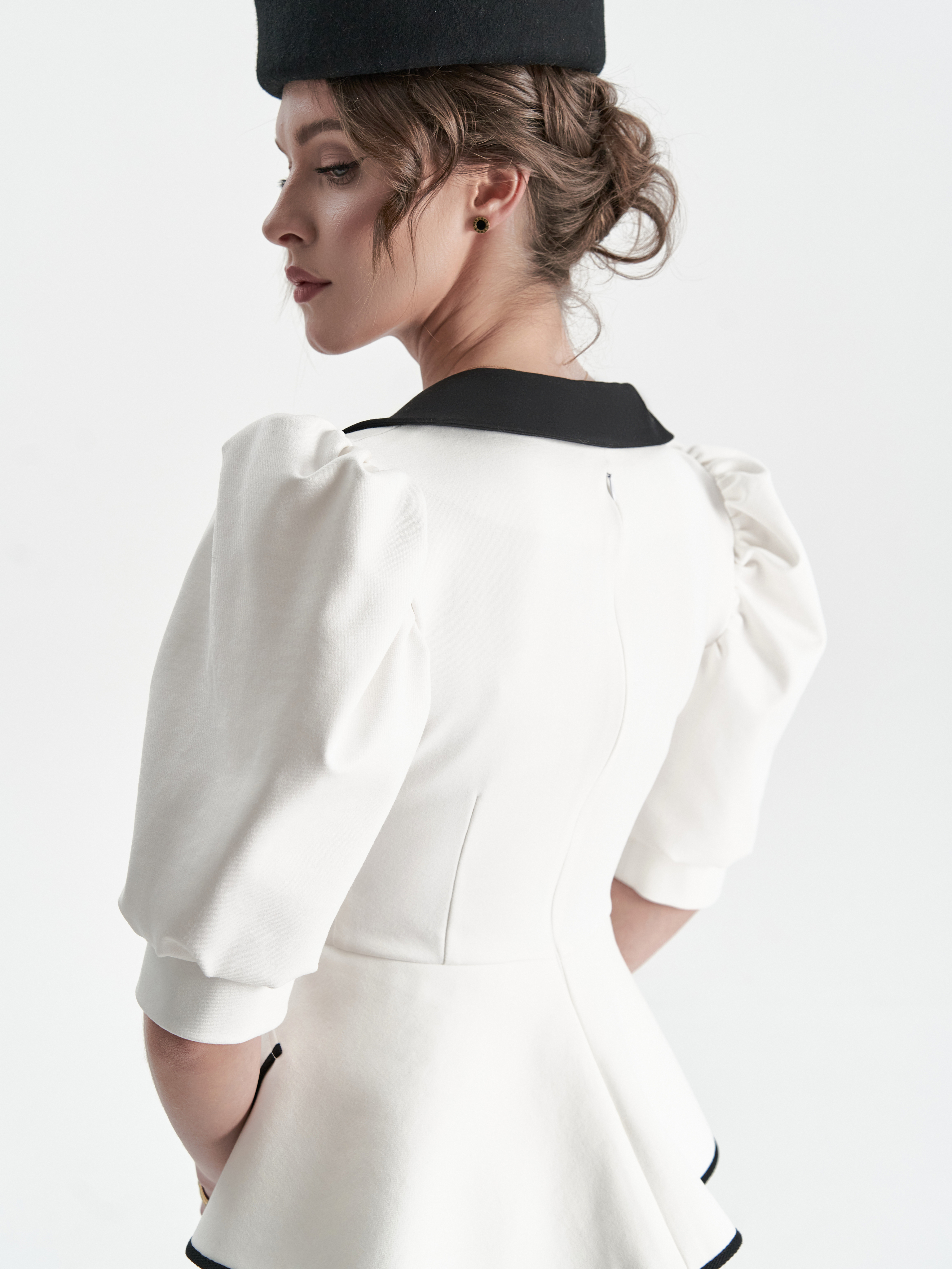 Жакет выполнен из светлой ткани и отличается элегантным кроем, подчеркивающим талию. Особенностью жакета является крупный контрастный воротник черного цвета, а также объемные рукава длиной до локтя, создающие современный и стильный образ. По линии талии расположена баска с черной окантовкой и черными пуговицами, что придаёт жакету винтажные нотки.