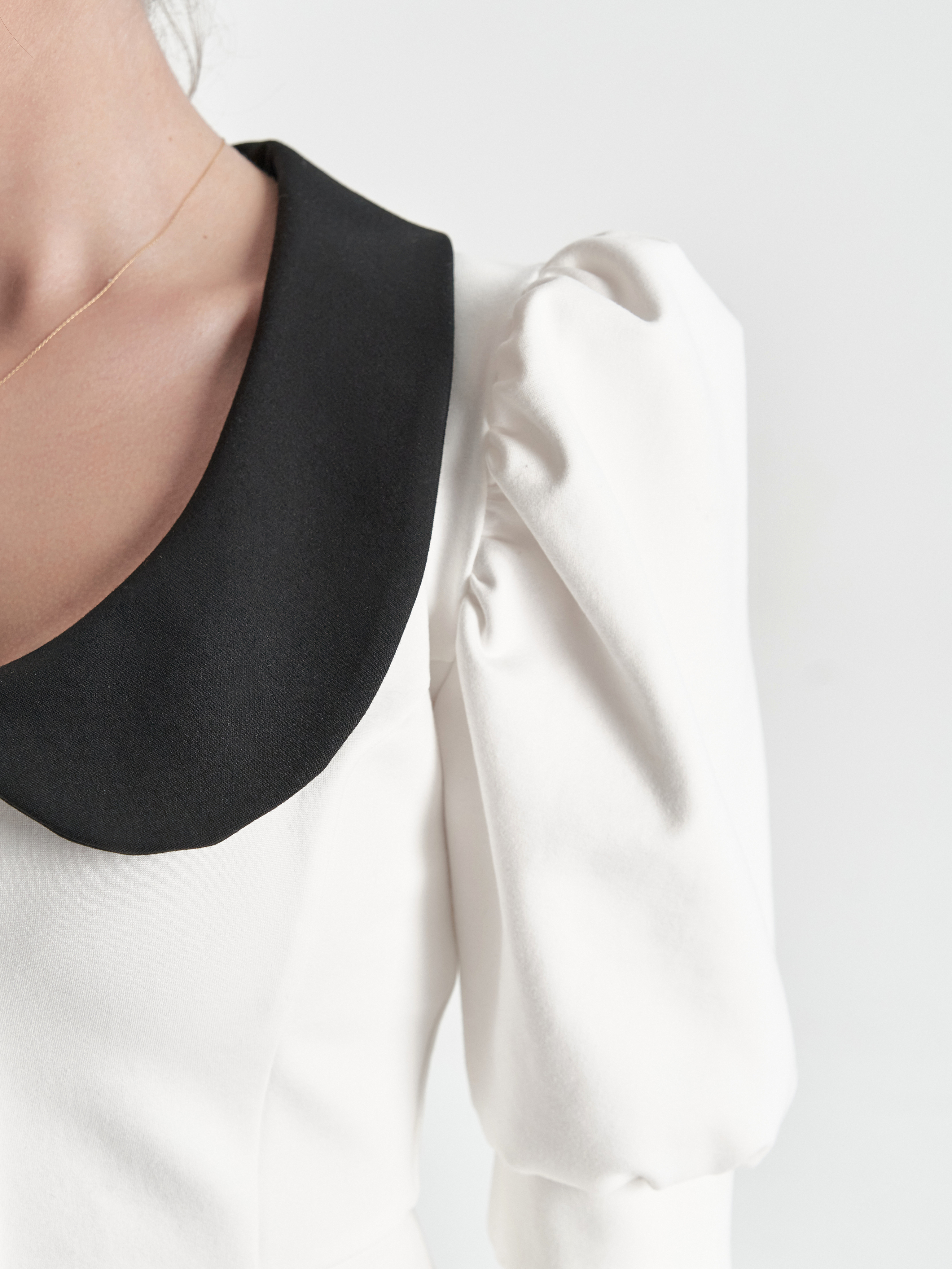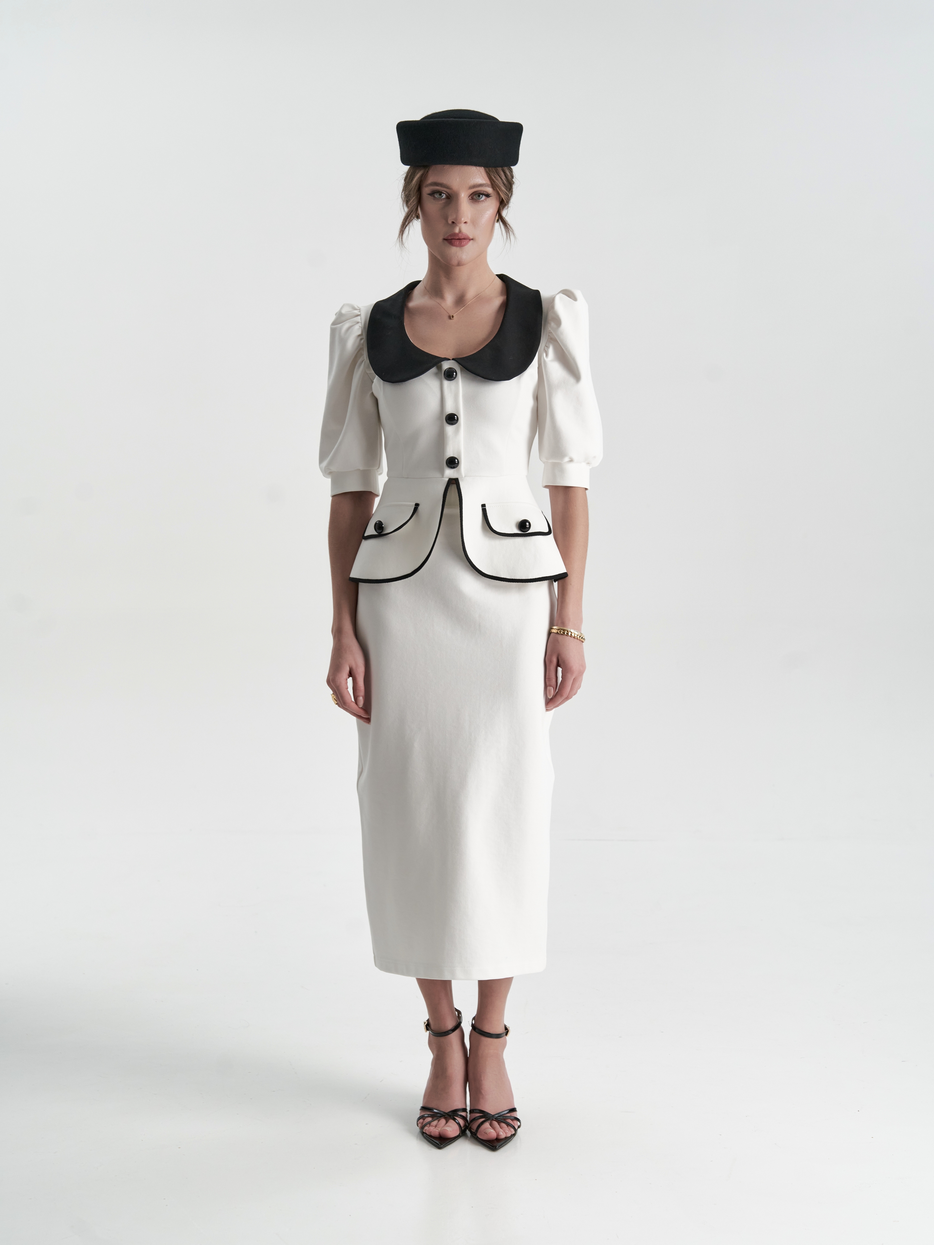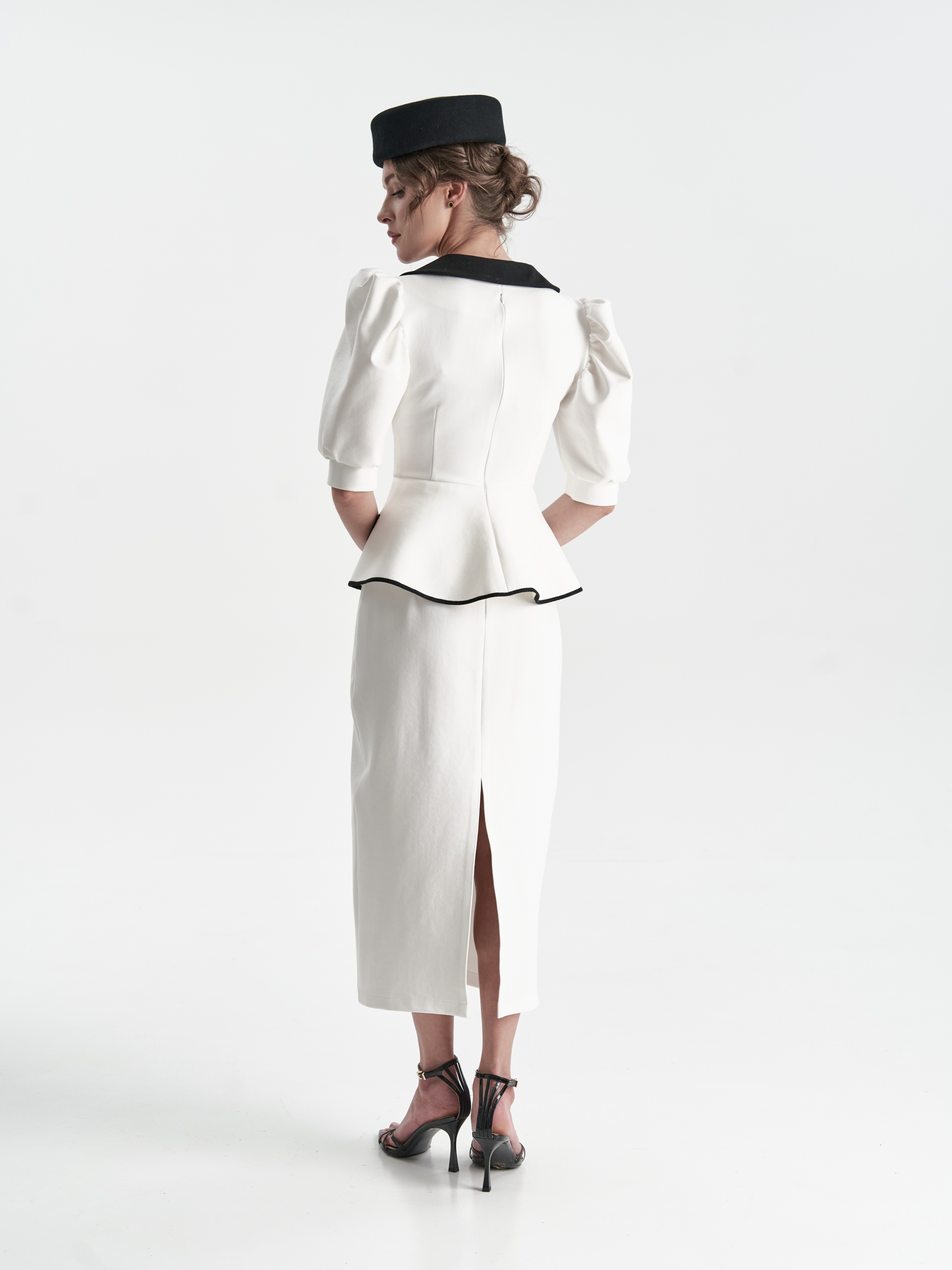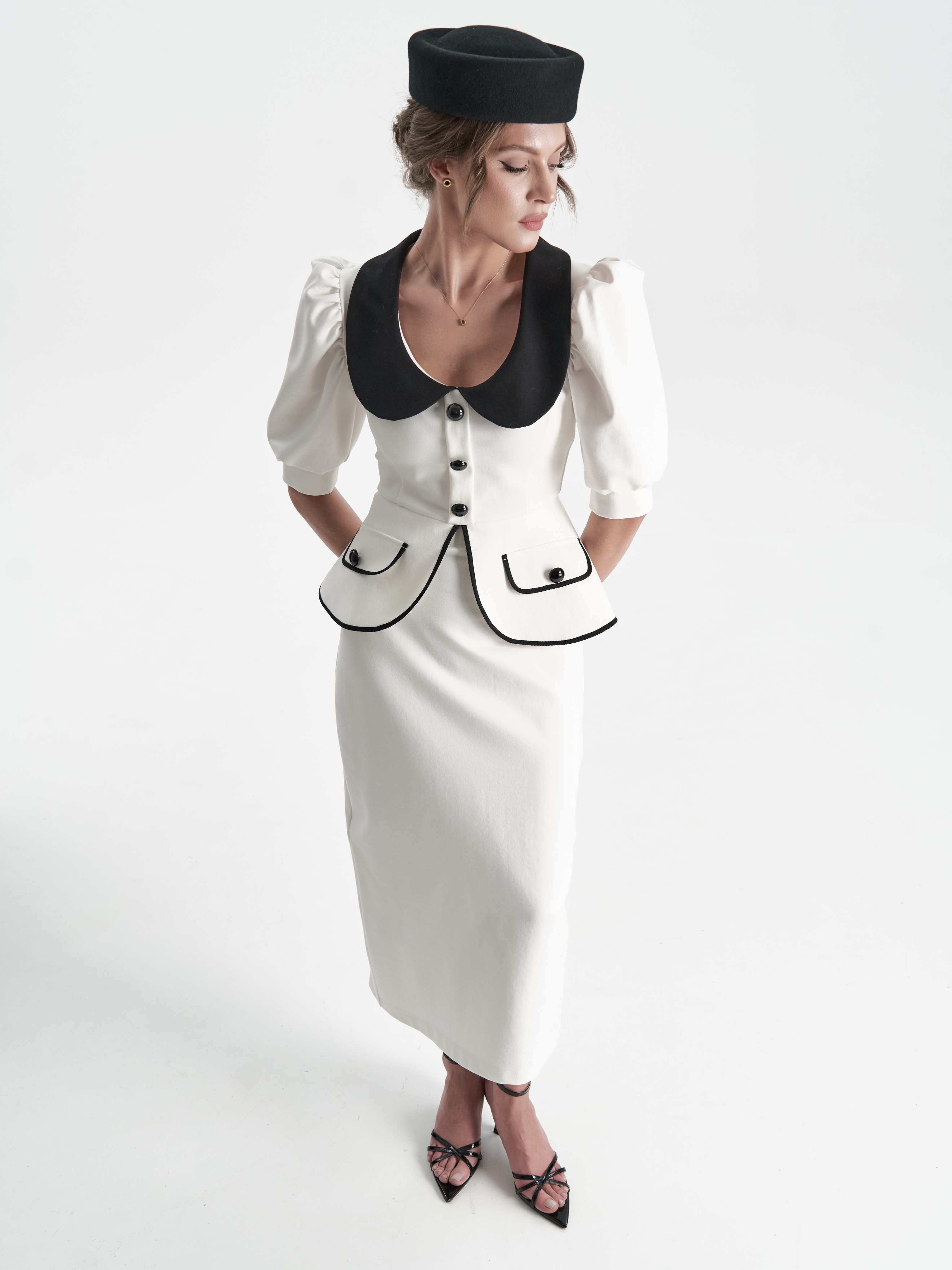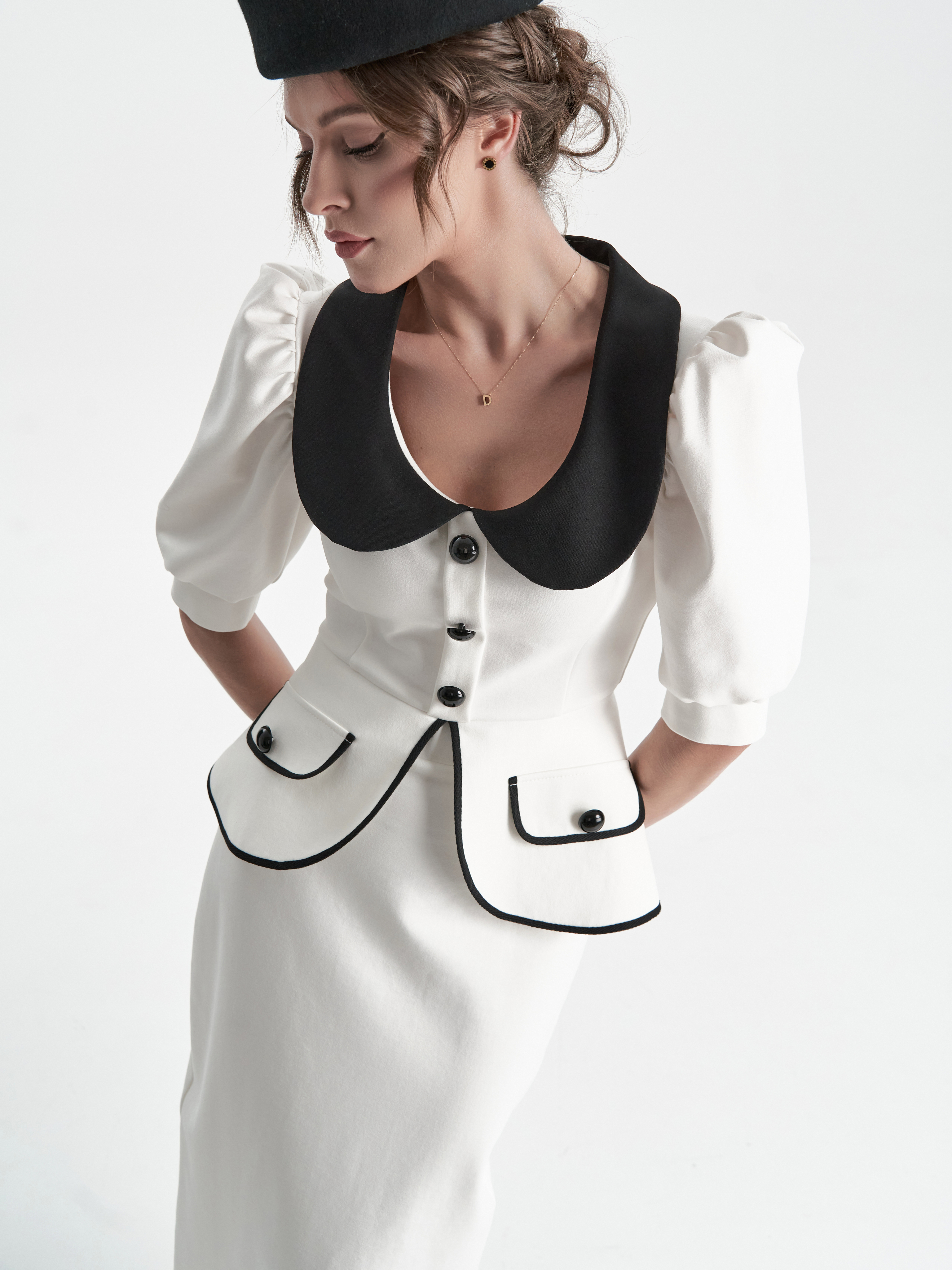 Жакет выполнен из светлой ткани и отличается элегантным кроем, подчеркивающим талию. Особенностью жакета является крупный контрастный воротник черного цвета, а также объемные рукава длиной до локтя, создающие современный и стильный образ. По линии талии расположена баска с черной окантовкой и черными пуговицами, что придаёт жакету винтажные нотки.