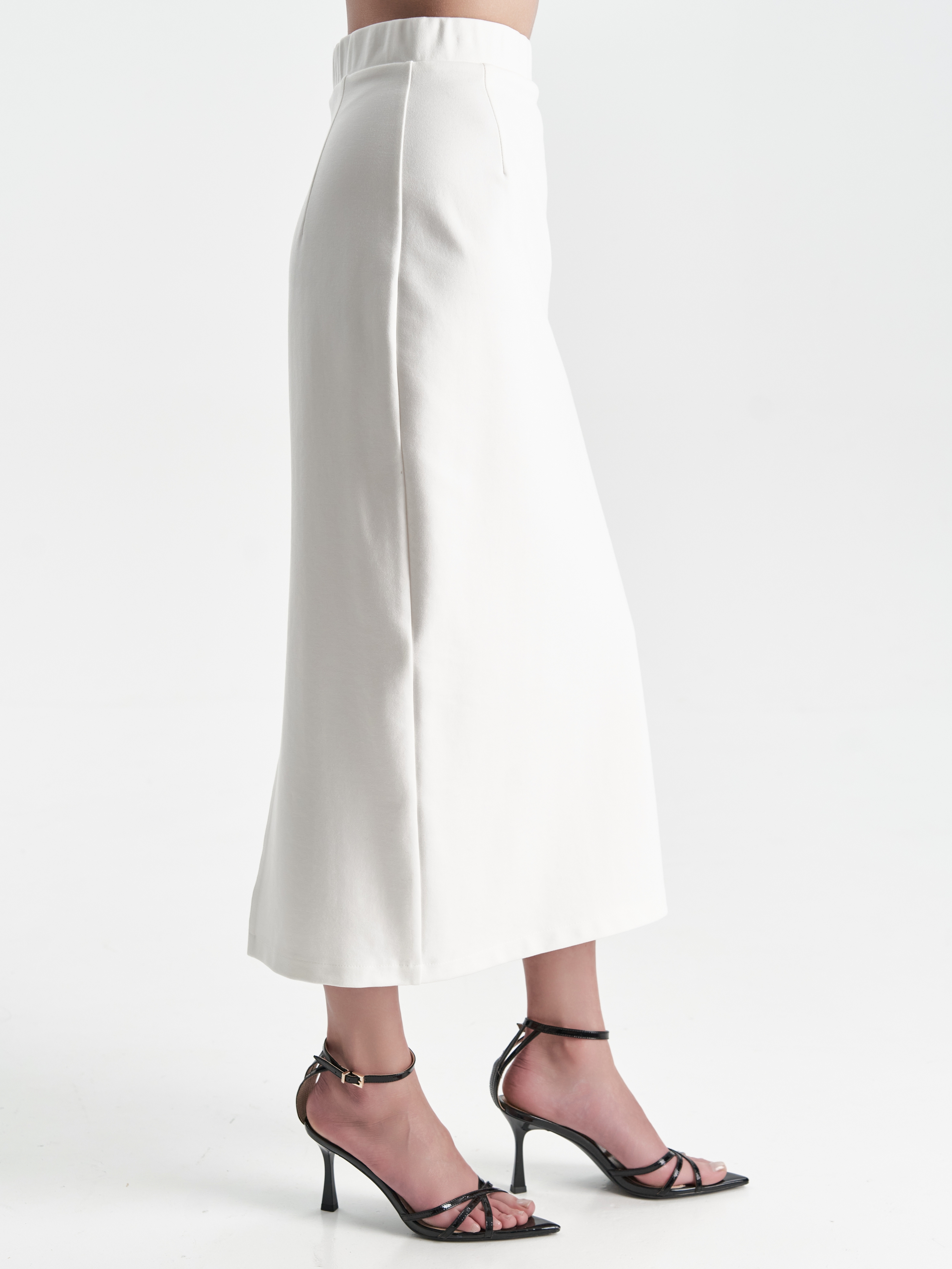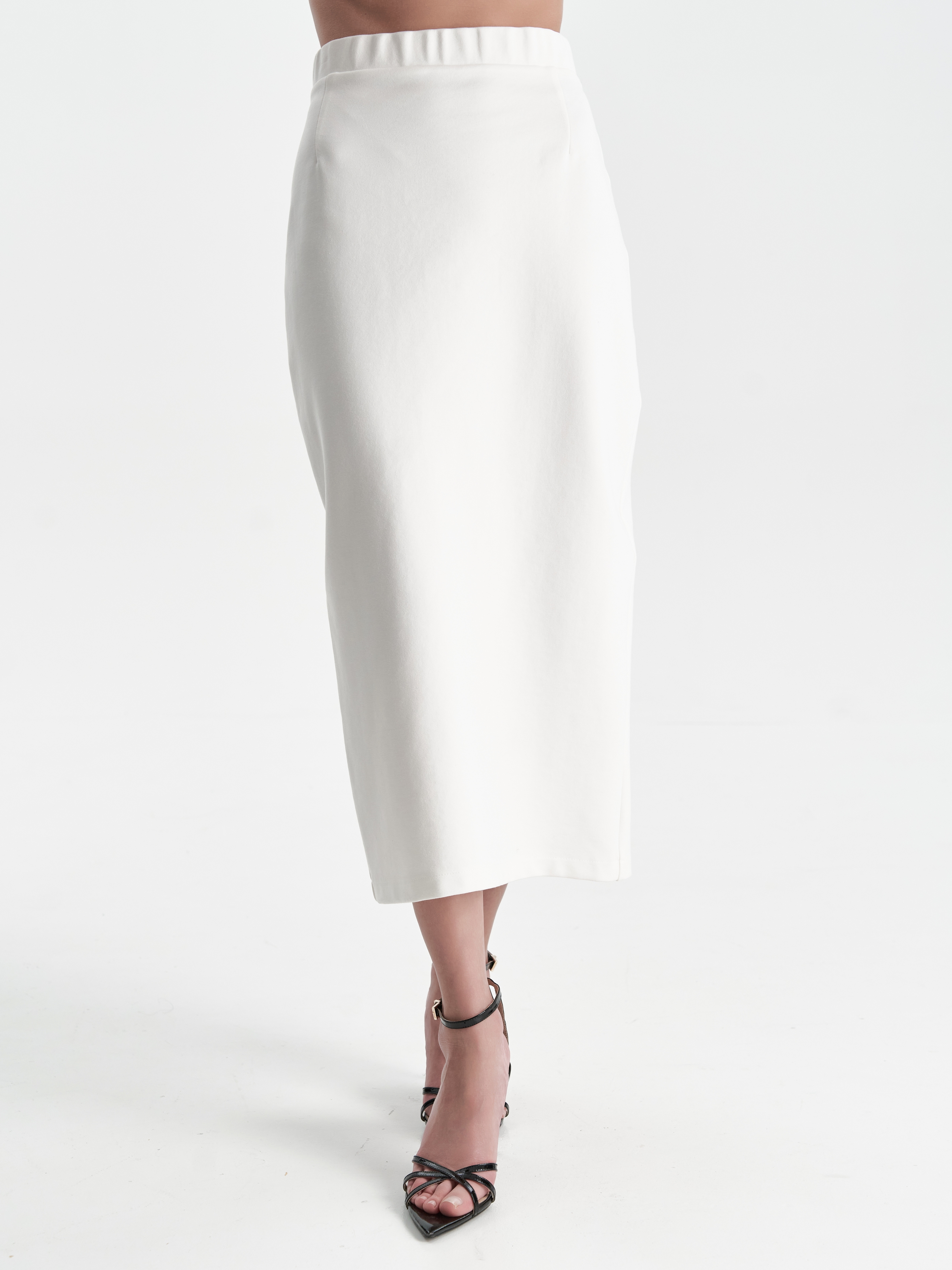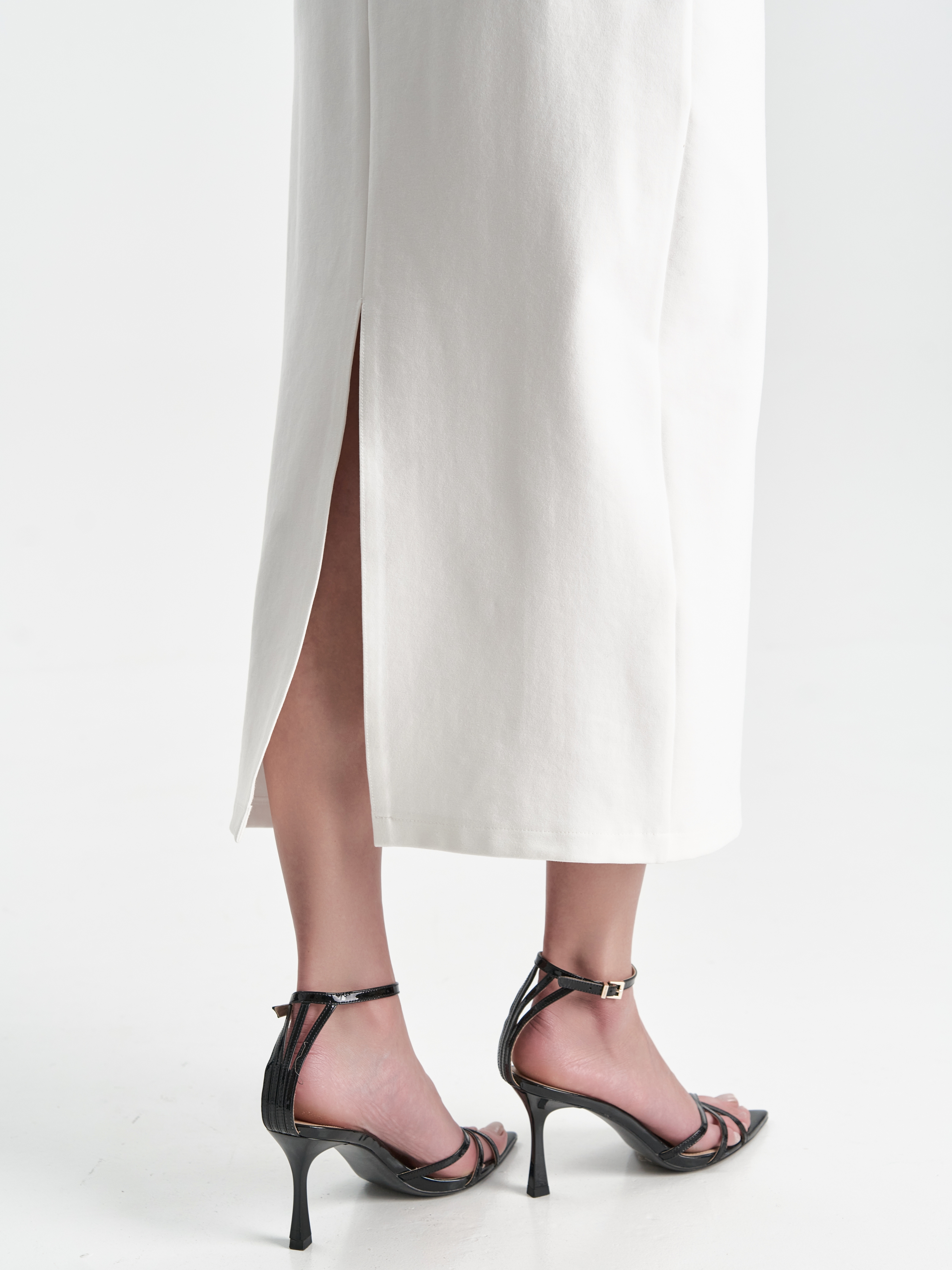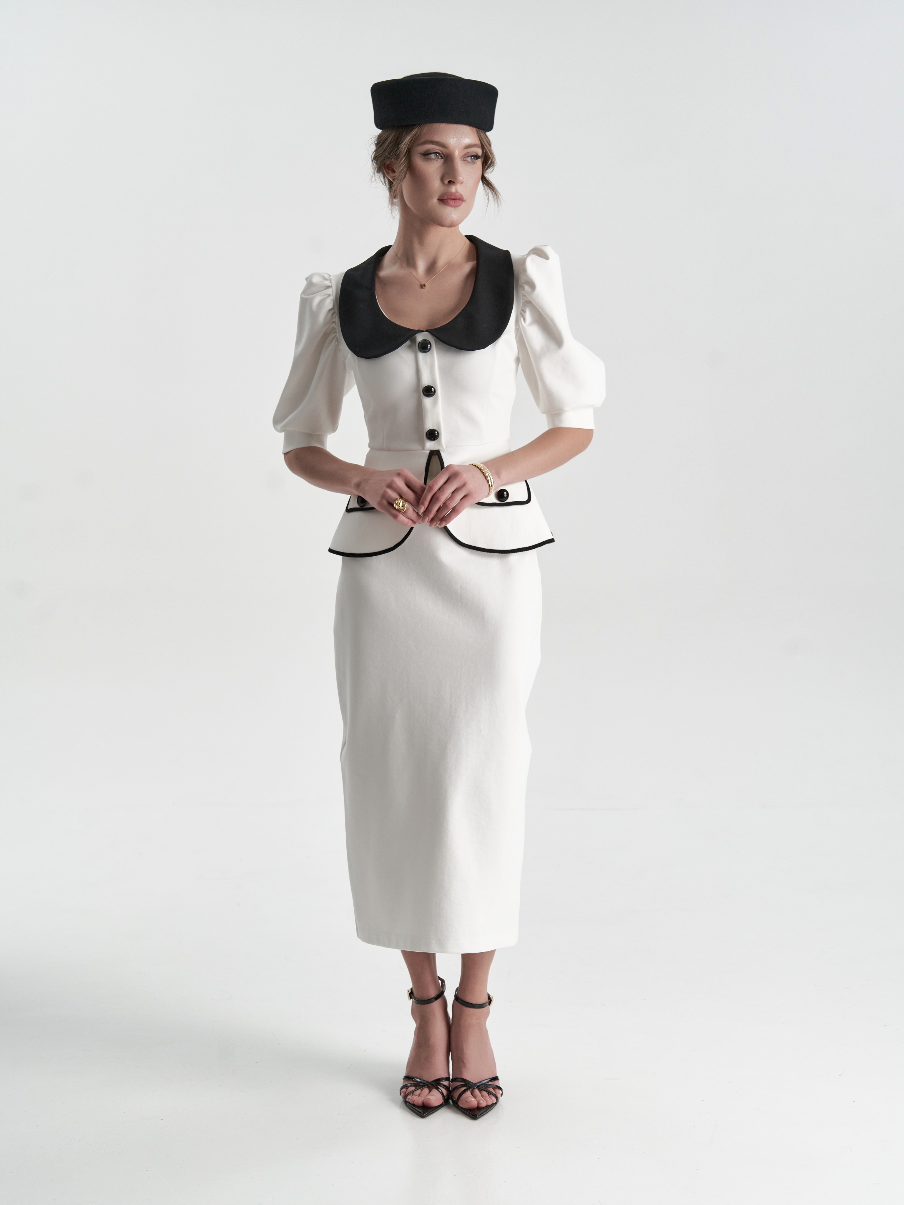 Жакет выполнен из светлой ткани и отличается элегантным кроем, подчеркивающим талию. Особенностью жакета является крупный контрастный воротник черного цвета, а также объемные рукава длиной до локтя, создающие современный и стильный образ. По линии талии расположена баска с черной окантовкой и черными пуговицами, что придаёт жакету винтажные нотки.